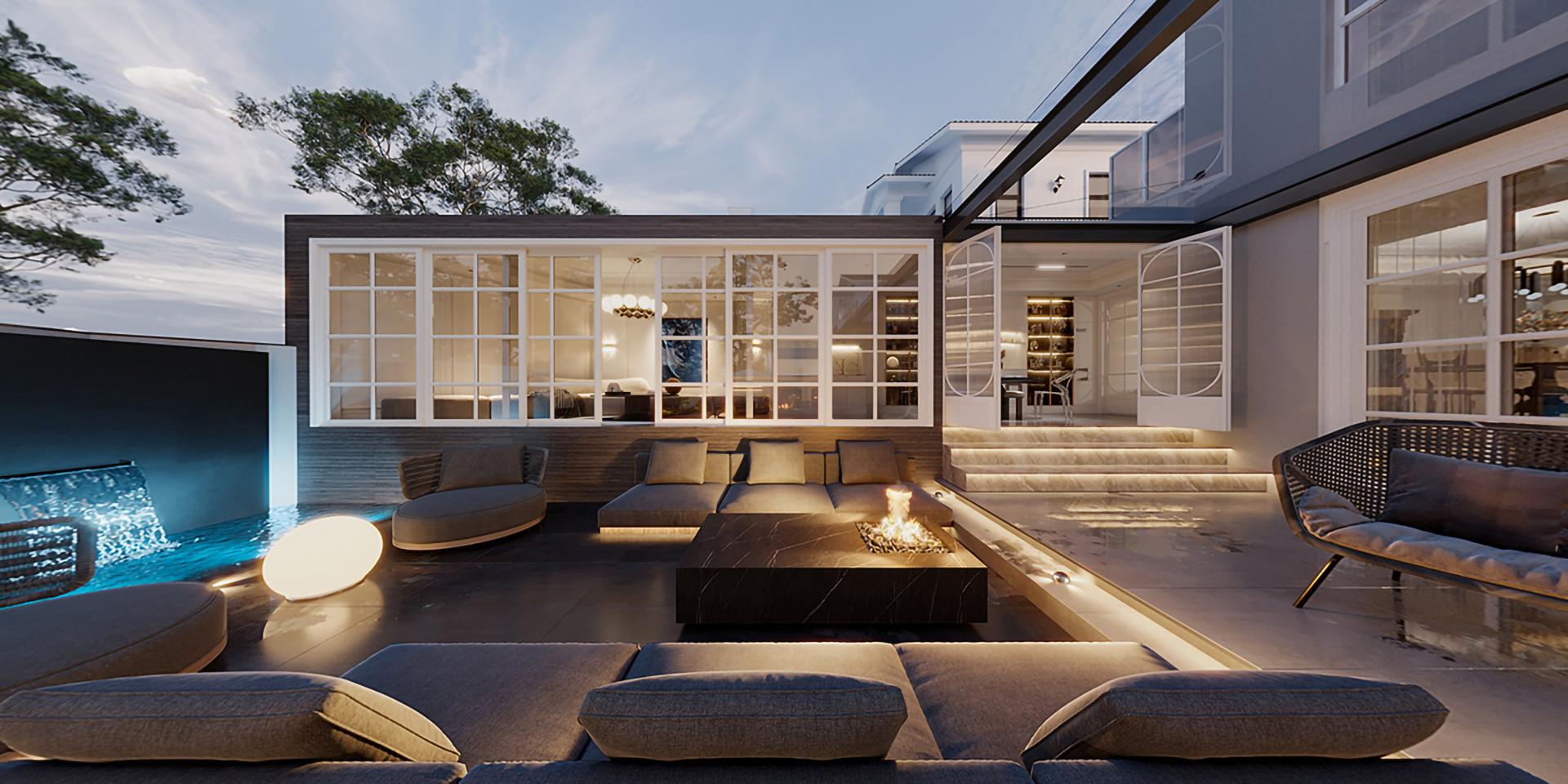 Gardens play a vital role in the charm of a French château. Water features and ambient lighting transform the garden from day to night, echoing the serenity of a moonlit evening. Along with the seamless indoor-outdoor transitions achieved by installation of extensive flexible sliding doors, a harmonious natural haven is brought indoors.