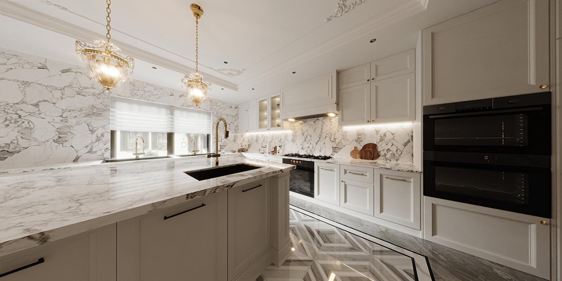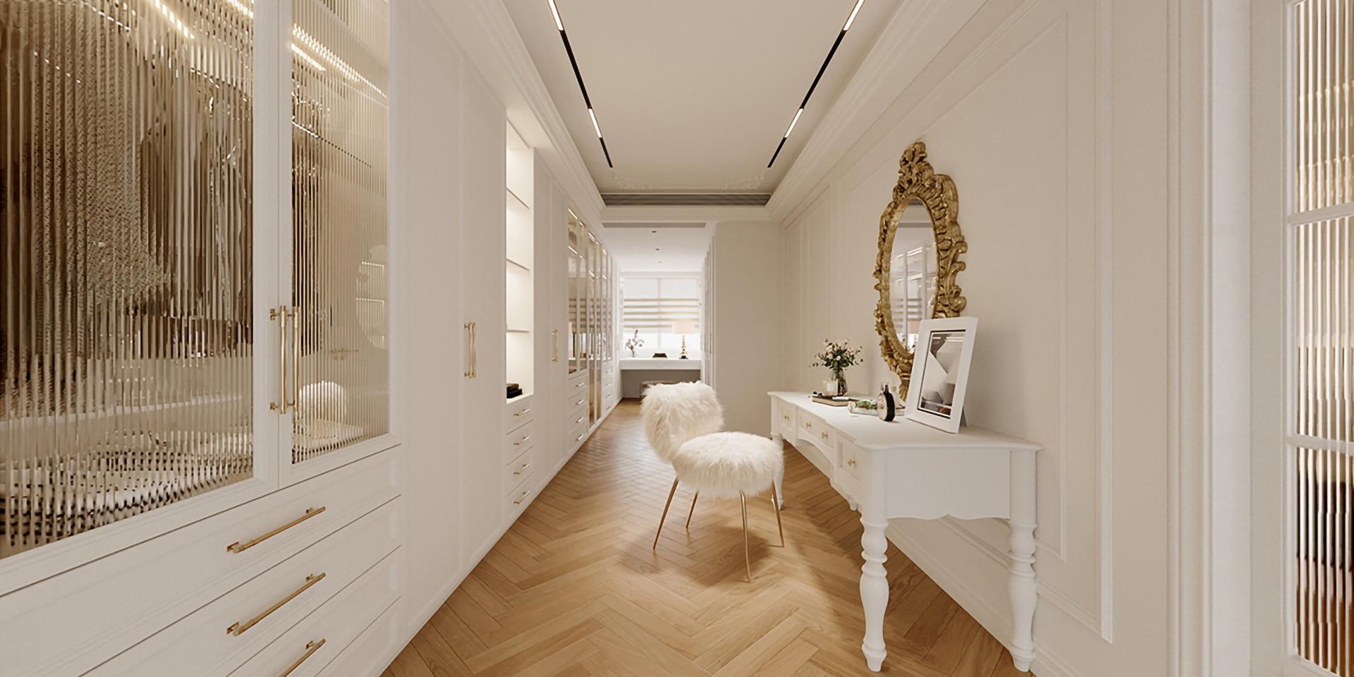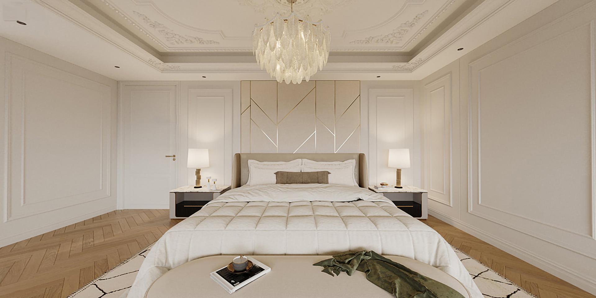The master bedroom stands as a luxurious sanctuary, blending comfort with high-end sophistication, again inspired by French château opulence. The king-sized bed serves as a serene centrepiece, while custom walk-in closets provide ample storage. Accent lighting and elegant décor contribute to an environment of tranquillity, akin to an evening under the stars in a grand château.