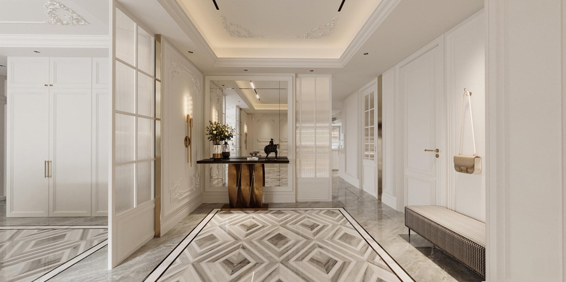 The foyer acts as a grand prologue, setting an opulent tone right at the entrance with majestic double doors and sophisticated flooring. The use of mirrors, glass, and strategic lighting, inspired by château opulence, further enhances the gleaming glamour, capturing visitors' attention like the opening chords of a symphony.