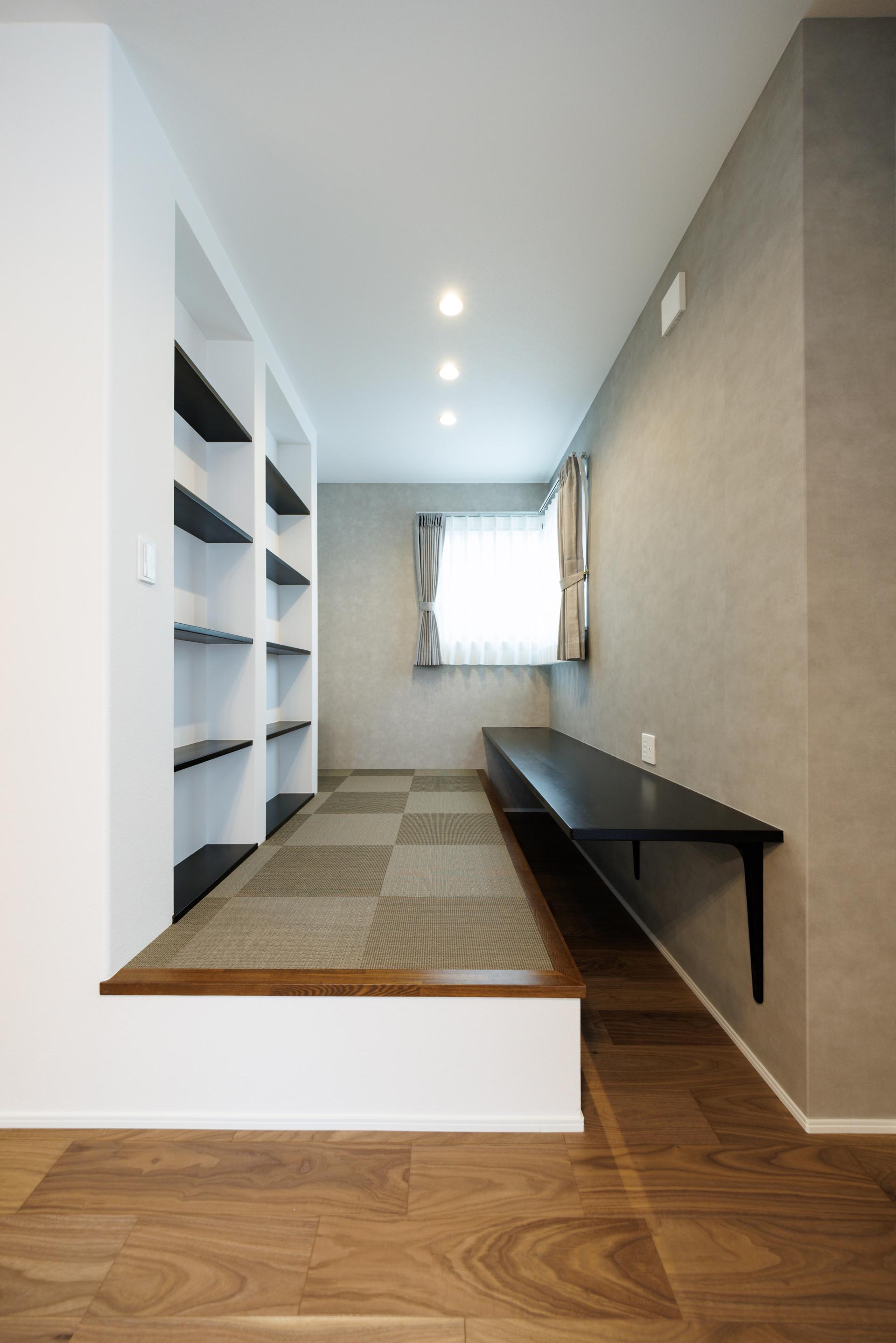 The interior space was designed with an awareness of the harmony that was achieved by combining wood and stone, and the raised area has been turned into a compact study space.