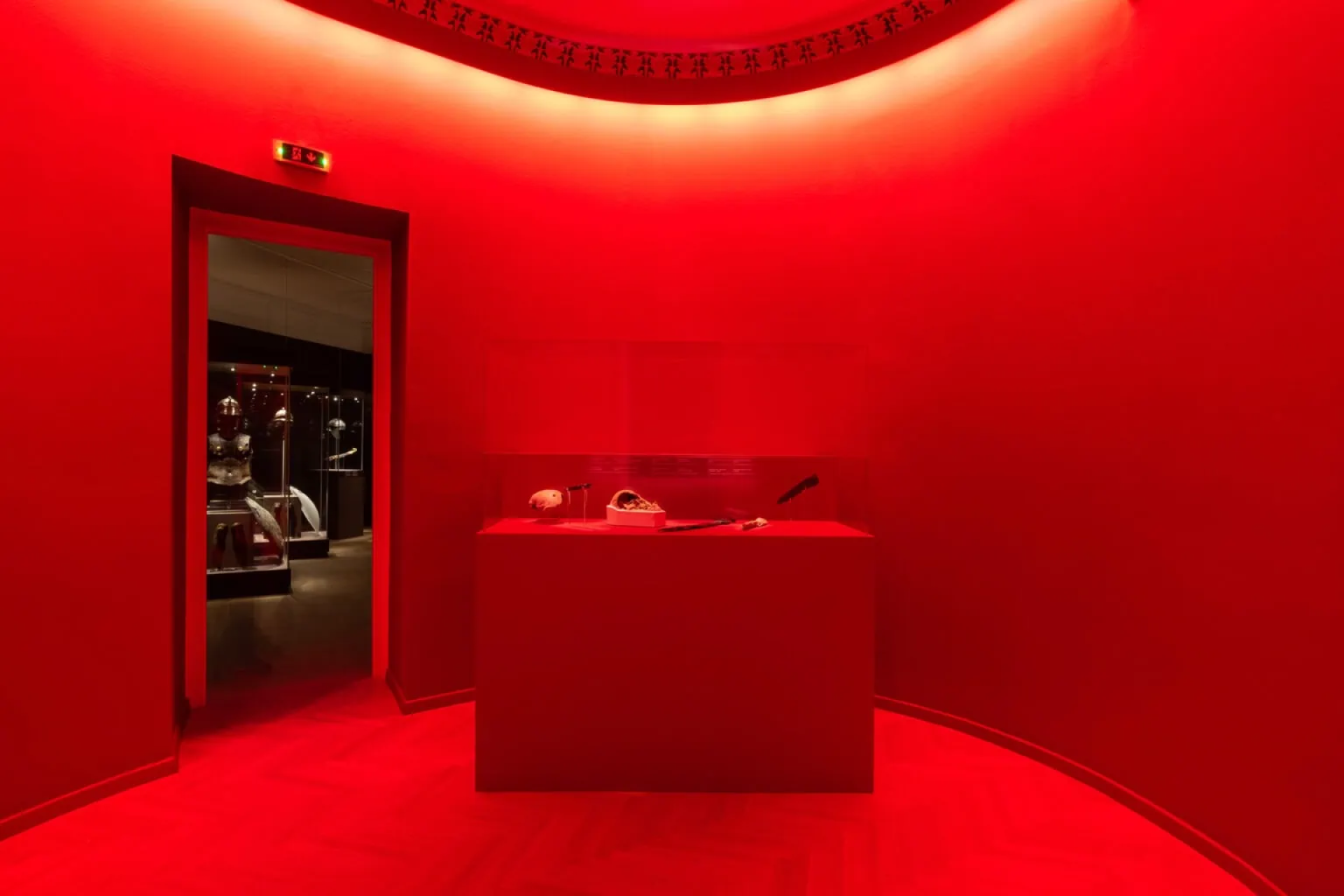 The two worlds collide in the red round room, where red perimeter LED lights graze the walls and a subtle pulse accompanies the unnerving soundscape. This temporary exhibition used the existing equipment of the museum and adaptations were made to fit the needs of the lighting design. The LED profiles used in the red round room, where specified RGBW rather than just red, so that they would also have a use in future exhibitions and form part of the museum's lighting kit.