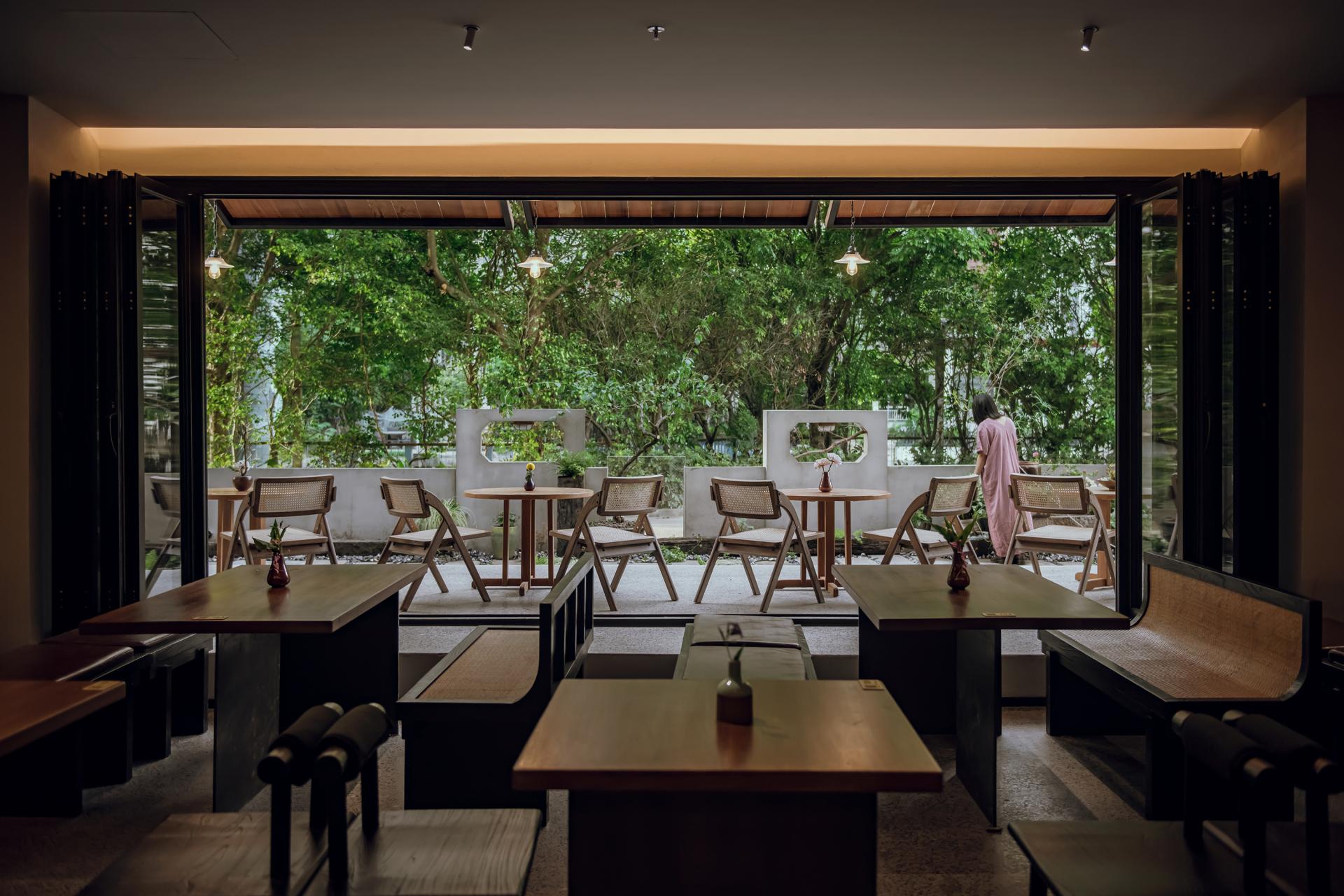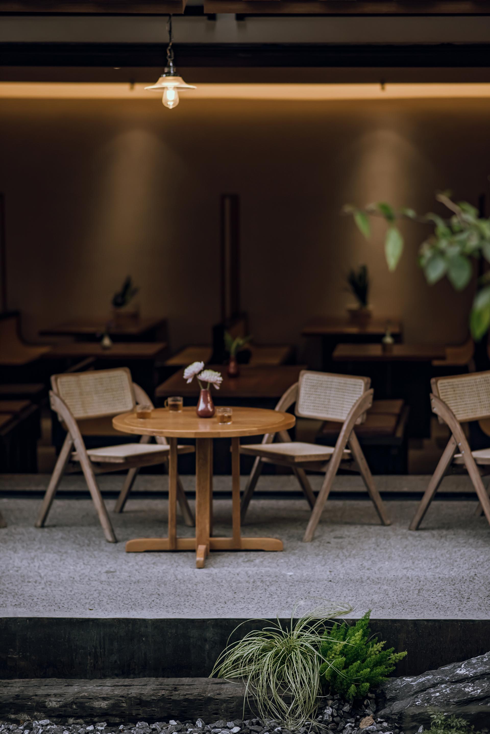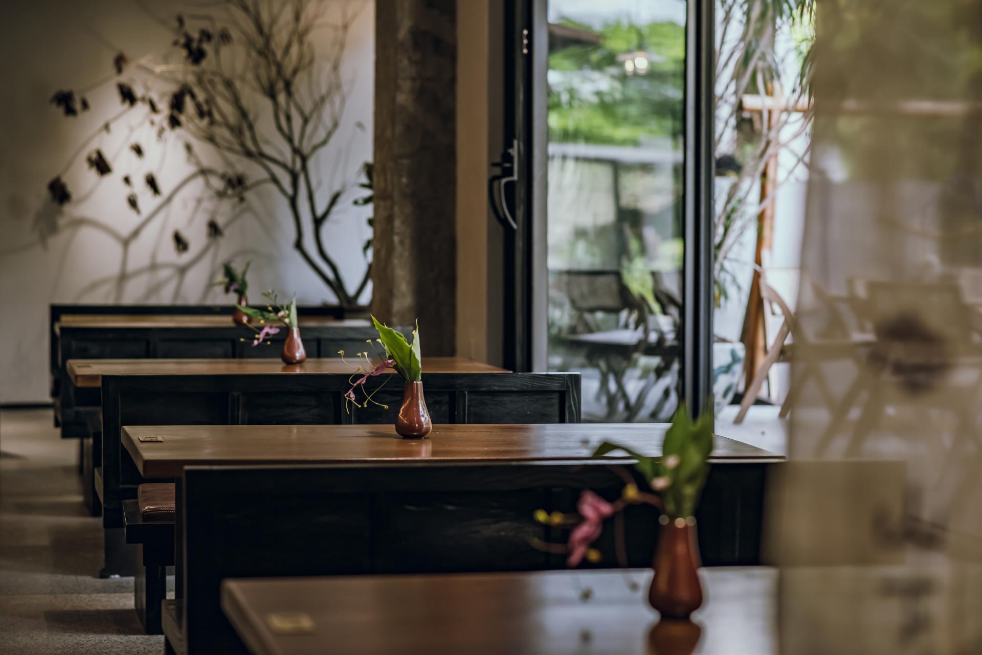 A natural and refreshing color palette is employed, with warm tones of wood dominating the furniture selection. Complemented by lush greenery and abundant natural light streaming through the windows, the space exudes a cozy and welcoming ambiance that beckons guests to unwind and savor their dining experience.