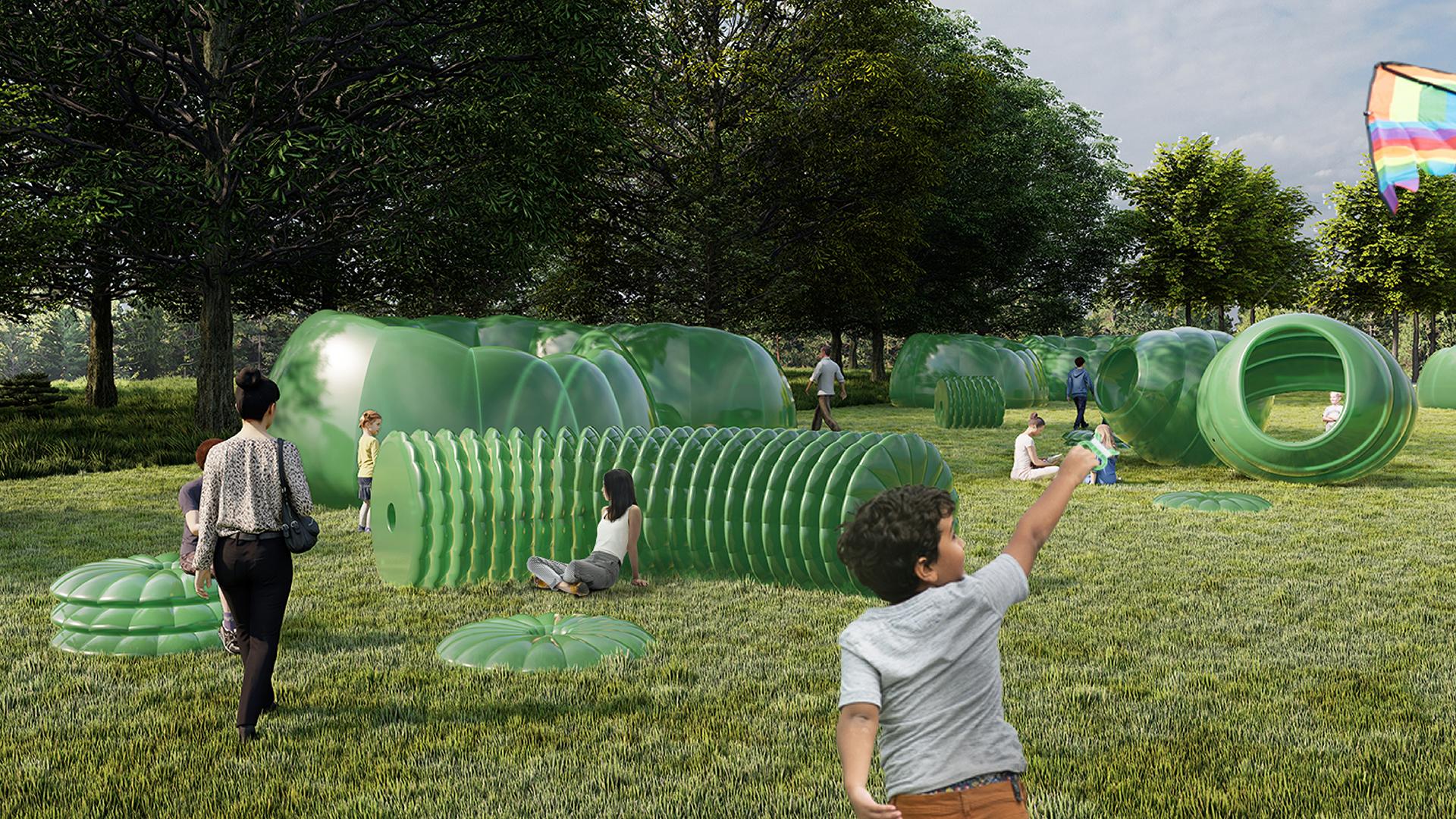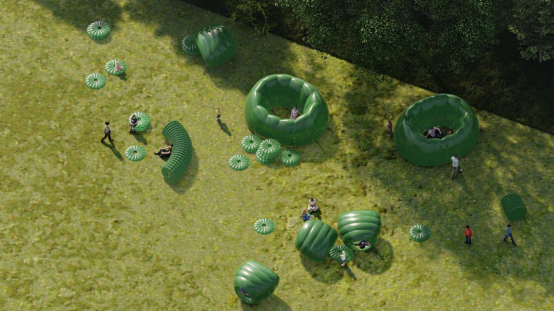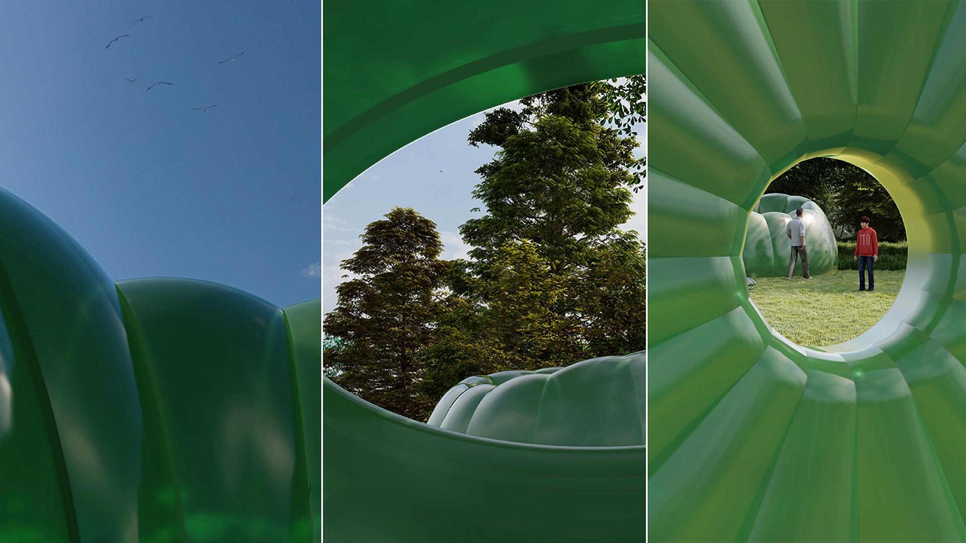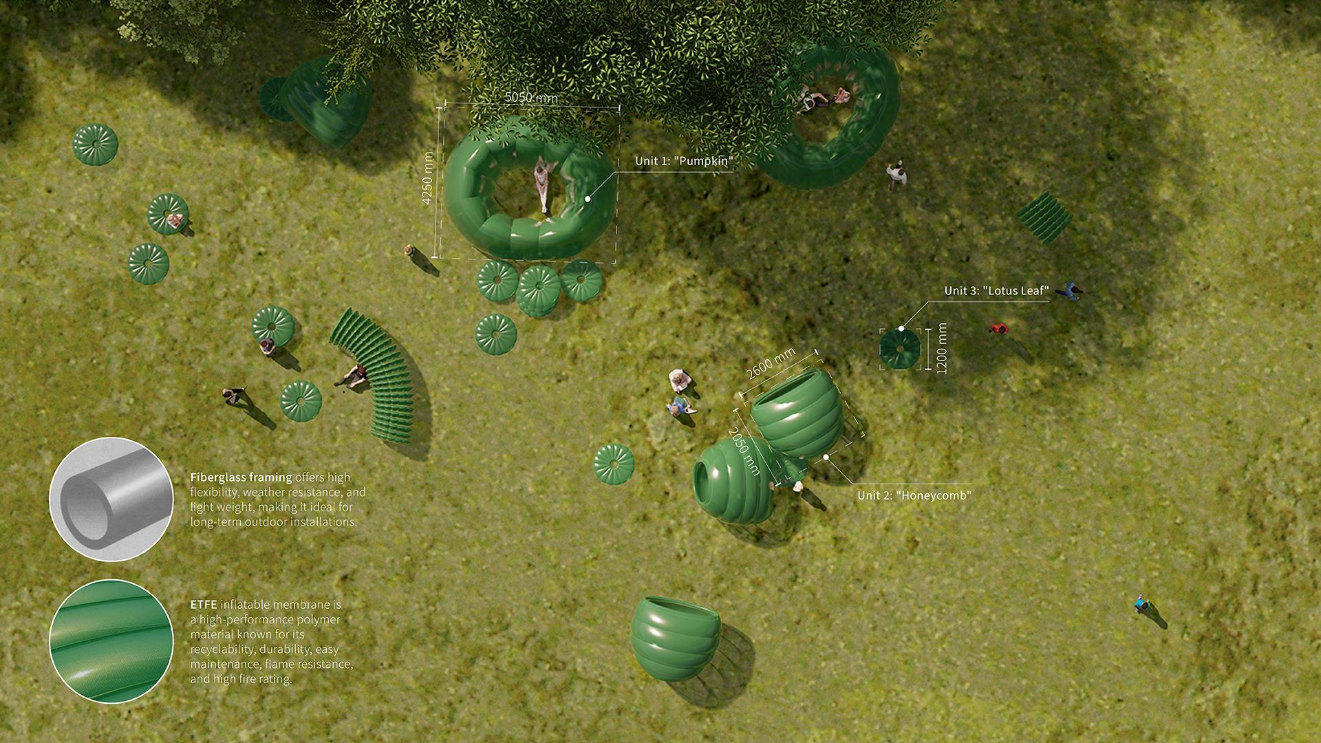 DIFFERENT LENS comprises three distinct units - “Pumpkin,” “Honeycomb,” and “Lotus Leaf”, which are all made primarily from ETFE inflatable membranes. Both the “Pumpkin” and “Honeycomb” feature internal fiberglass ribs for added stability, ensuring that the structures maintain their shape during interactions with people.