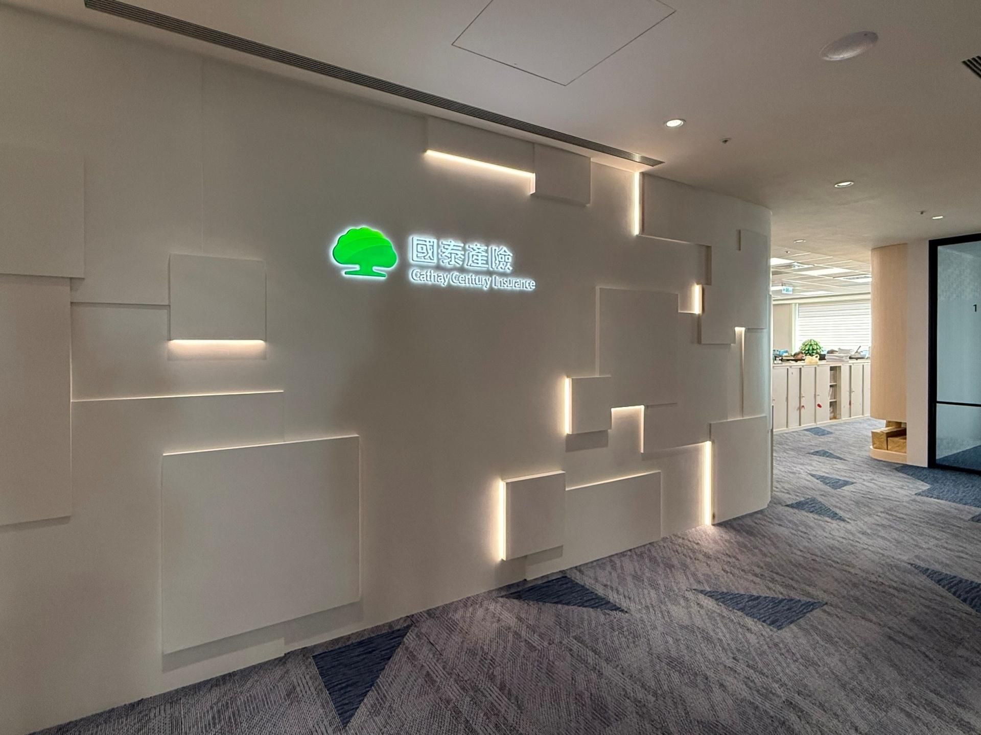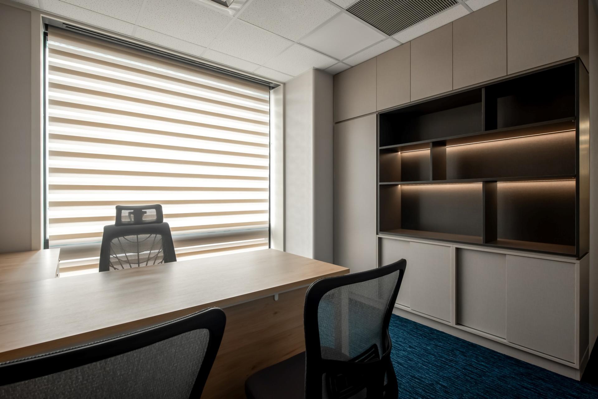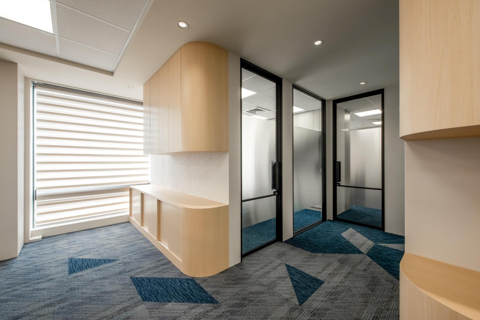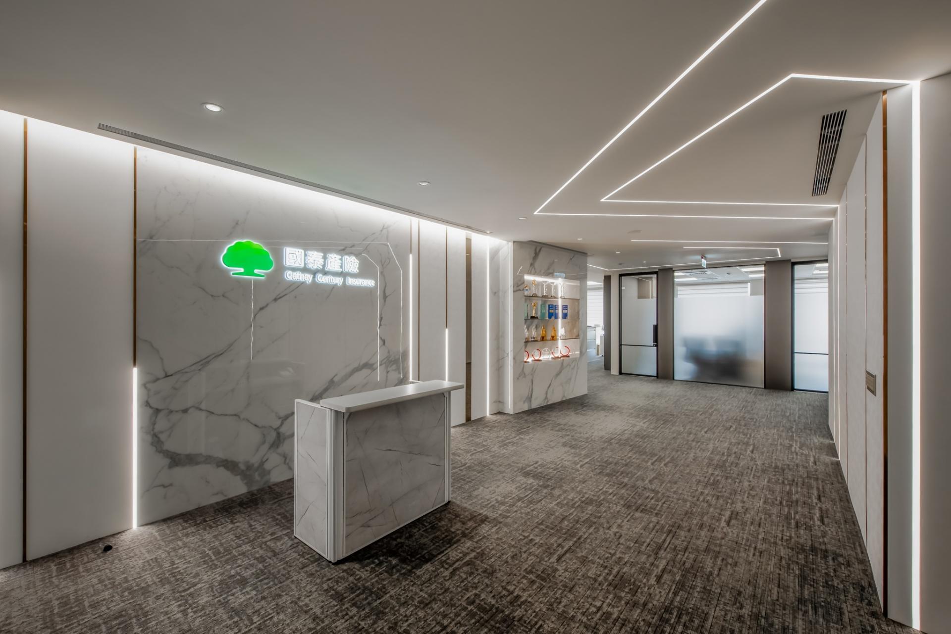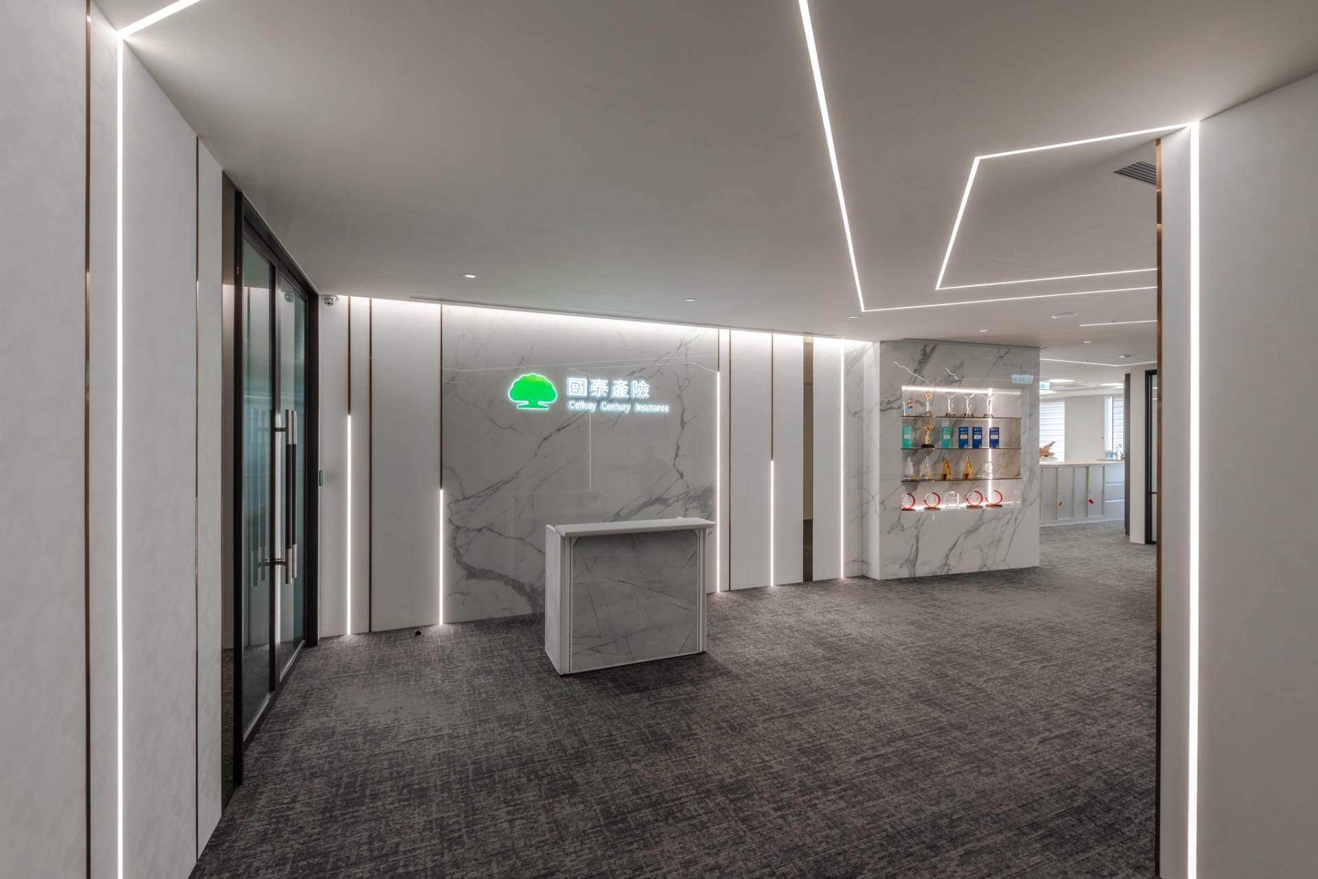 As the office of an insurance company, the overall design embraces geometric forms that introduce a sense of dynamism while maintaining a well-structured look, reinforcing a sense of professionalism. LED light strips guide the eye, casting a soft glow that gently diffuses the rigid office atmosphere.