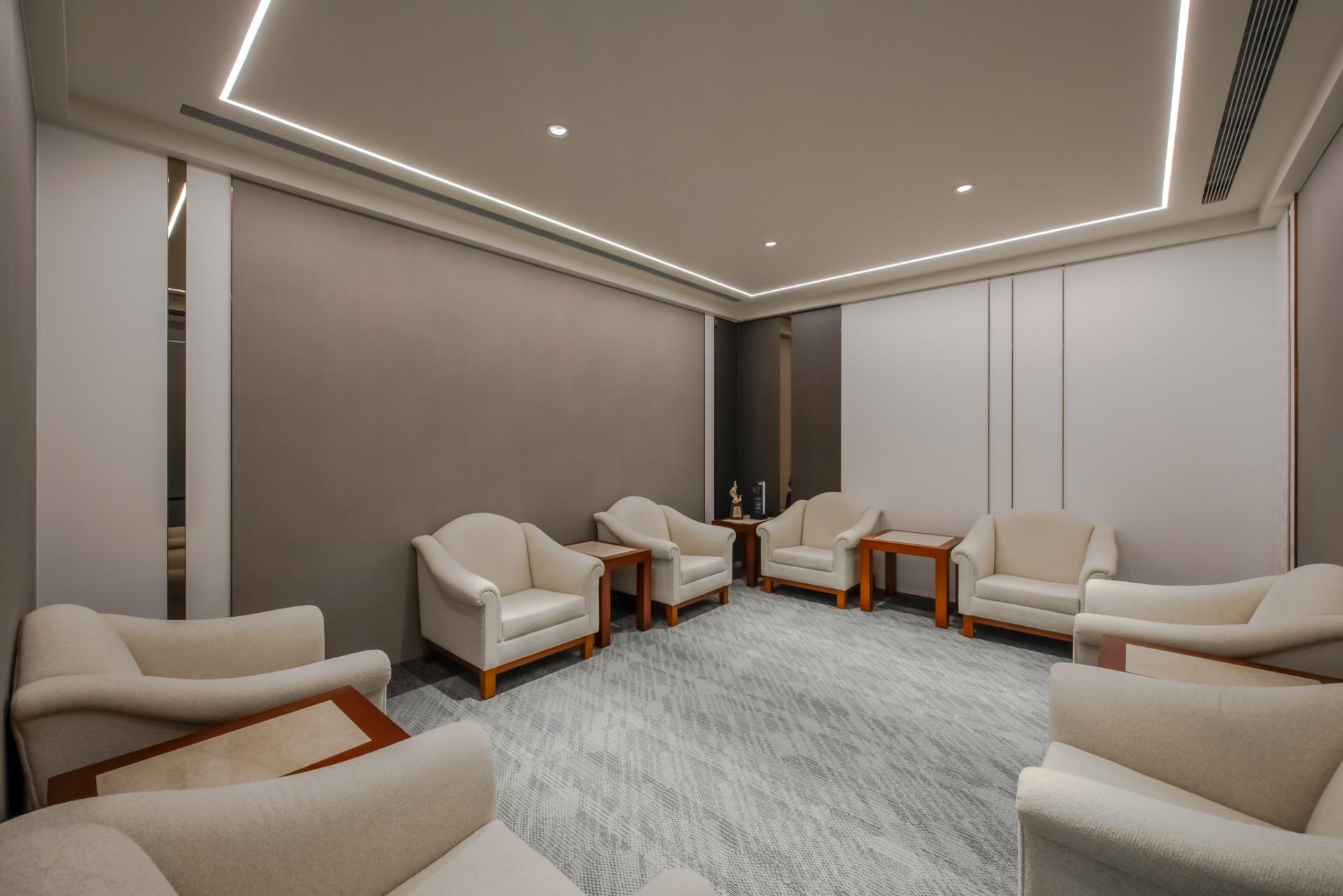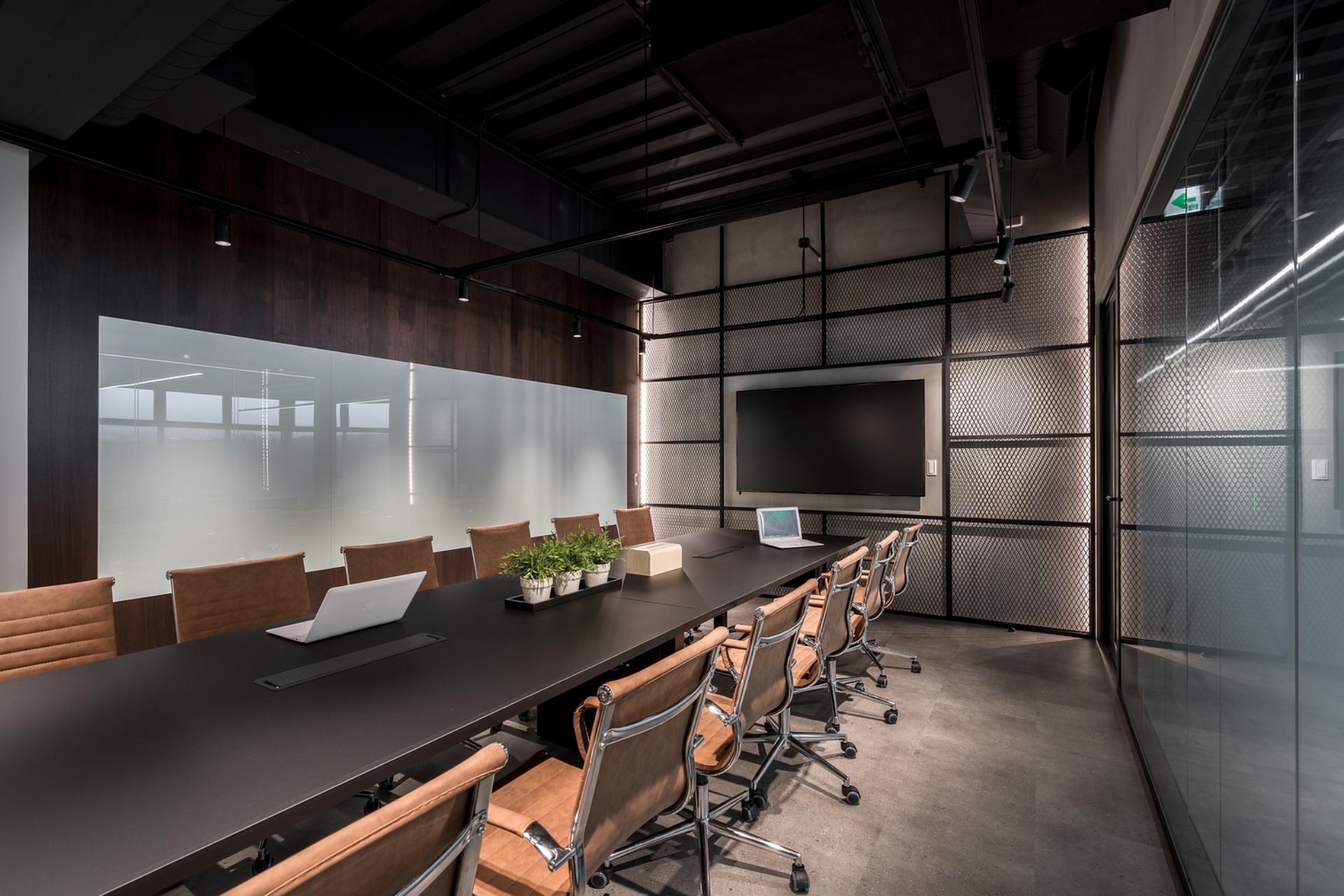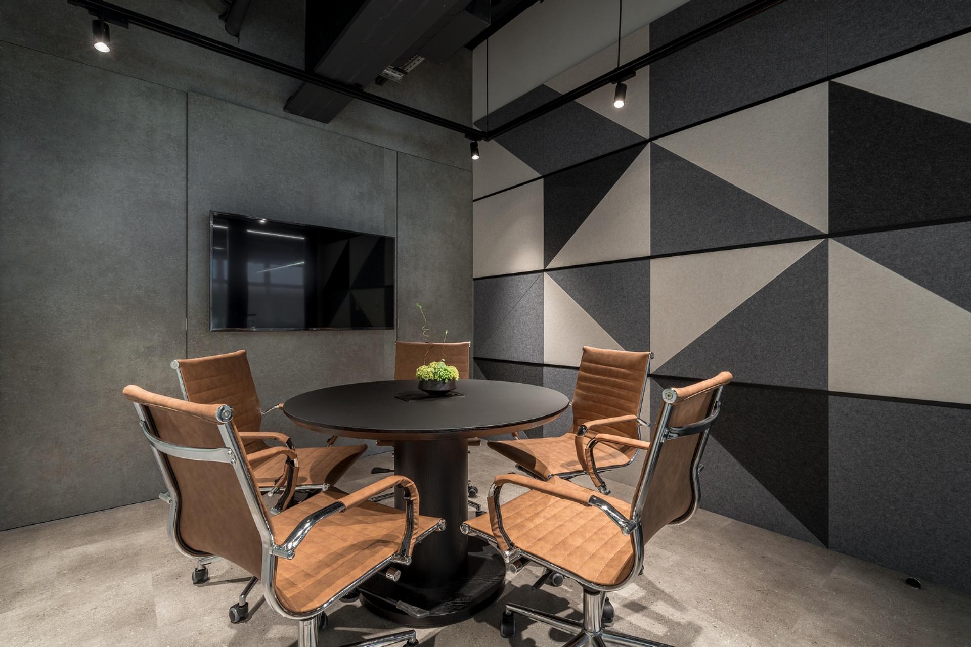 The large conference room embraces a refined industrial style with bold black and gray palettes. Perforated metal panels are installed on gray walls. This rugged yet stylish design injects lively energy, offsetting the dullness of a traditional meeting space. On the other hand, the small conference room breaks the monotony by playing with different shades of gray to convey a modern and sophisticated feel. Meanwhile, the executive meeting room boasts earthy tones, exuding a composed and calm atmosphere.