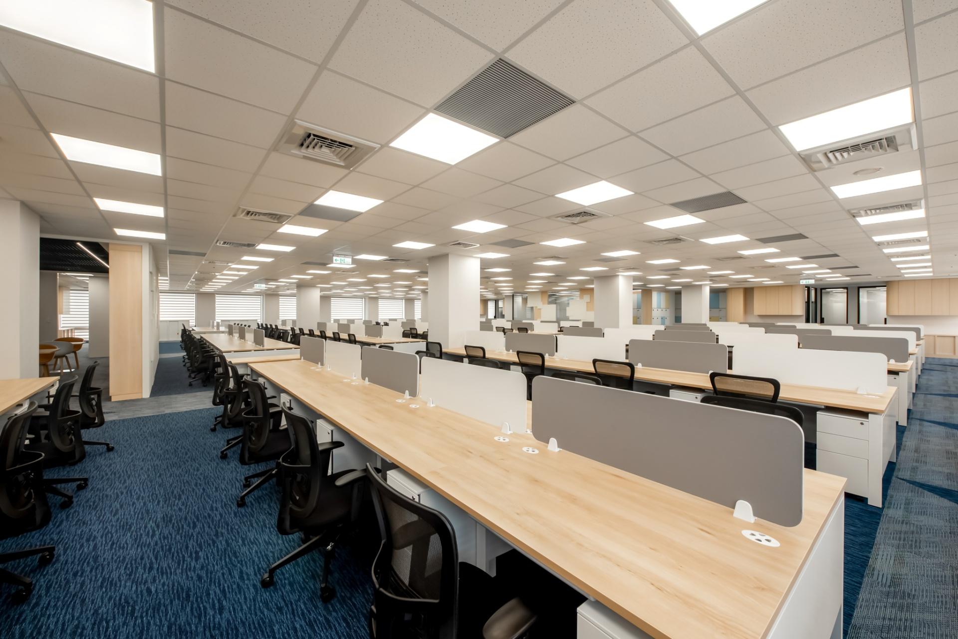 The open-plan office emphasizes simplicity and functionality, featuring dual-facing workstations that maximize spatial efficiency. The thoughtfully placed partitions balance collaboration with privacy. This well-structured environment enables the team to work with clarity and focus. The flooring is adorned with deep blue and gray carpets. Additionally, geometric patterns inject a touch of dynamic energy and visual interest.