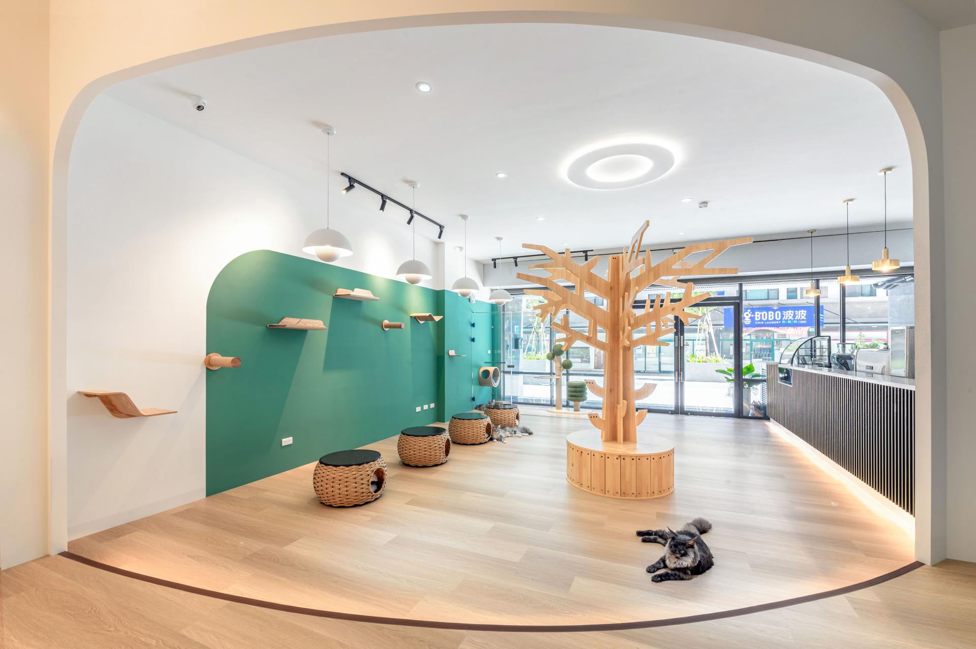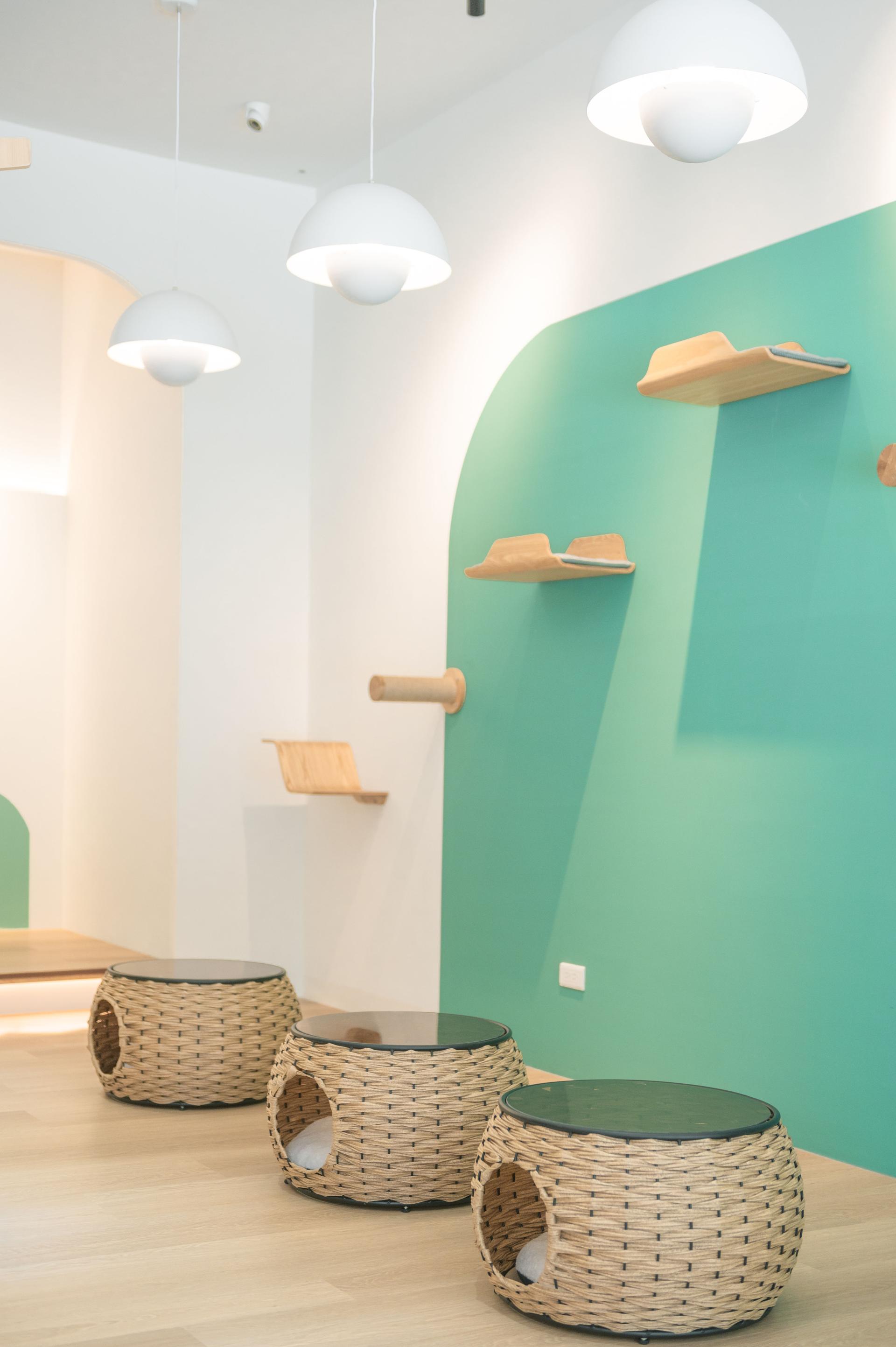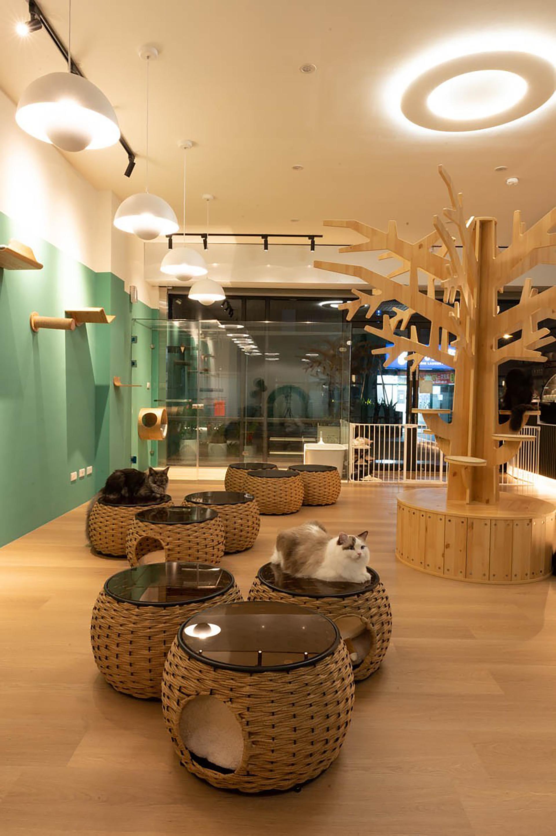 Reflecting a brand ethos of soothing and serenity, the design team artfully draws inspiration from nature’s comforting elements, infusing the ambiance with a tranquil forest essence that enriches the warm moments shared between guests and furry friends. Soft, amber lighting enhances the tactile allure of natural wood, woven rattan, and green coating, creating an inviting backdrop for these gentle interactions. This urban oasis invites guests into a playful haven where human and feline lives blend seamlessly. Floor seating brings guests closer to a cat’s-eye view, enhancing their connection with furry friends. This carefully crafted space embodies the café’s vision of harmonious coexistence between people, animals, and the environment, creating a sanctuary where city dwellers find solace and connection.