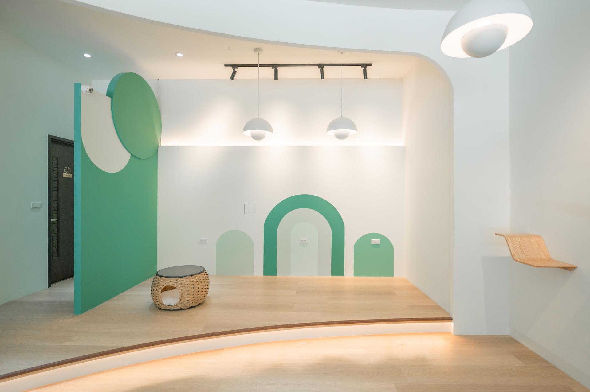 This project embraces a minimalist design, featuring a palette of soft whites and natural wood tones, accented with expansive touches of vibrant green that compose a poetic sense of verdant tranquility. Warm yellow lighting softly flows throughout, with pendant fixtures illuminating the bar counter and dining area, circular lights casting a gentle glow over the central cat tree, and indirect lighting discreetly placed beneath cabinetry and steps, providing guidance and safety markers. The lighting design emulates the subtle shifts of natural light, crafting an atmosphere that captures the essence of the outdoors with contemporary elegance.
