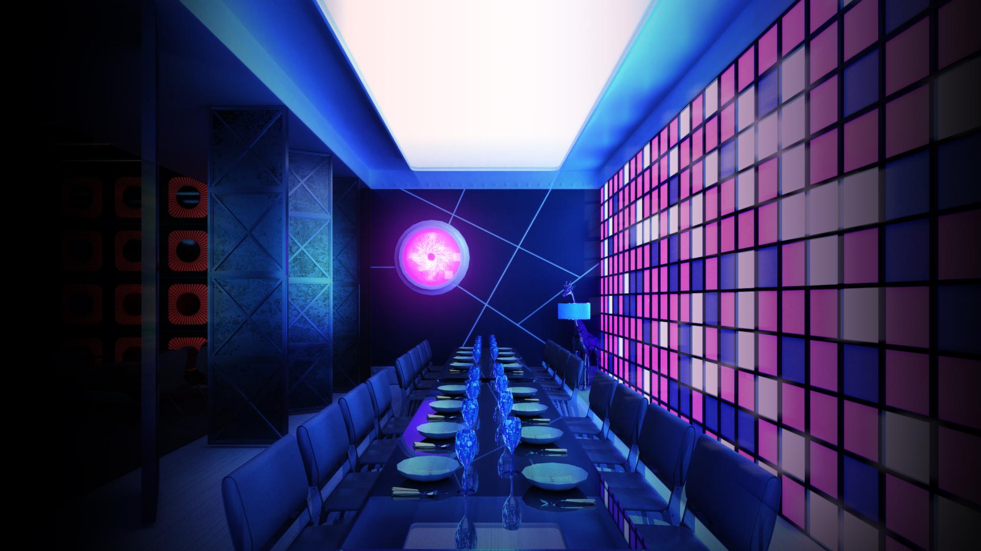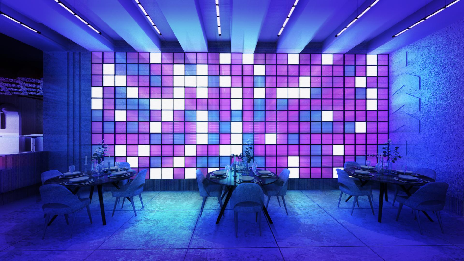The experience begins through a discreet kitchen-style door in the restaurant’s dining room, leading guests to a bar situated between two buildings. Here, polished concrete, stainless steel, and glowing neon lighting set an edgy, urban tone. From the bar, a dimly lit tunnel guides visitors to the speakeasy, which serves as the heart of the venue. This space features a secondary bar surrounded by light panels that display ever-changing patterns, glowing effects, or even interactive games like Tetris. The dining area includes a private room separated by pivot doors, allowing flexibility for group gatherings. The programmable lighting throughout creates a shifting ambiance of colors, reflections, and shadows, ensuring a constantly evolving experience.