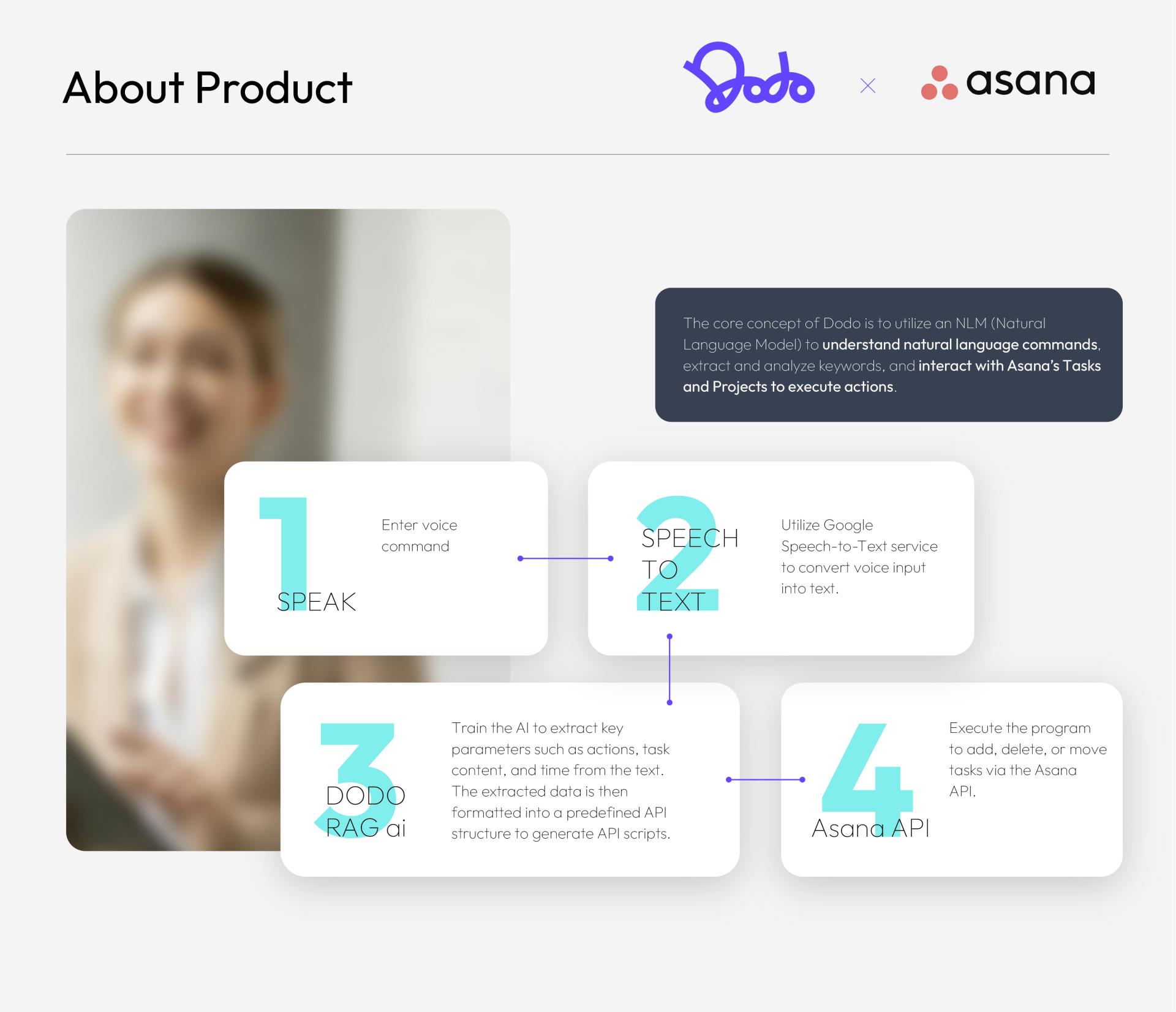 The core concept of Dodo is to utilize an NLM (Natural Language Model) to understand natural language commands, extract and analyze keywords, and interact with Asana’s Tasks and Projects to execute actions.