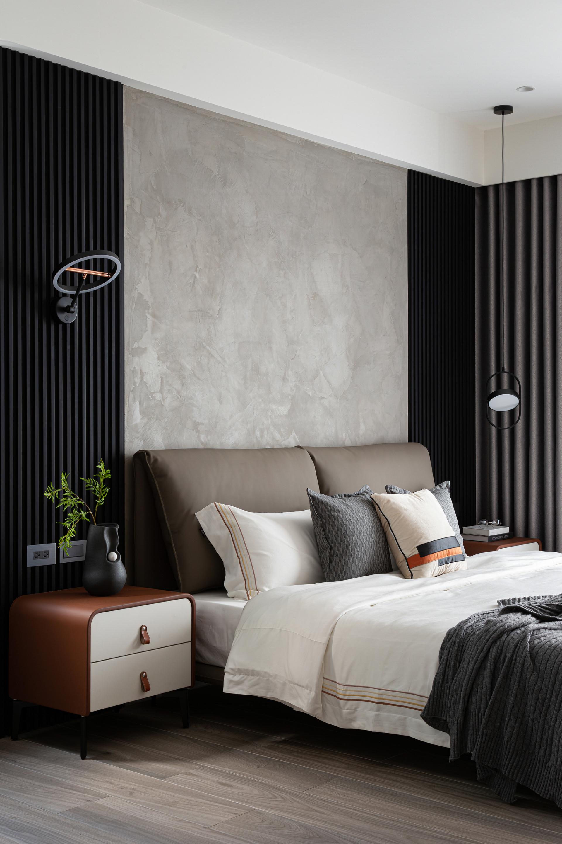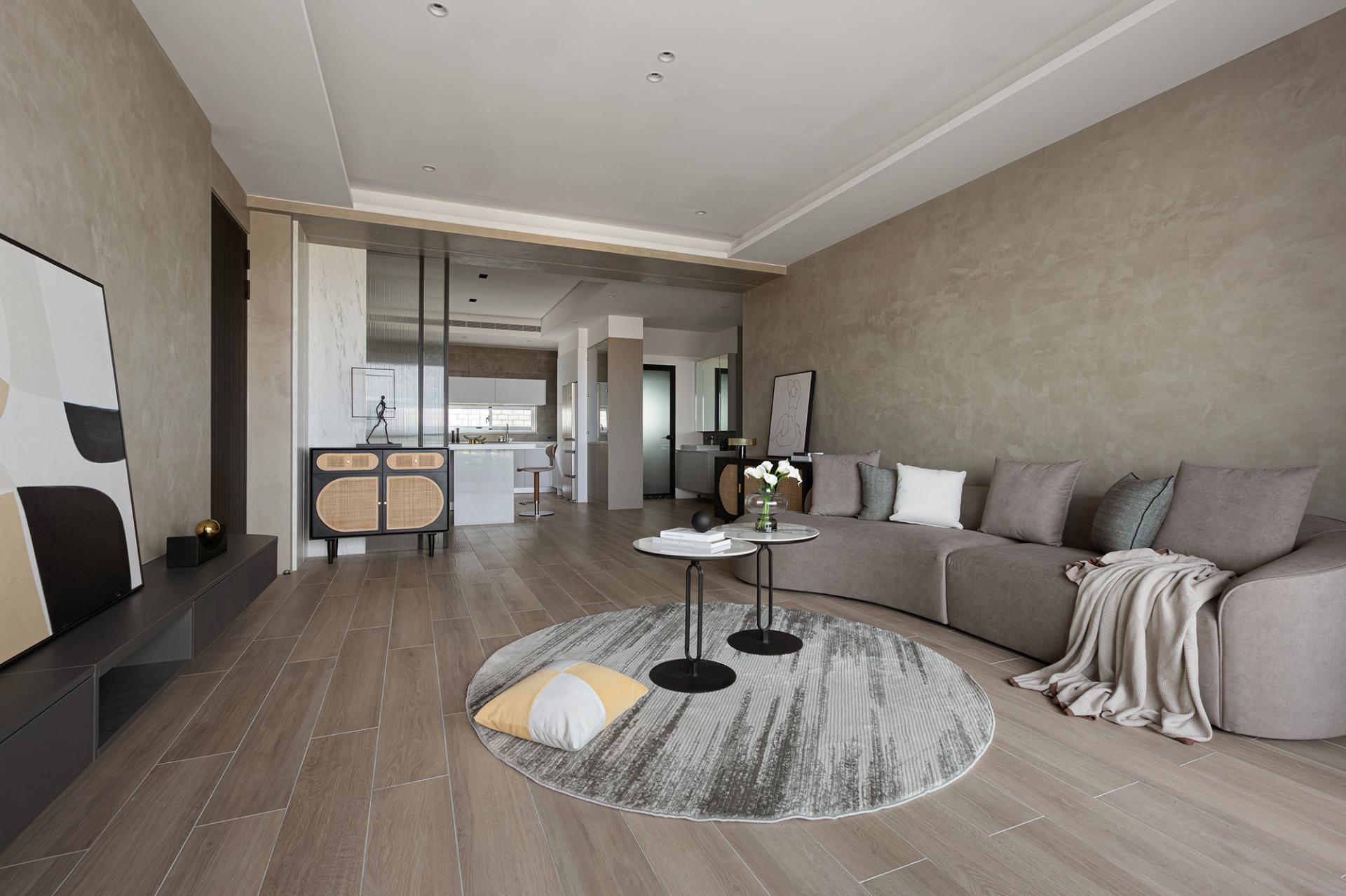 In the living area, the TV wall and the backdrop of the sofa feature a refined beige-gray artistic finish, presenting a striking visual contrast against the warm wooden flooring. This blend evokes a rustic charm while preserving a contemporary touch. The dining and kitchen spaces are designed with practicality in mind, incorporating walls and surfaces made from easy-to-clean materials that seamlessly combine beauty and function. This design philosophy ensures that the environment is both comfortable and aesthetically pleasing, as well as efficient for daily living.