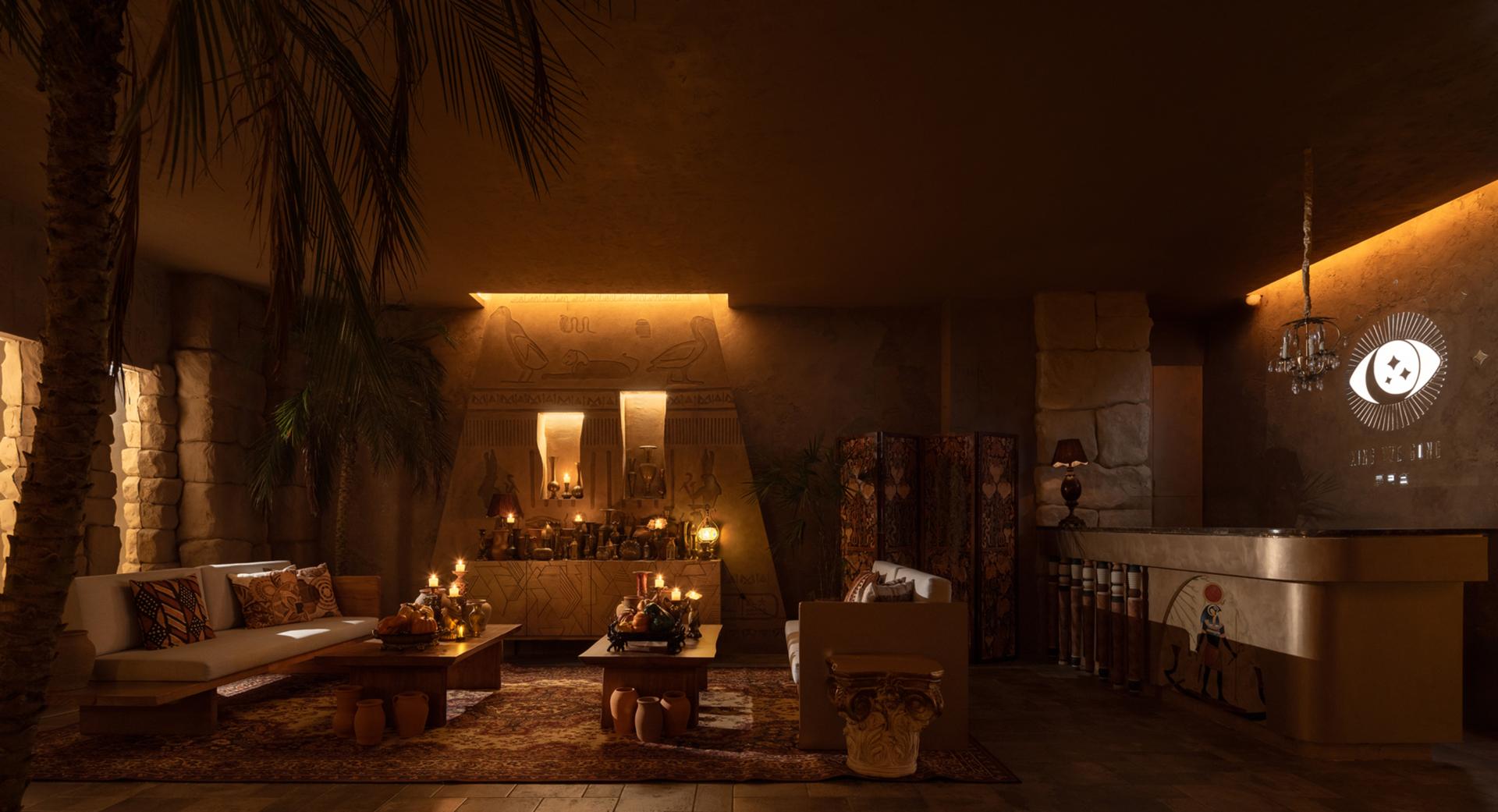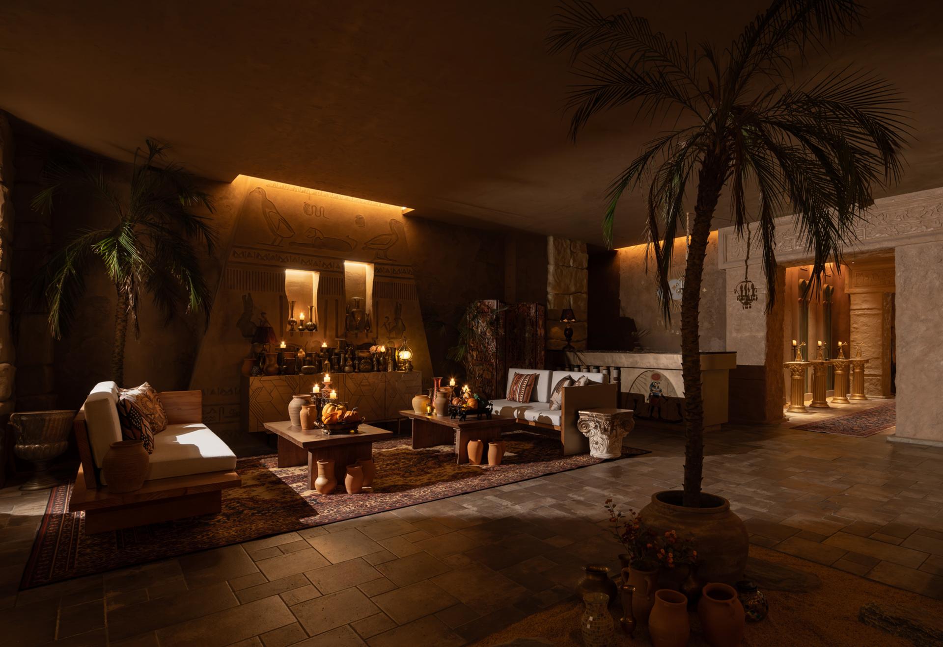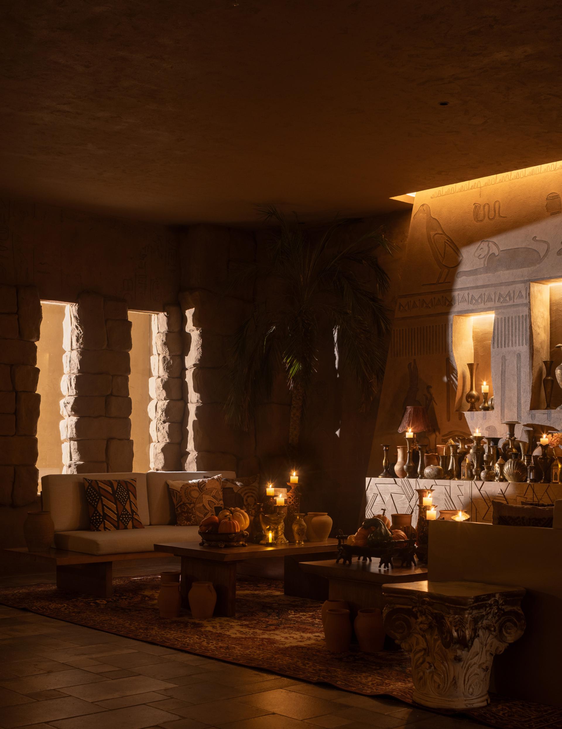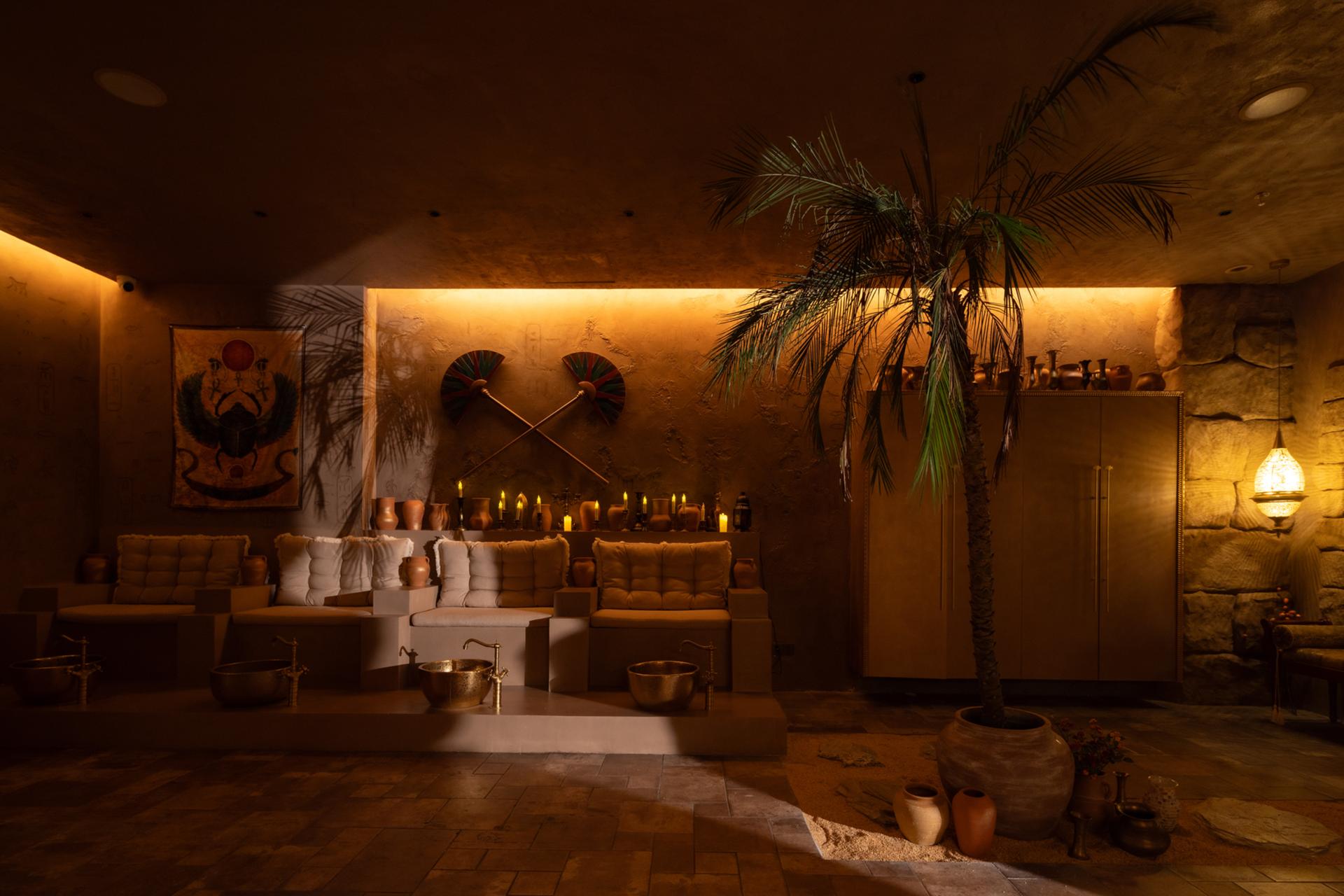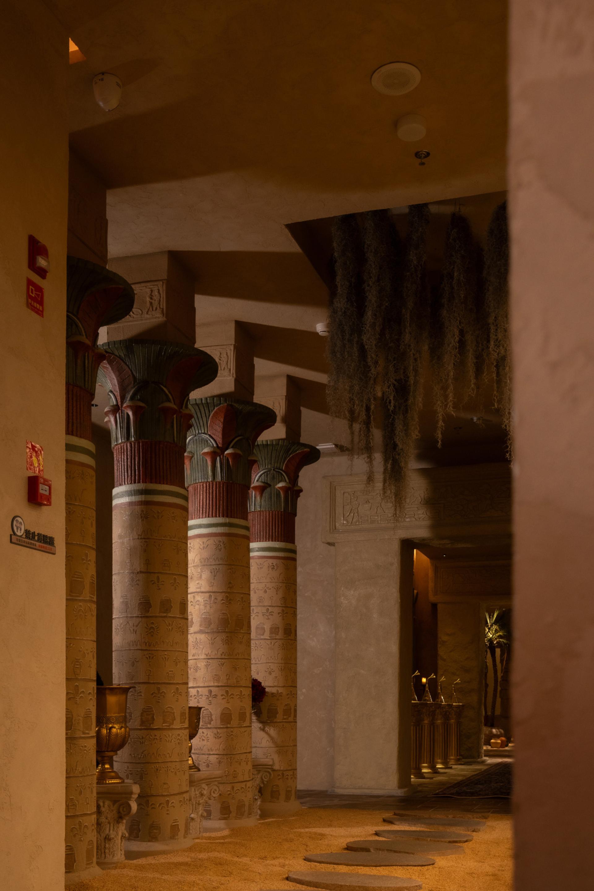 The main colors are gold and orange, creating a luxurious and warm atmosphere. Exposed stones. In order to restore the real sense of touch, the soft decoration team purchased hundreds of ancient bronzes and pottery pots, showing the unique charm of ancient craftsmanship. Exquisite candlestick lamps emit soft light and shadow, further rendering the mystery of the space. Acupuncture and palms add a touch of natural vitality to the space, making the overall environment full of the richness of ancient Egyptian culture.