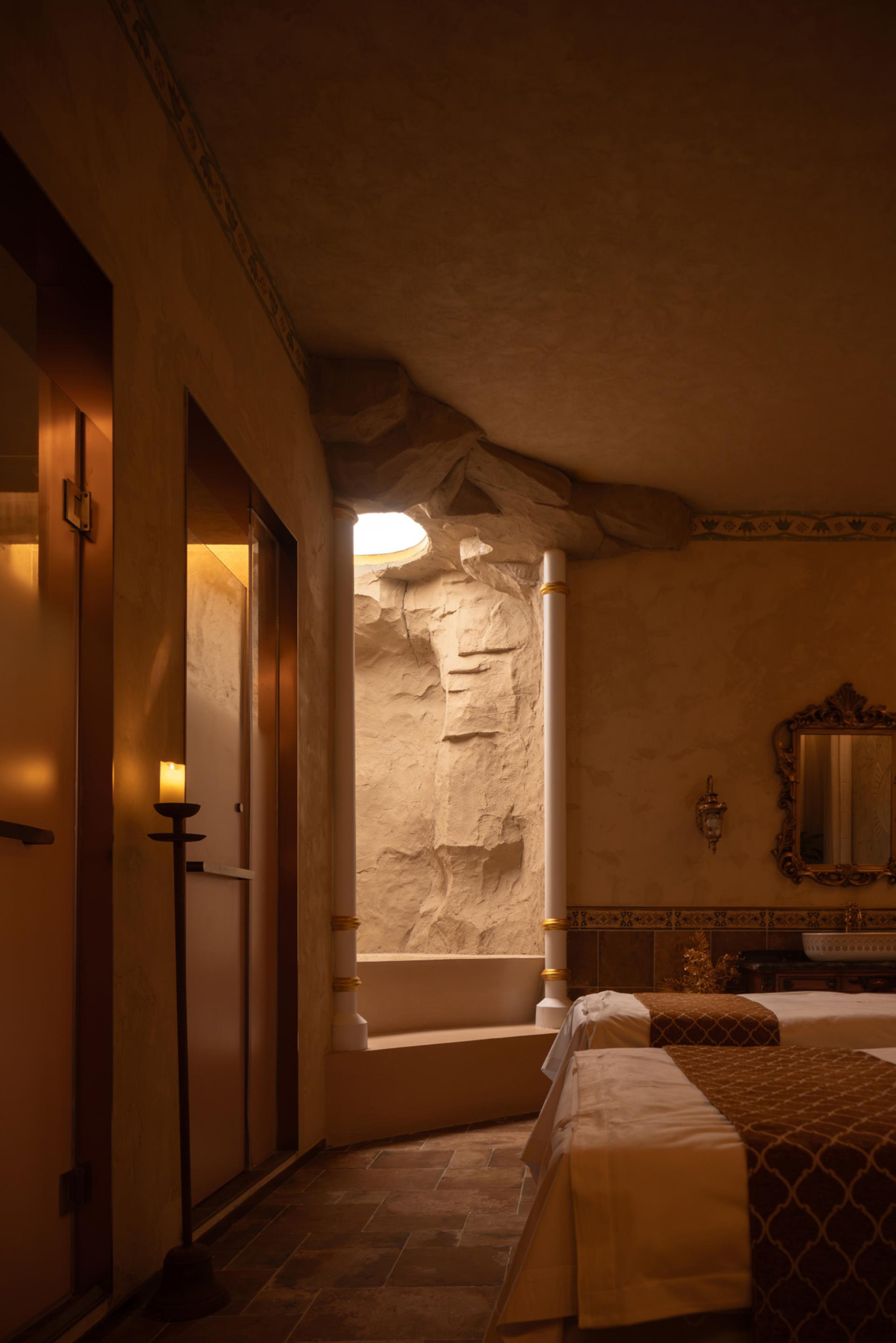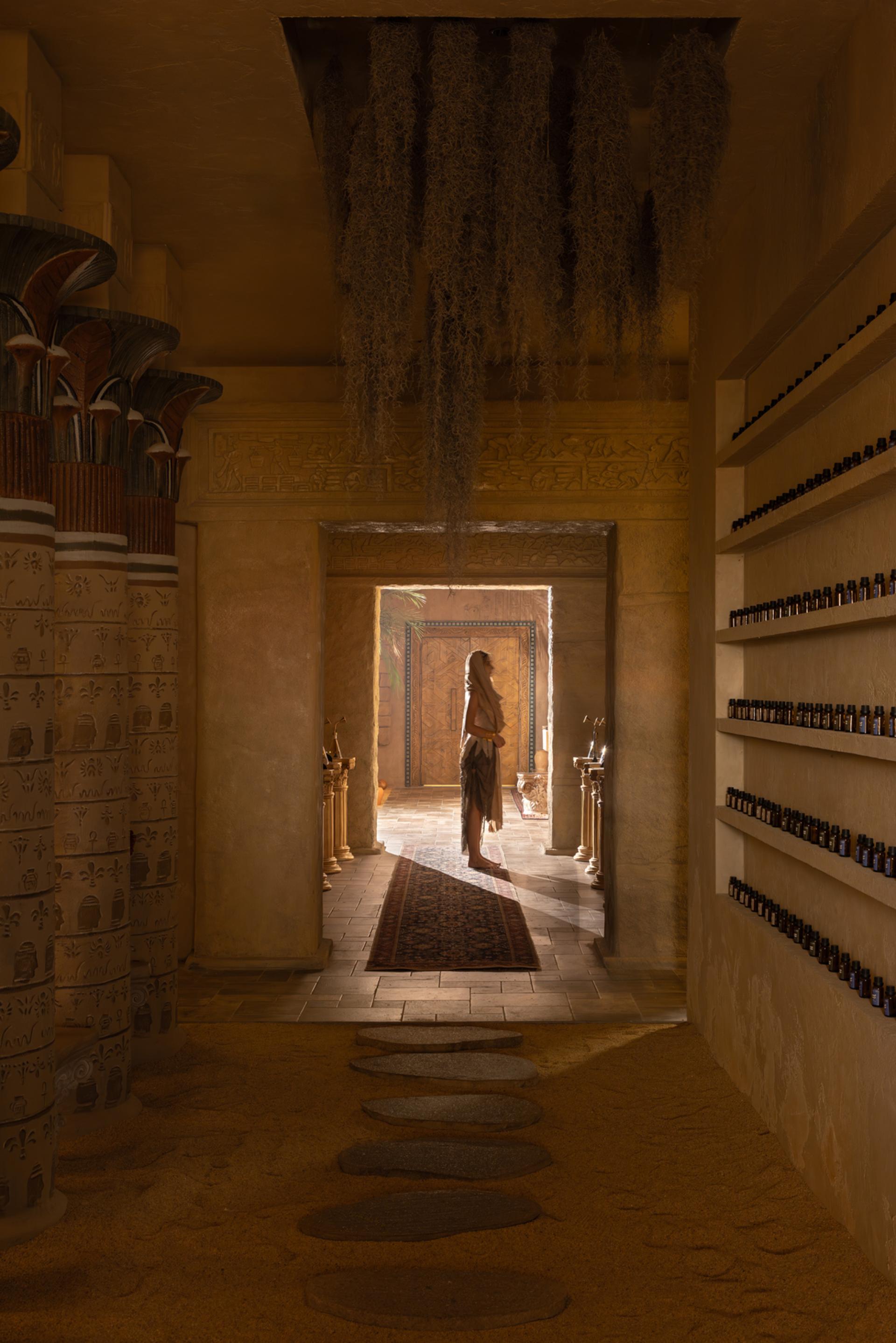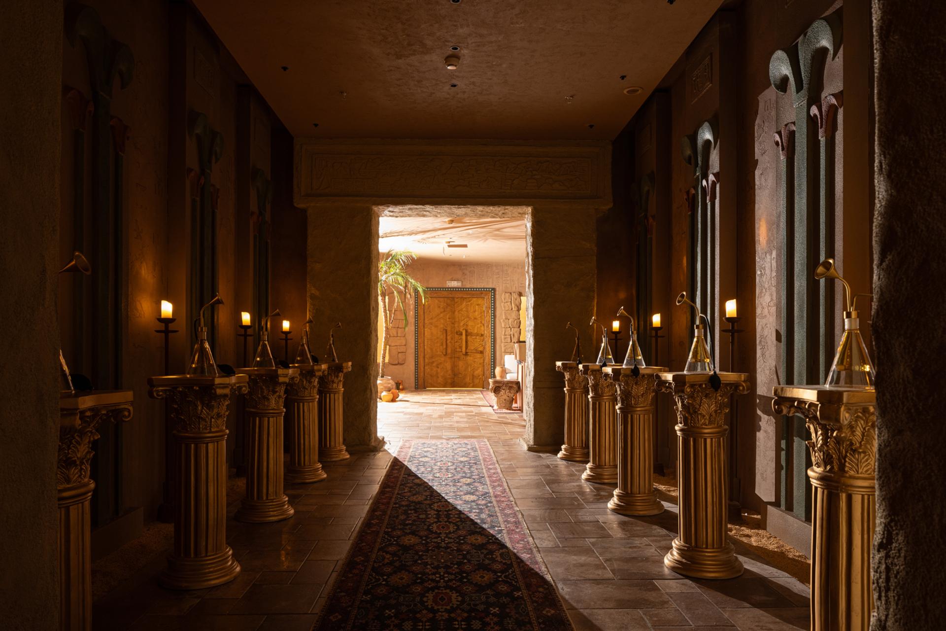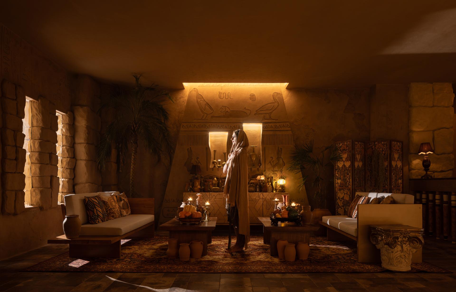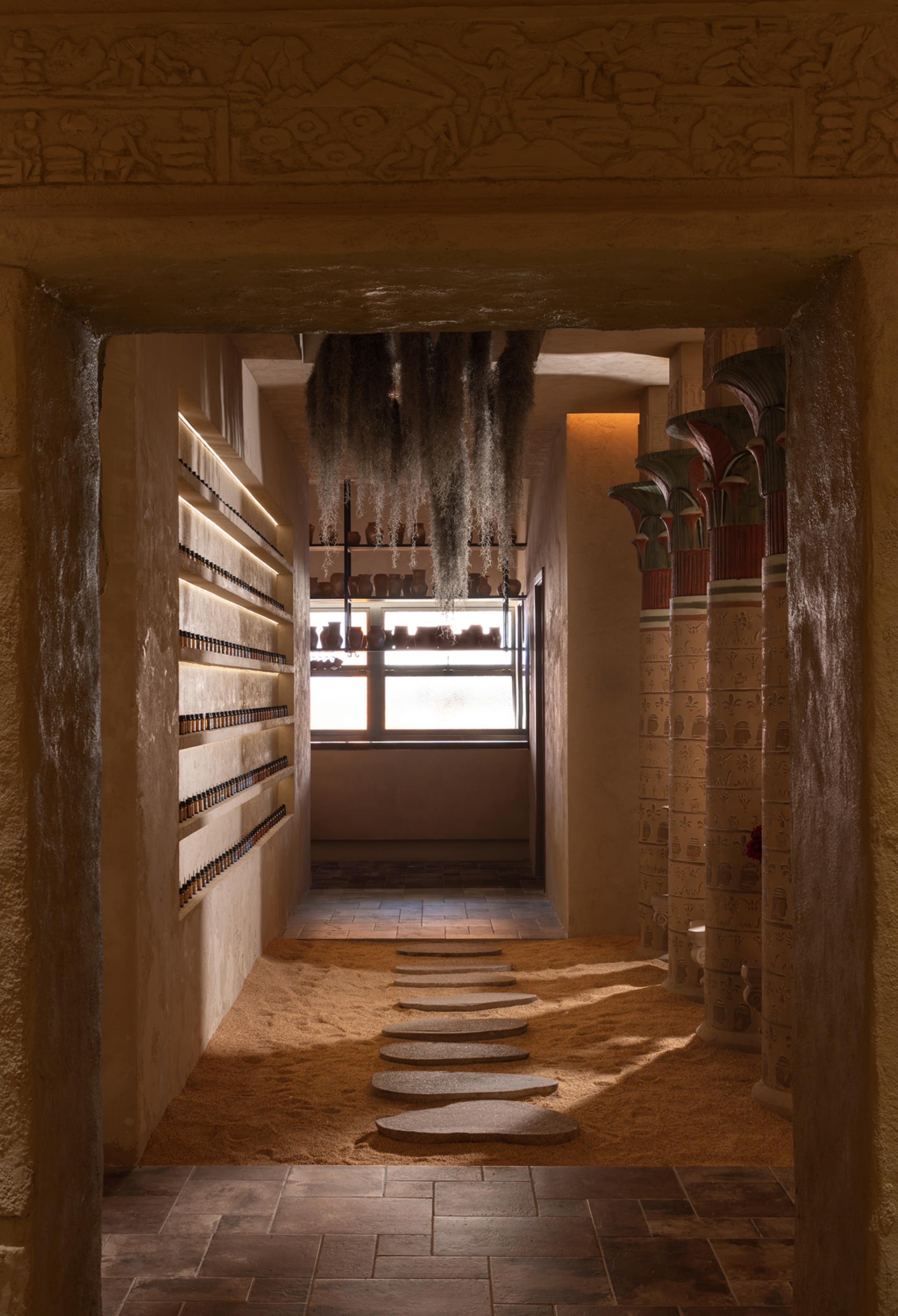 The main colors are gold and orange, creating a luxurious and warm atmosphere. Exposed stones. In order to restore the real sense of touch, the soft decoration team purchased hundreds of ancient bronzes and pottery pots, showing the unique charm of ancient craftsmanship. Exquisite candlestick lamps emit soft light and shadow, further rendering the mystery of the space. Acupuncture and palms add a touch of natural vitality to the space, making the overall environment full of the richness of ancient Egyptian culture.