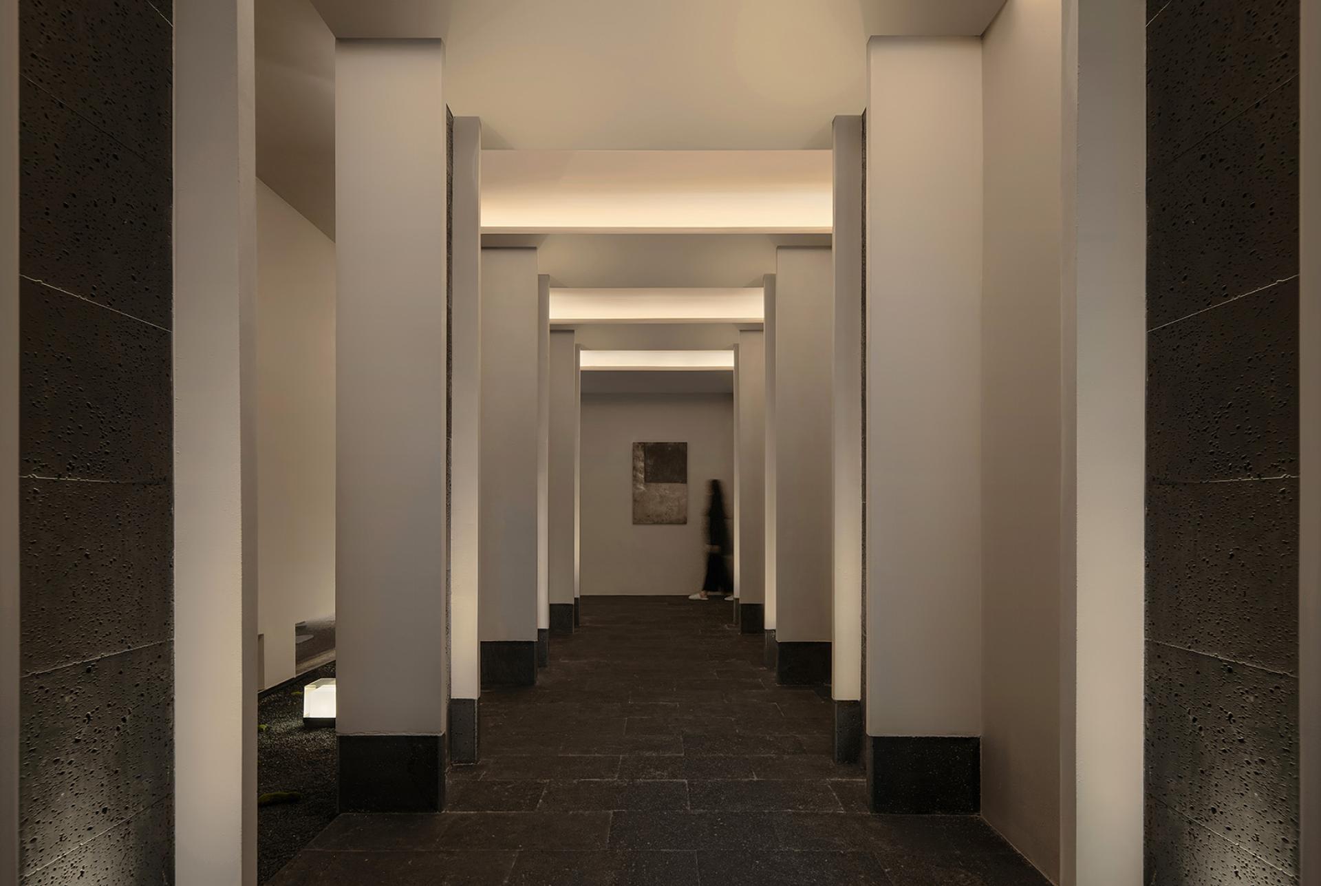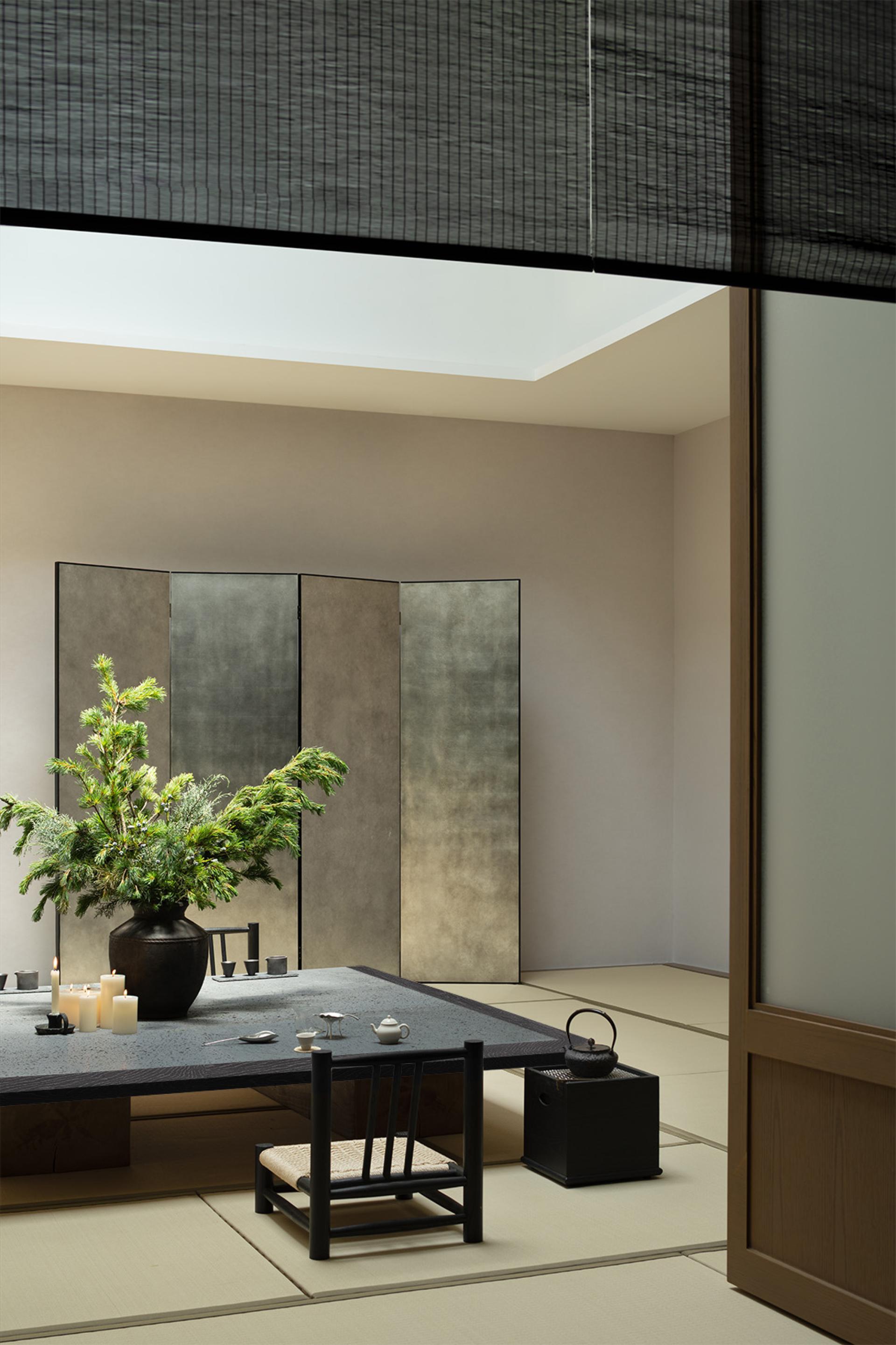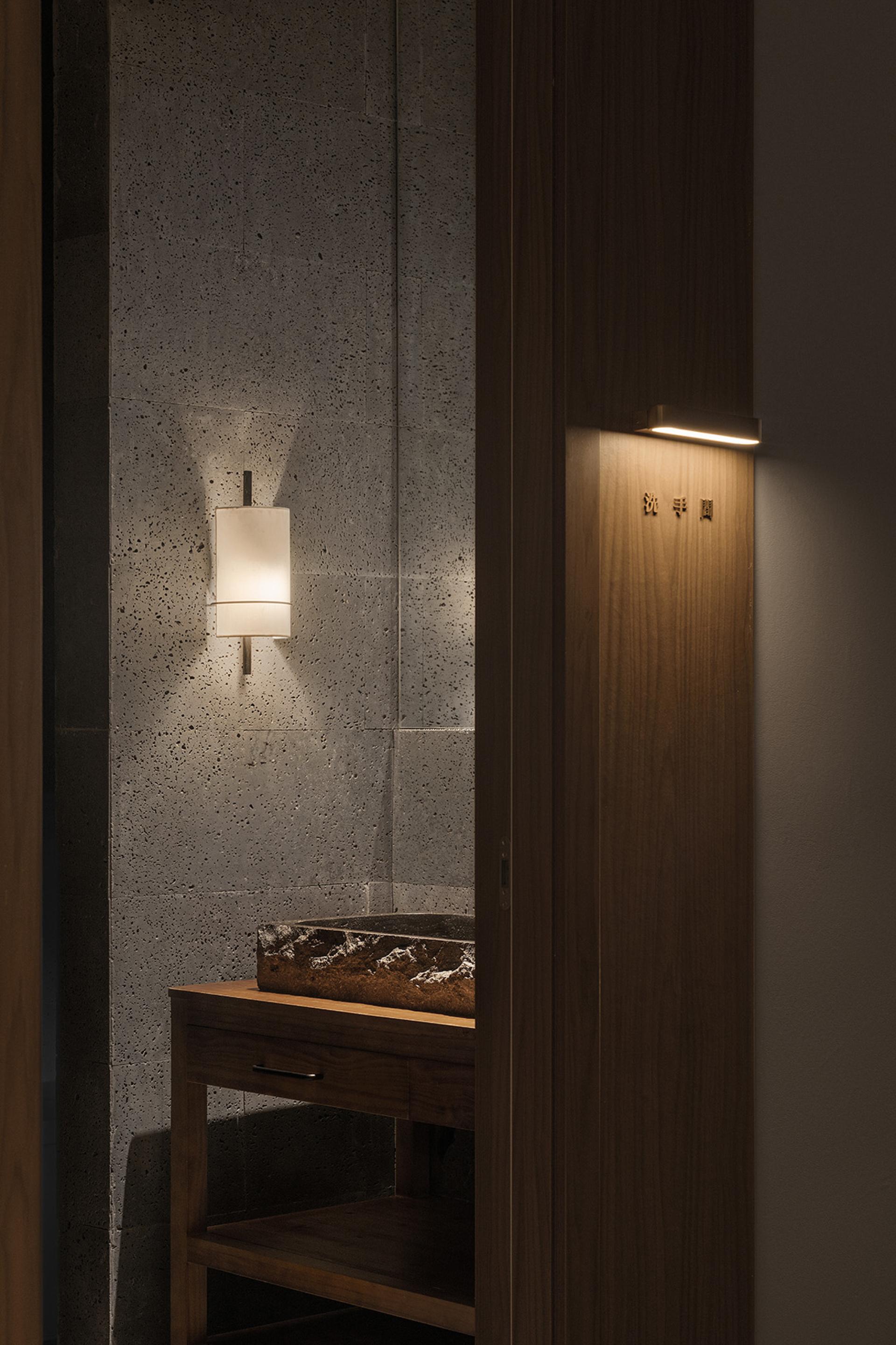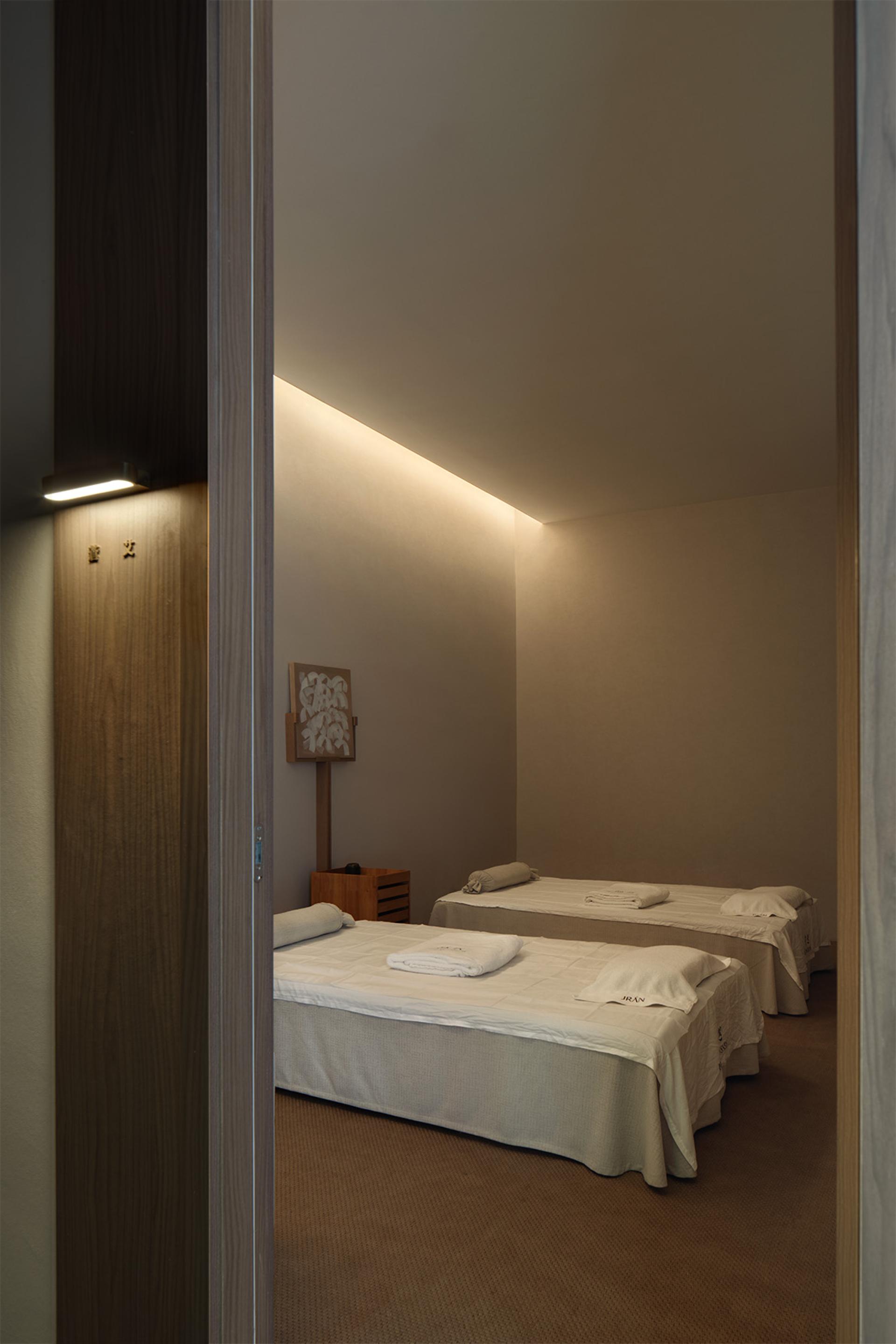 Above the tearoom, the skylight allows natural light to cascade in. The interplay of light and shadow within the architecture creates a dynamic beauty that shifts with the passage of time, imbuing the space with varying appearances and soul. The silver foil screen in the tearoom reflects a soft glow, complemented by the mottled ironware, tranquil lighting, and vibrant pine branches. This external passage of time imparts a sense of returning to simplicity and authenticity. The space exudes a subtle, understated, and hazy beauty, embodying Eastern aesthetics. Here, guests can enjoy a spa experience that relaxes the body, mind, and spirit.