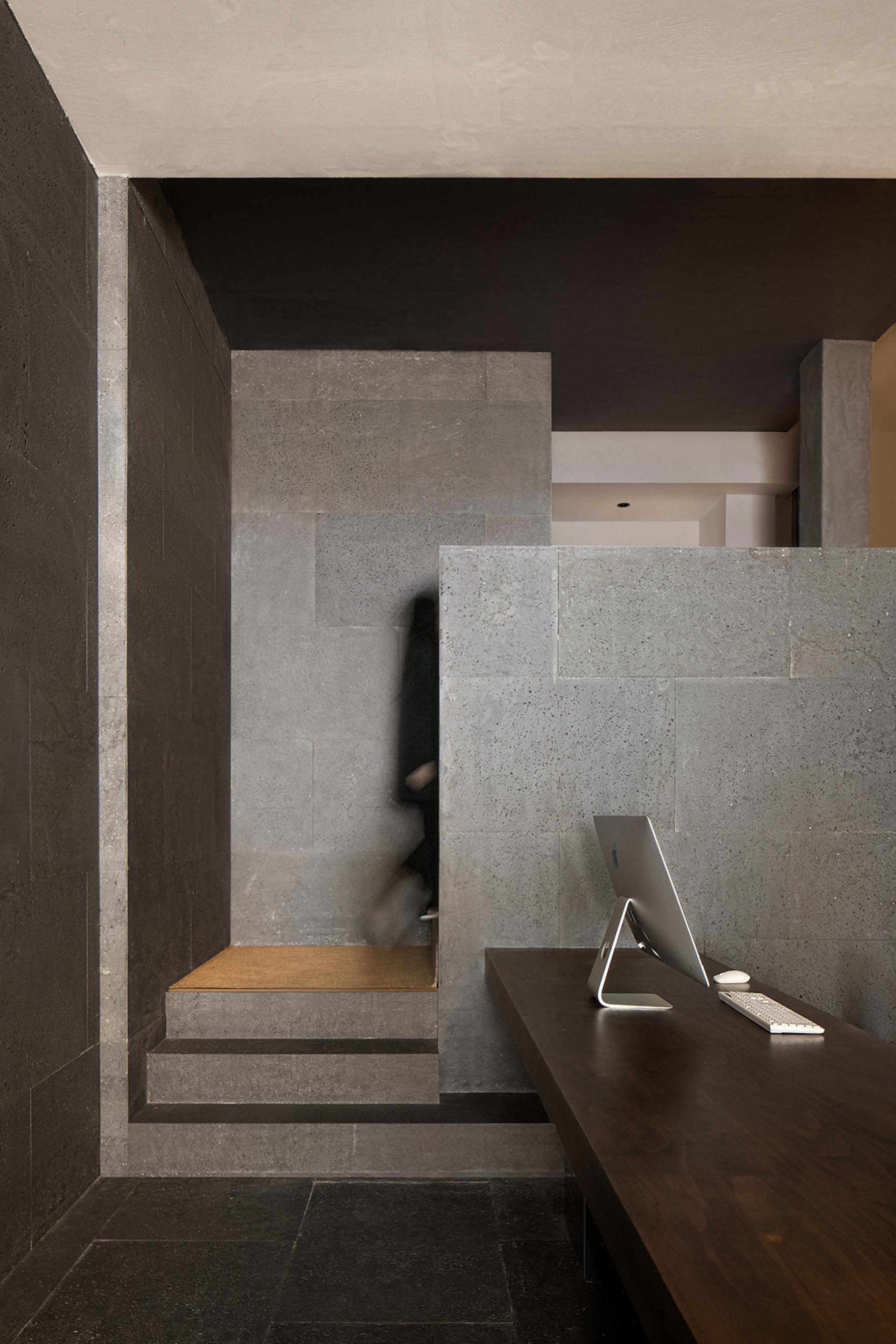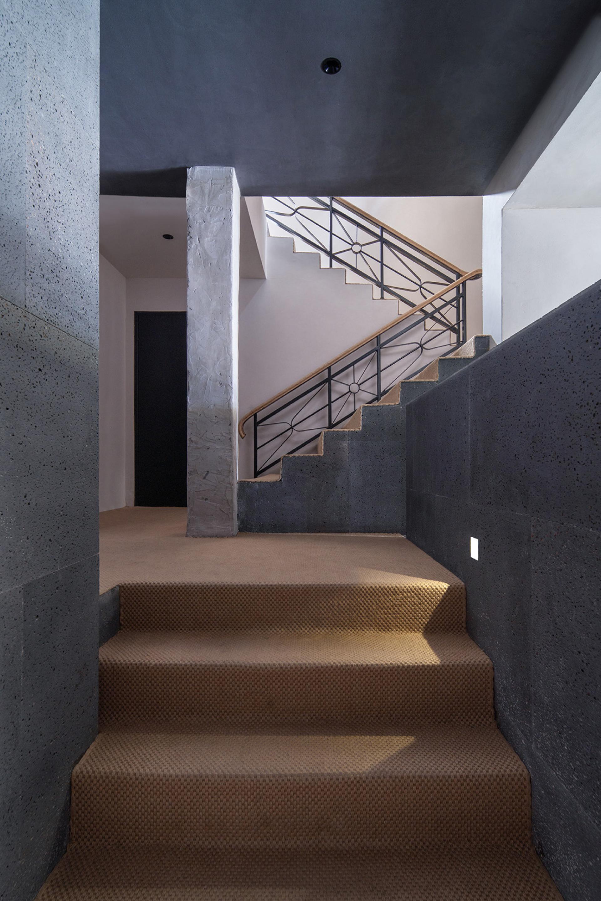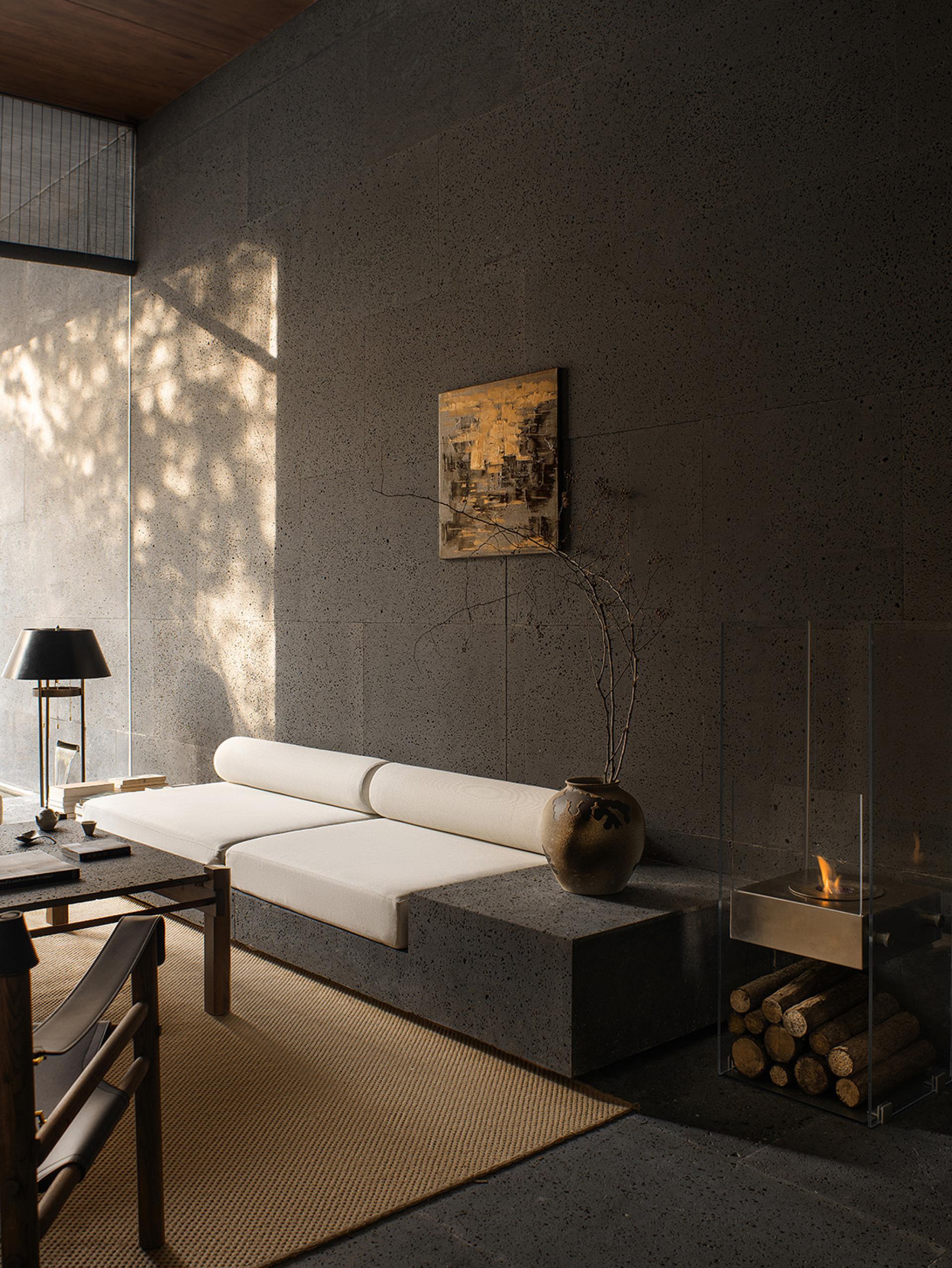 The spatial design aims to evoke the poetic charm of Eastern shadows, emphasizing the sculpting of architectural space. Using materials with a warm and unadorned texture, such as dark travertine and walnut wood, the overall tone of the space conveys a serene and relaxed atmosphere. The seating area is softly veiled by bamboo blinds, shielding it from the noise outside. The staircase structure connects the public and private areas while retaining the original handrails of the building. The old paint has been stripped away, revealing the natural grain of the wood.