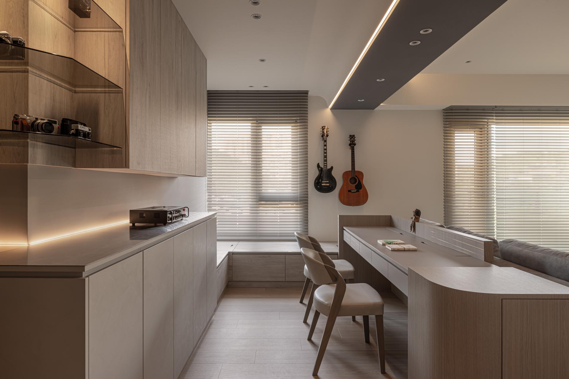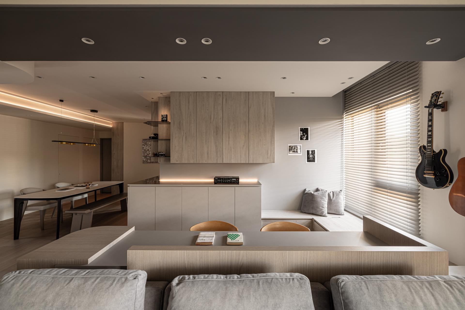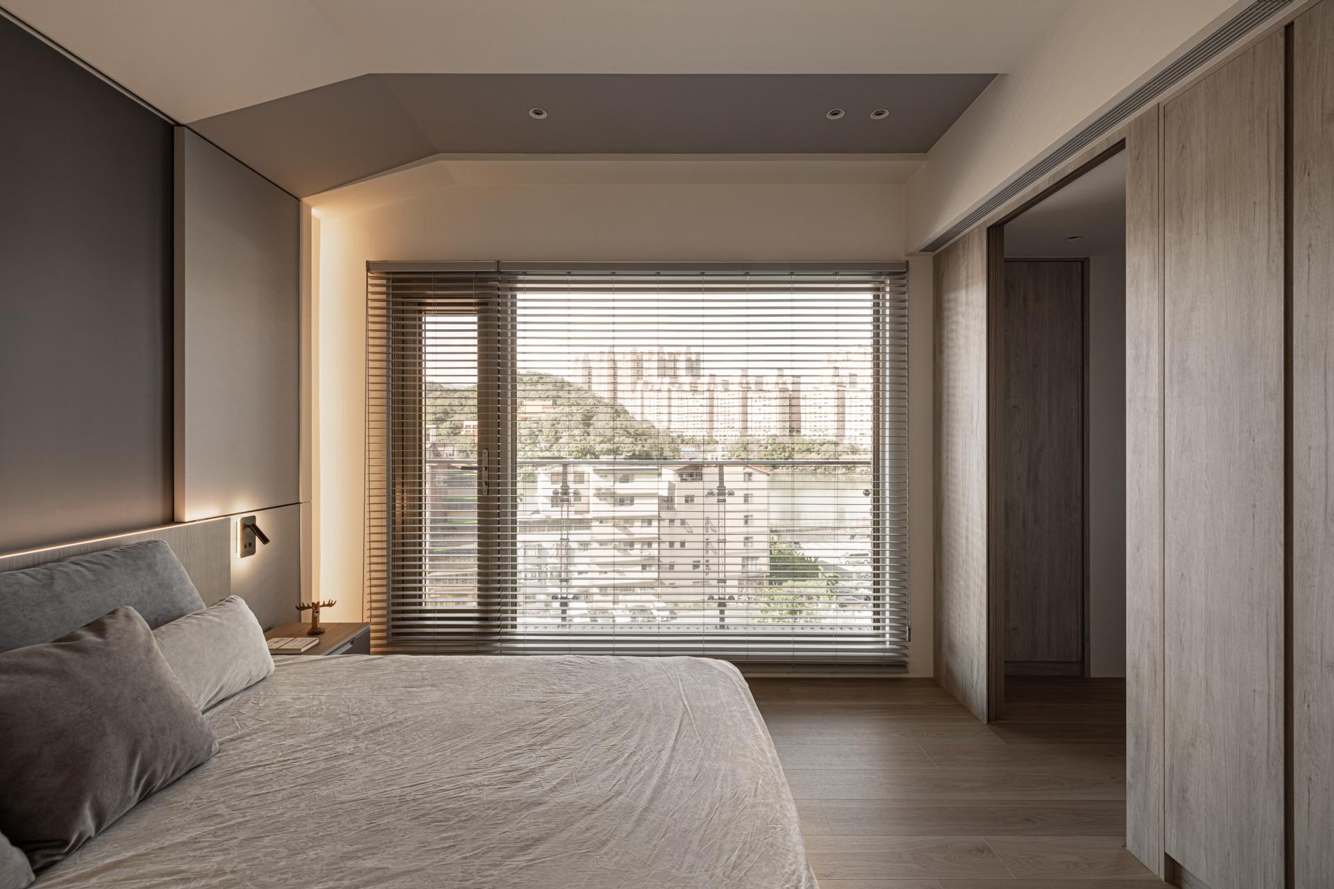 In crafting this harmonious living space, the designer meticulously evaluated the owner's needs, resulting in a thoughtfully curated selection of versatile storage cabinets. In a departure from conventional residential layouts, the study is strategically positioned behind the sofa. This innovative choice eliminates the need for a tall separation wall, thus preserving a sense of continuity and openness. Occupants can relax and unwind in a setting that encourages both comfort and leisure. The bedroom continues the theme established in the public areas, showcasing stunning wood grain textures that harmonize with the overall aesthetics. Large windows frame serene views and are set against a soothing gray palette, crafting a tranquil and cozy retreat for the residents, where warmth and comfort coexist seamlessly.This project beautifully balances the creation of a joyful home with a strong commitment to environmental sustainability. Mindful of Taiwan's subtropical climate, the design features expansive open spaces and striking floor-to-ceiling windows that invite abundant natural light and fresh air indoors. This thoughtful integration reduces the need for artificial lighting and air conditioning, allowing residents to enjoy a more energy-efficient lifestyle.