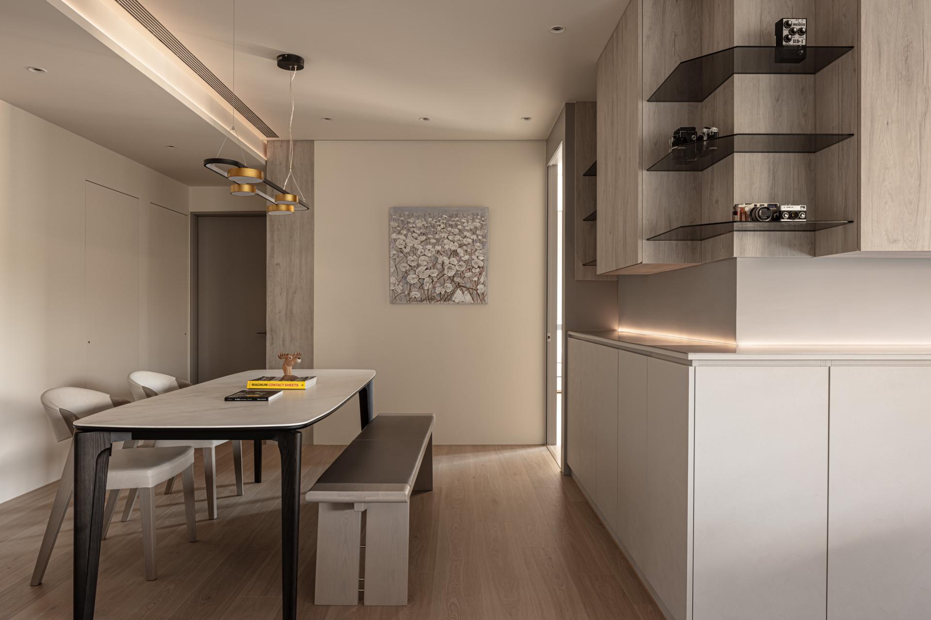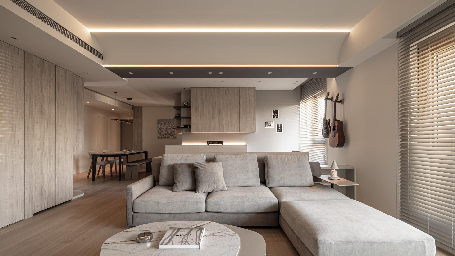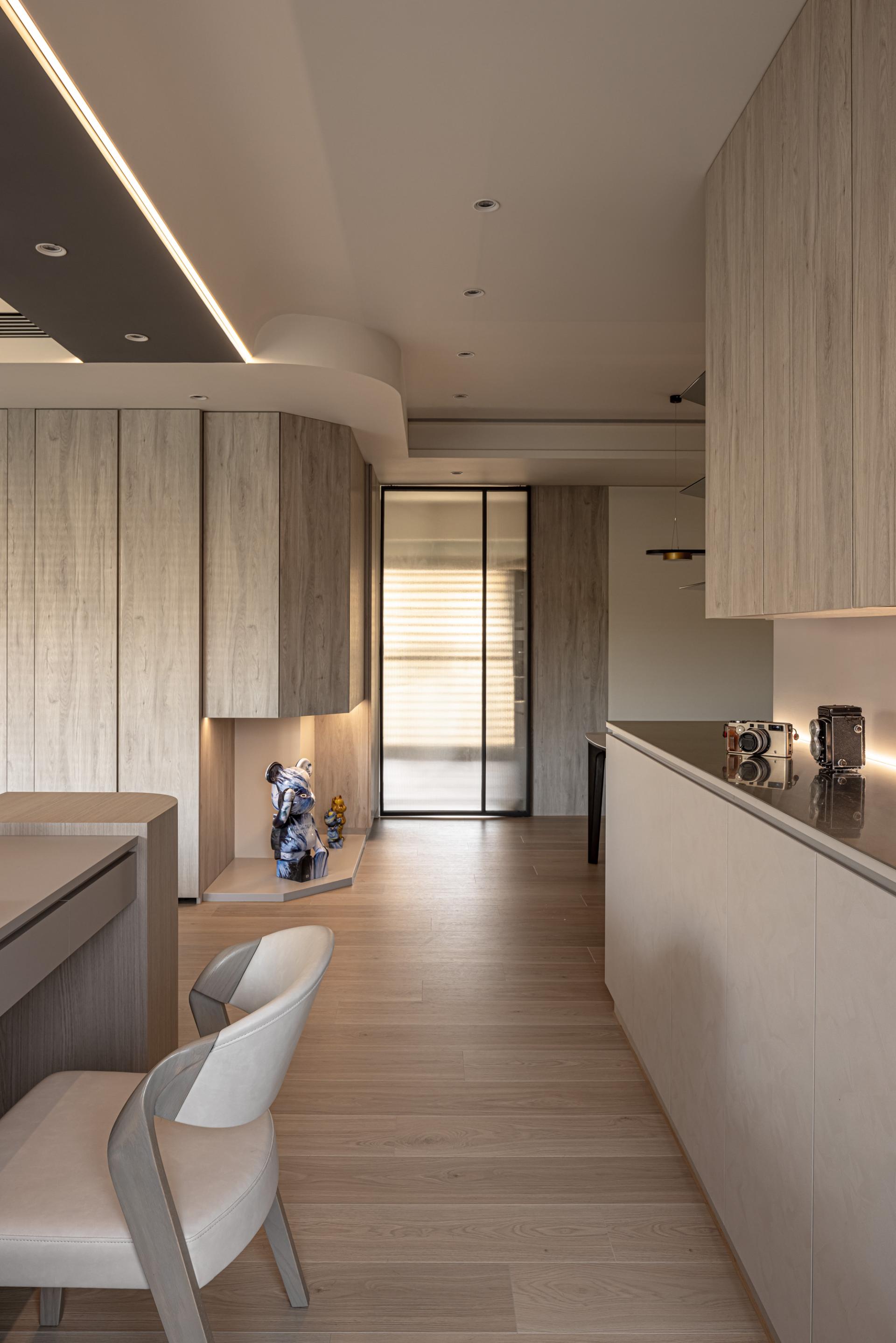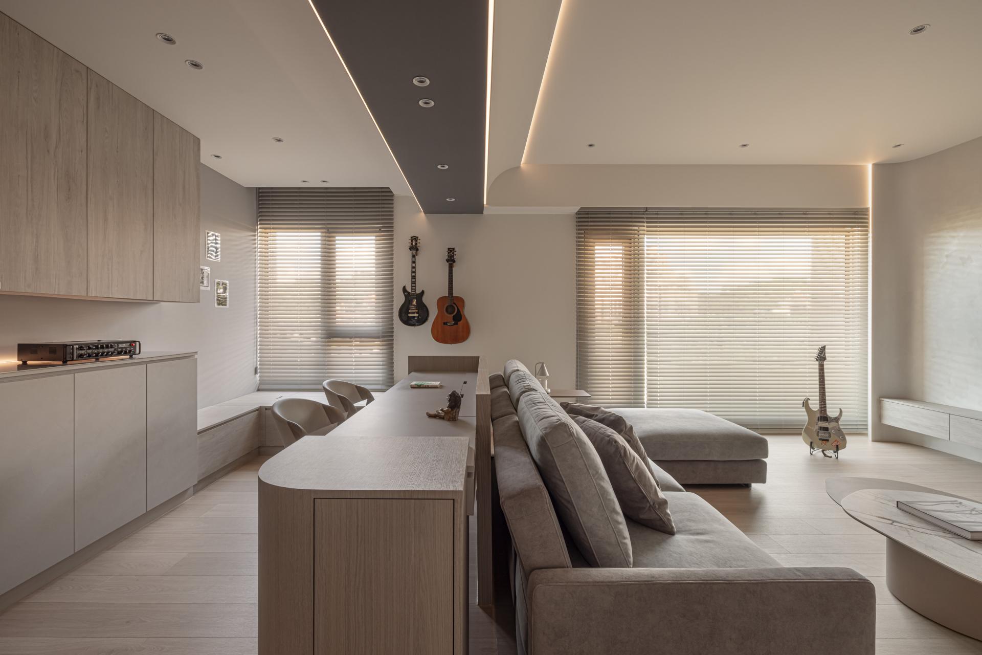 In crafting this harmonious living space, the designer meticulously evaluated the owner's needs, resulting in a thoughtfully curated selection of versatile storage cabinets. In a departure from conventional residential layouts, the study is strategically positioned behind the sofa. This innovative choice eliminates the need for a tall separation wall, thus preserving a sense of continuity and openness. Occupants can relax and unwind in a setting that encourages both comfort and leisure. The bedroom continues the theme established in the public areas, showcasing stunning wood grain textures that harmonize with the overall aesthetics. Large windows frame serene views and are set against a soothing gray palette, crafting a tranquil and cozy retreat for the residents, where warmth and comfort coexist seamlessly.This project beautifully balances the creation of a joyful home with a strong commitment to environmental sustainability. Mindful of Taiwan's subtropical climate, the design features expansive open spaces and striking floor-to-ceiling windows that invite abundant natural light and fresh air indoors. This thoughtful integration reduces the need for artificial lighting and air conditioning, allowing residents to enjoy a more energy-efficient lifestyle.
