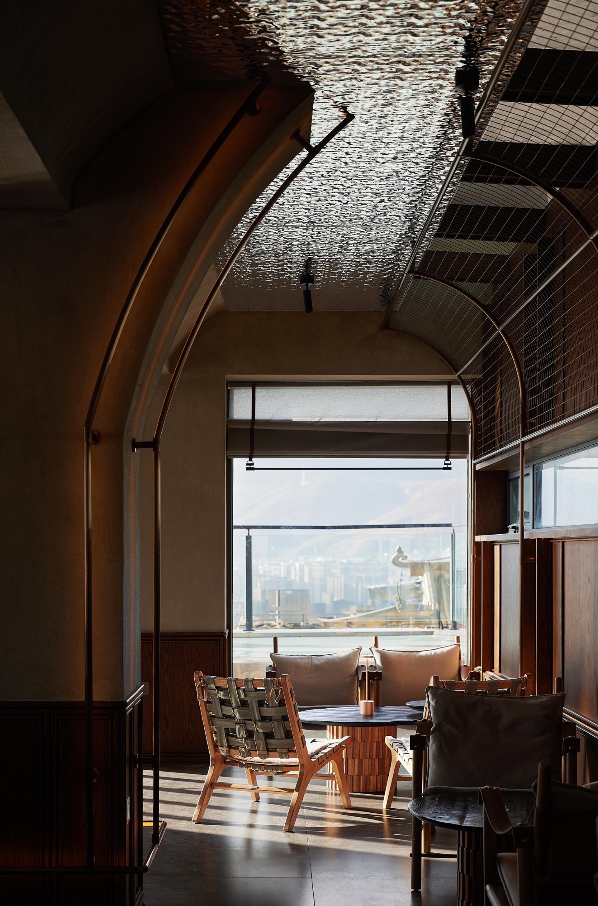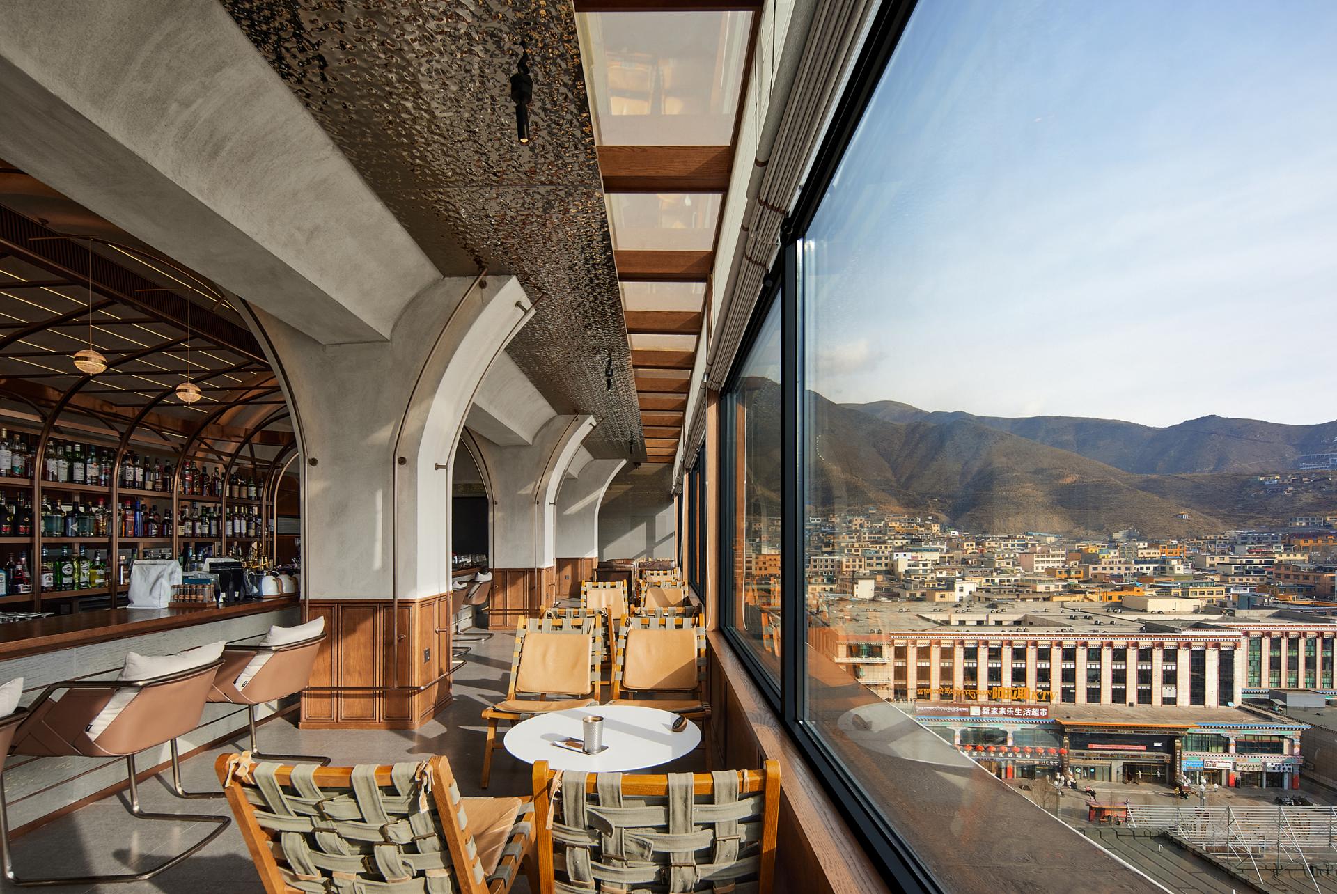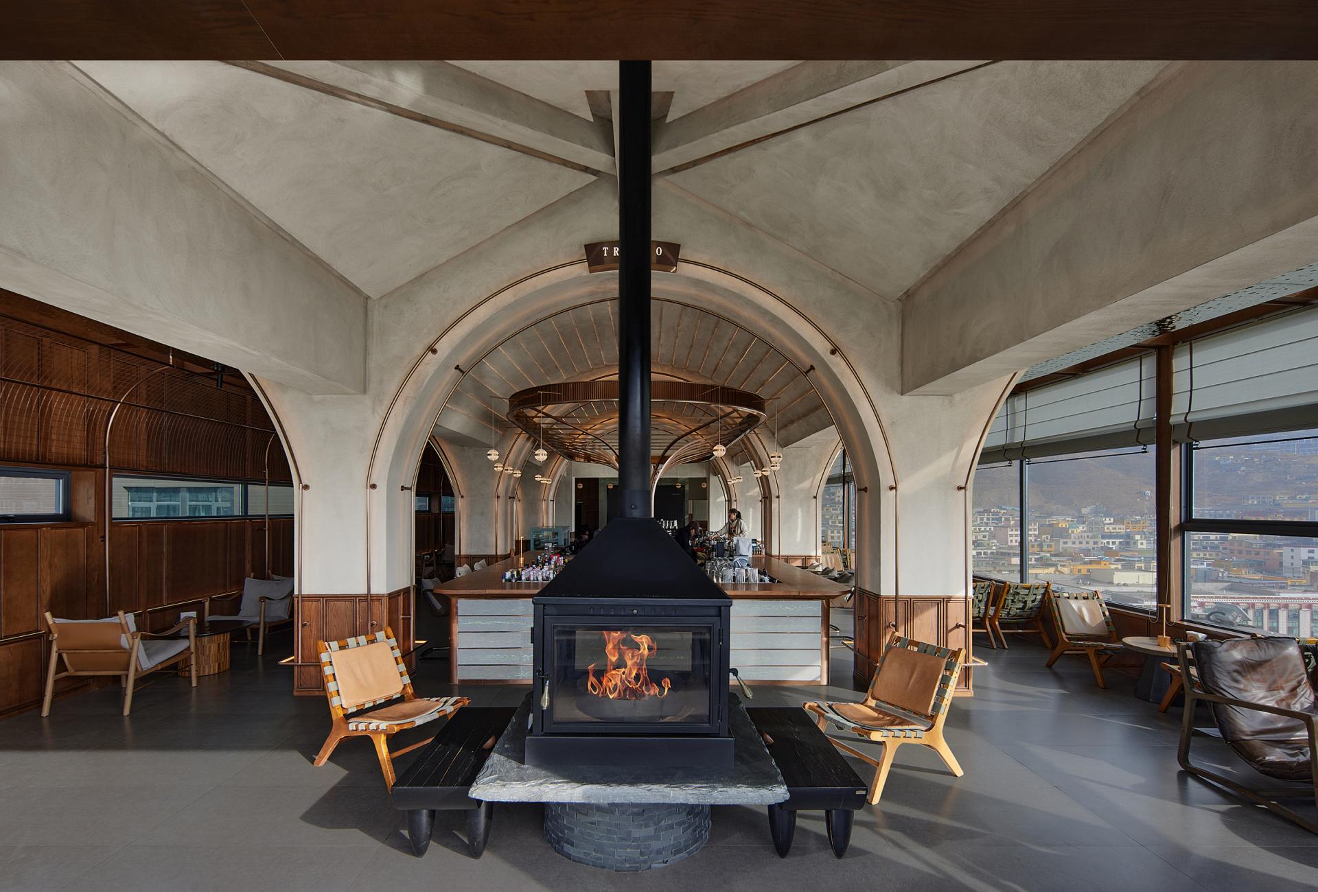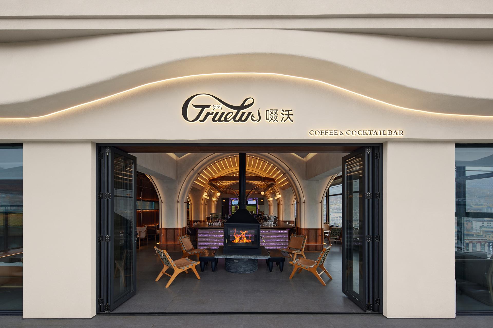 Truewo Café is perched atop the Gesar Palace Hotel, the tallest building in the heart of Yushu, Qinghai, claiming its rightful place as the city’s highest vantage point. Here, the tranquility of the plateau soothes the urban clamor. A glance upward reveals the sunlit peaks of the Kunlun Mountains, gleaming golden in their majesty, while below, the city’s bustling tapestry unfolds in slow motion. This is a spot where one can take in the splendor of the world in a single gaze—truly a delight beyond compare. With this natural advantage, Truewo Café stands out among Yushu's many cafés as an irreplaceable landmark. The designers embraced this potential, ing the right-side wall facing the snow-covered meadows into a floor-to-ceiling panoramic window, ensuring an uninterrupted visual feast. Outdoors, a 60-square-meter terrace connects seamlessly with the interior, enclosed by transparent glass railings that invite the sky closer, making the clouds feel within arm’s reach. While its unparalleled location draws in visitors, designer Yuan Hanwen understood that what truly determines whether patrons linger is the interior design—its ability to harmonize with the environment, cater to the business's positioning, and address the emotional and psychological comfort of guests. In Truewo, the designer focused on two main aspects: reshaping the spatial structure and curating an atmosphere. His goal was to create a "utopia" atop the city, a haven where urbanites could escape the chaos of daily life and find serene enjoyment. The 270-square-meter rectangular space features evenly distributed pillars. The designer worked with this existing structure, crafting arched ceilings to imbue the space with a classical and romantic charm. The orderly grid of columns adds a rhythmic sense of structure, subtly dividing the bar area from the seating.