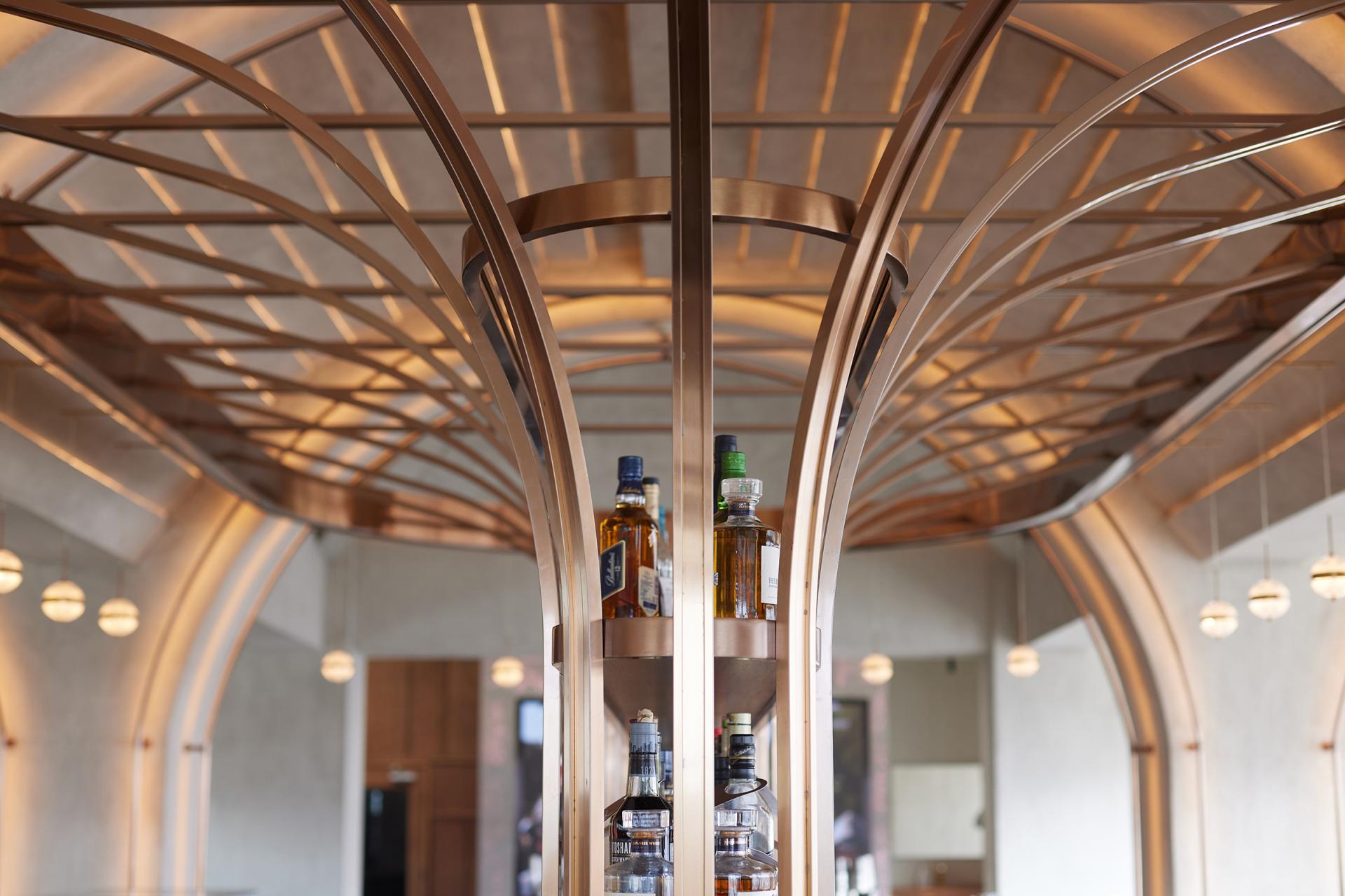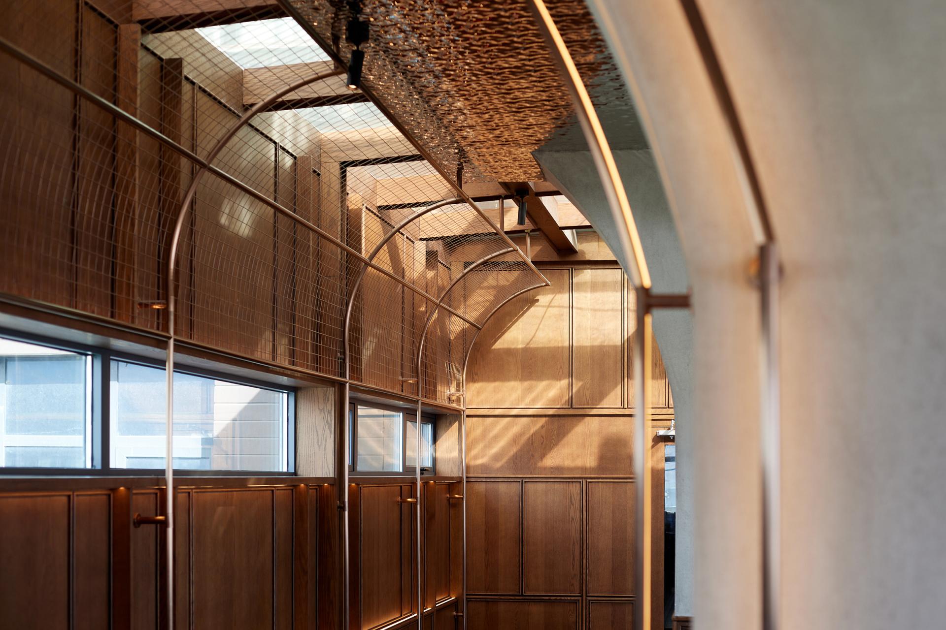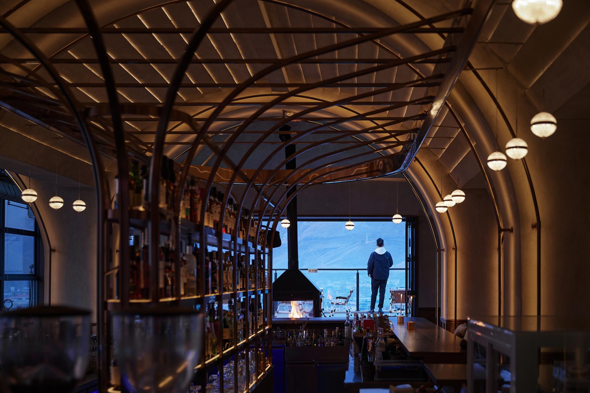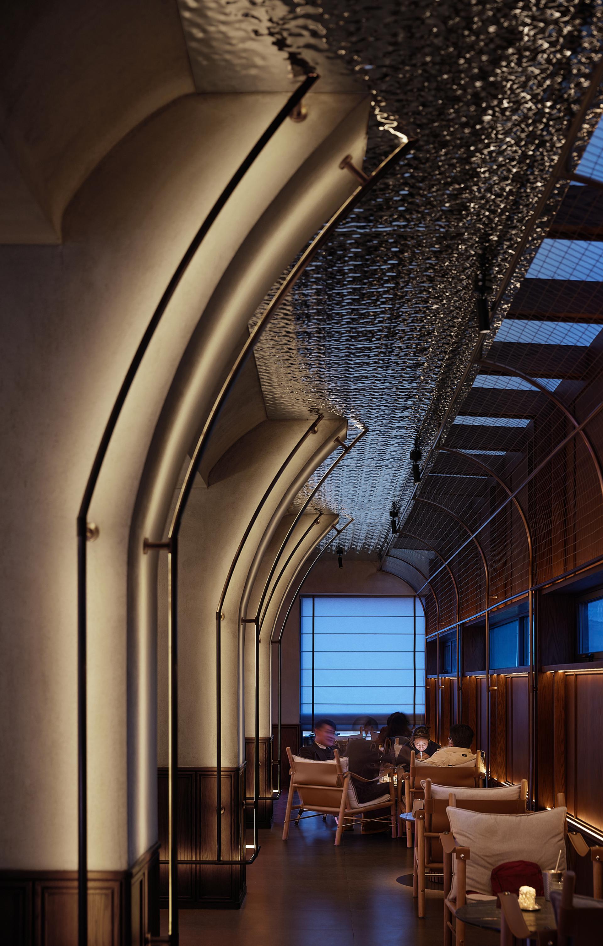 Truewo Café is perched atop the Gesar Palace Hotel, the tallest building in the heart of Yushu, Qinghai, claiming its rightful place as the city’s highest vantage point. Here, the tranquility of the plateau soothes the urban clamor. A glance upward reveals the sunlit peaks of the Kunlun Mountains, gleaming golden in their majesty, while below, the city’s bustling tapestry unfolds in slow motion. This is a spot where one can take in the splendor of the world in a single gaze—truly a delight beyond compare. With this natural advantage, Truewo Café stands out among Yushu's many cafés as an irreplaceable landmark. The designers embraced this potential, ing the right-side wall facing the snow-covered meadows into a floor-to-ceiling panoramic window, ensuring an uninterrupted visual feast. Outdoors, a 60-square-meter terrace connects seamlessly with the interior, enclosed by transparent glass railings that invite the sky closer, making the clouds feel within arm’s reach. While its unparalleled location draws in visitors, designer Yuan Hanwen understood that what truly determines whether patrons linger is the interior design—its ability to harmonize with the environment, cater to the business's positioning, and address the emotional and psychological comfort of guests. In Truewo, the designer focused on two main aspects: reshaping the spatial structure and curating an atmosphere. His goal was to create a "utopia" atop the city, a haven where urbanites could escape the chaos of daily life and find serene enjoyment. The 270-square-meter rectangular space features evenly distributed pillars. The designer worked with this existing structure, crafting arched ceilings to imbue the space with a classical and romantic charm. The orderly grid of columns adds a rhythmic sense of structure, subtly dividing the bar area from the seating.