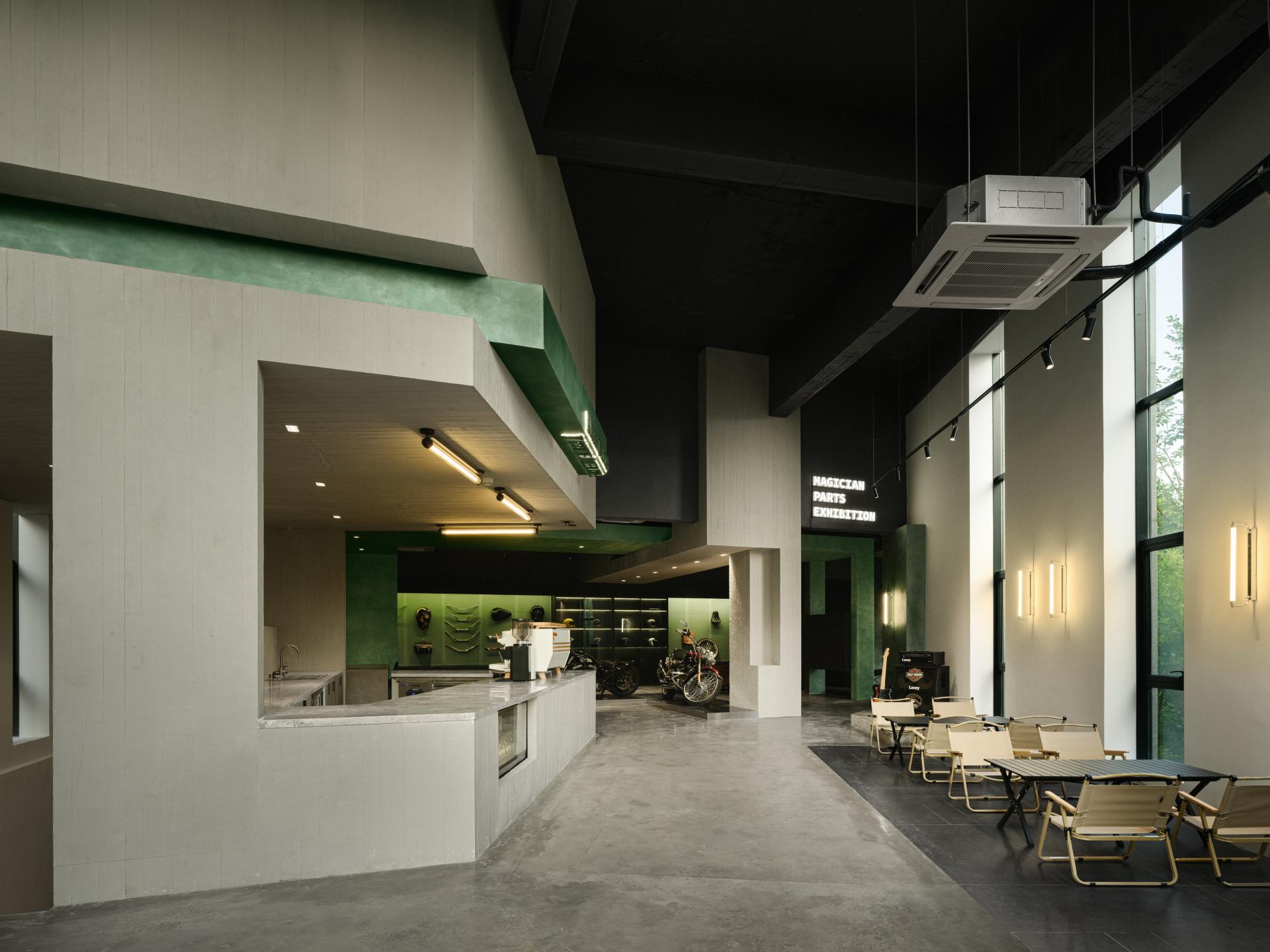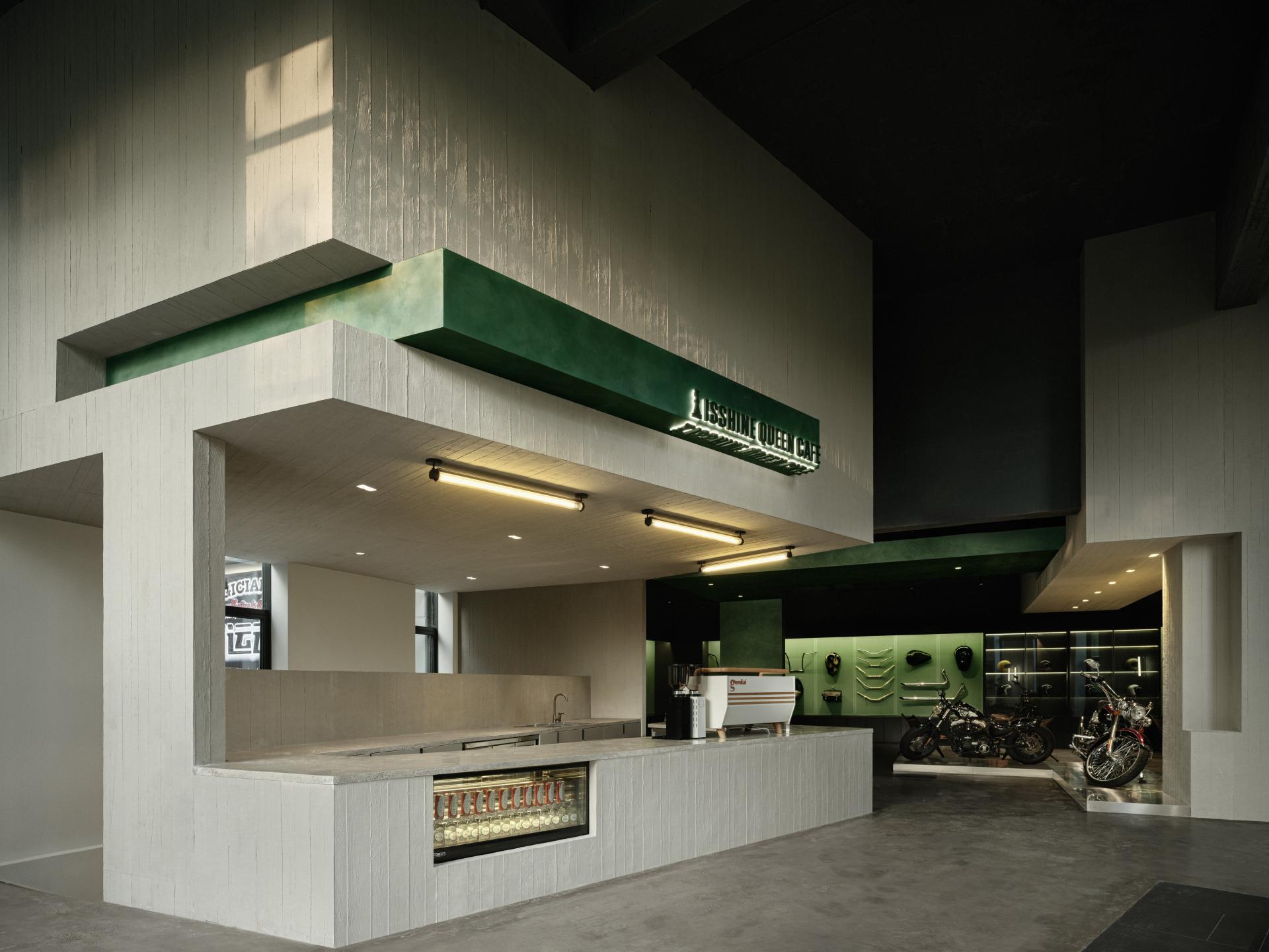 We have selected two main materials: polished concrete and wood-grain concrete panels—to establish an industrial and mechanical tone. Customized metal green textured paint, representing the ornate and exquisite decorations of motorcycles, serves as an expression of the dual nature of the culture.