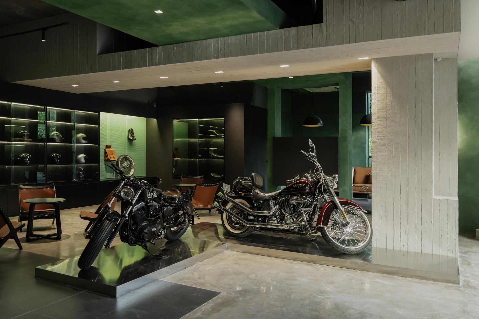 The back area has a lower ceiling height compared to the front area. The design cleverly converts the vertical language emphasizing space height into horizontal language through the combination of the L-shaped motorcycle display stand and structural column shaping. Additionally, the use of deconstructed and interwoven forms organically connects different spatial functional areas. The back area has increased the proportion of customized metal green textured paint, making the spatial texture quiet and sophisticated, immersing visitors in a wonderful atmosphere that combines industrial aesthetics with “glamorous vintage charm”.
