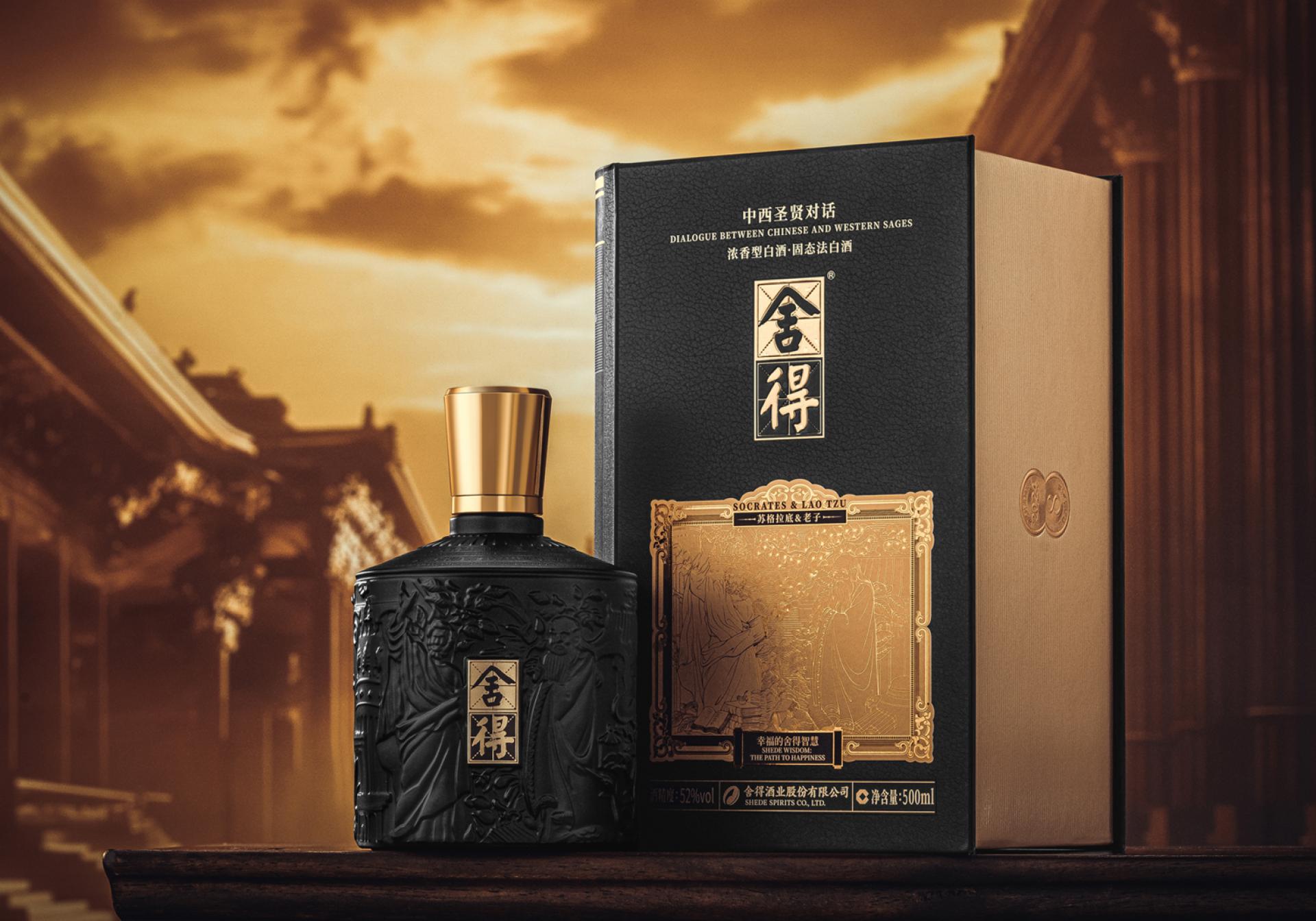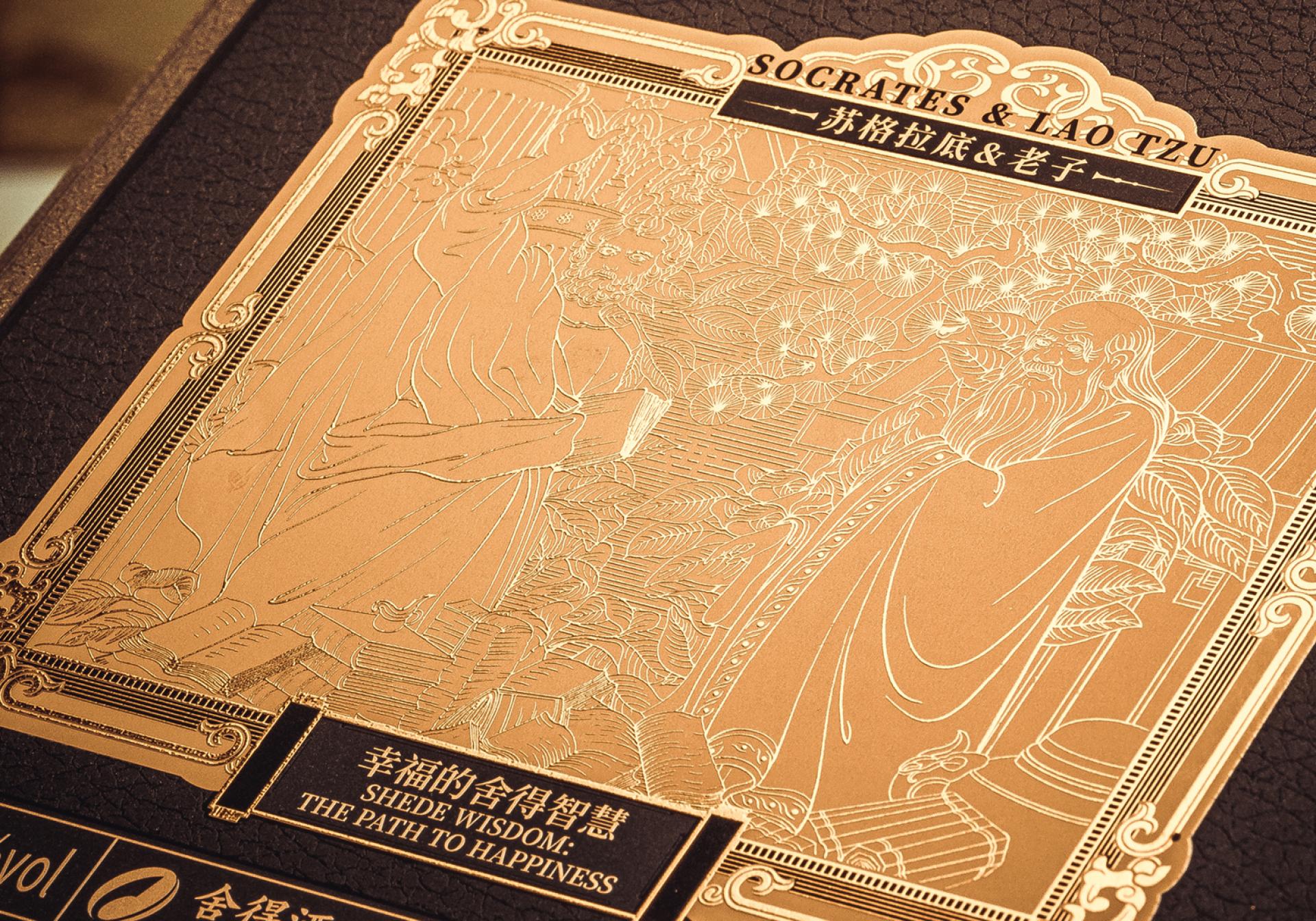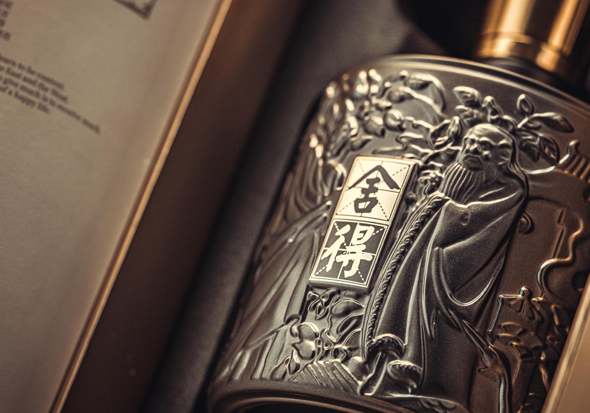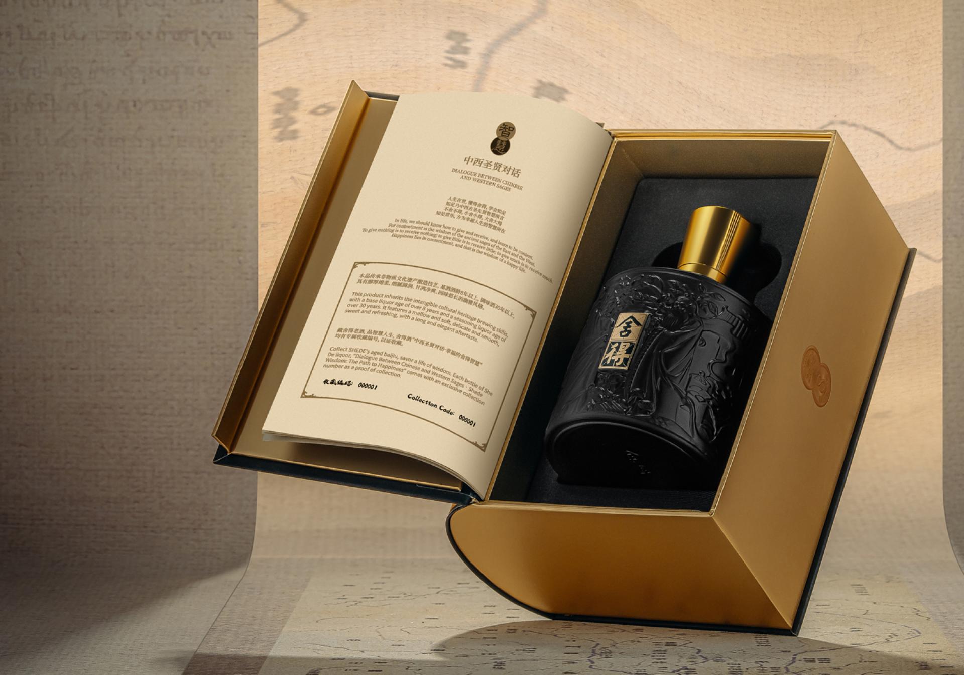 The packaging is designed in the shape of a classical book, and it can be opened by reading, which not only protects the bottle but also highlights the theme of "wisdom". The entire body of the bottle is depicted in three-dimensional reliefs of both Eastern and Western architecture, incorporating Roman columns, church buildings, and horse drawn carriages from the West; Eastern Chinese style courtyard, cranes, bamboo slips. These presents the differences and integration of Chinese and Western cultures. The shoulder of the bottle is adorned with two famous sayings from ancient philosophers, inspiring the path of wisdom towards happiness. The overall combination of black and gold highlights its mysterious and solemn style.