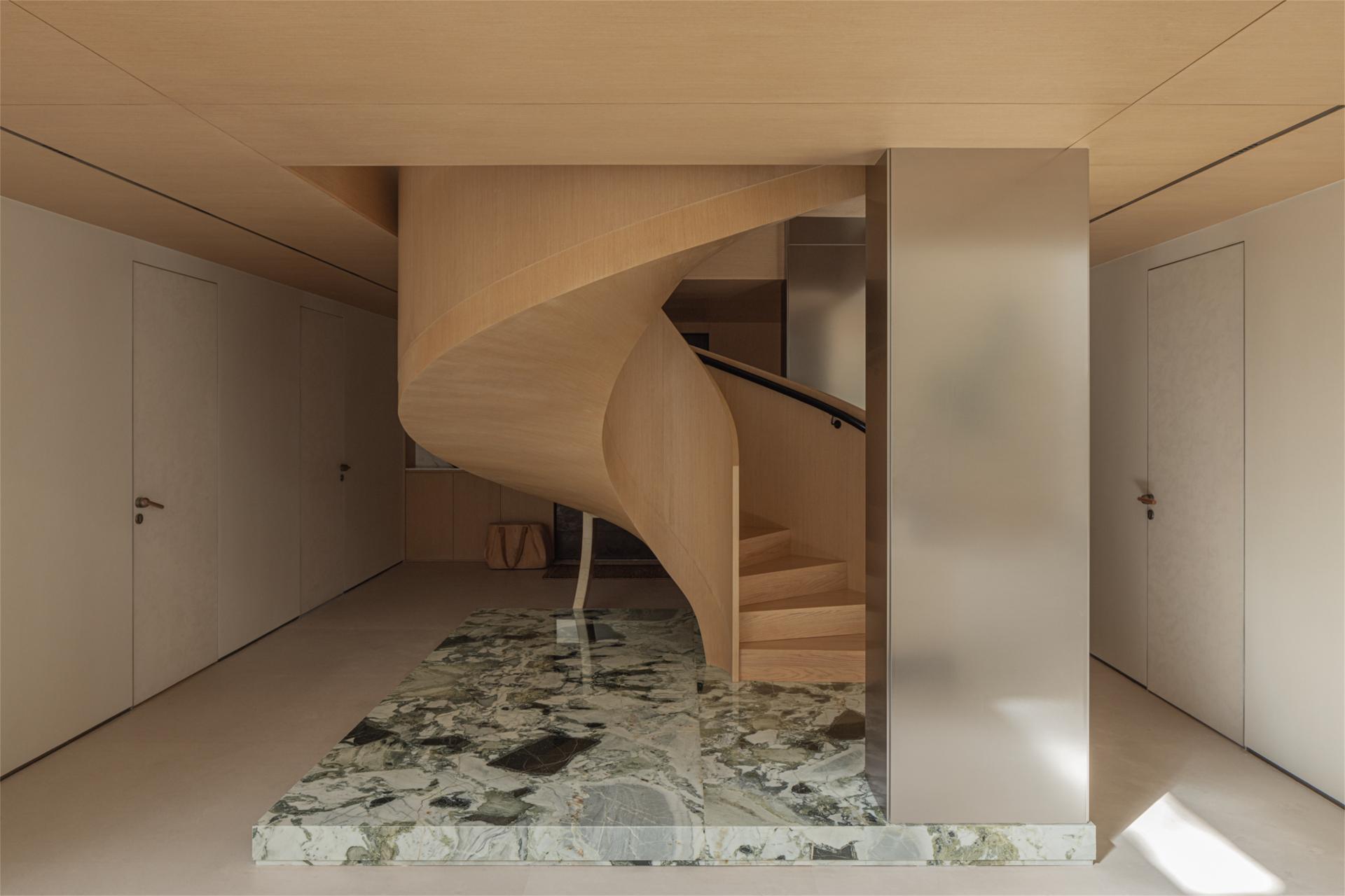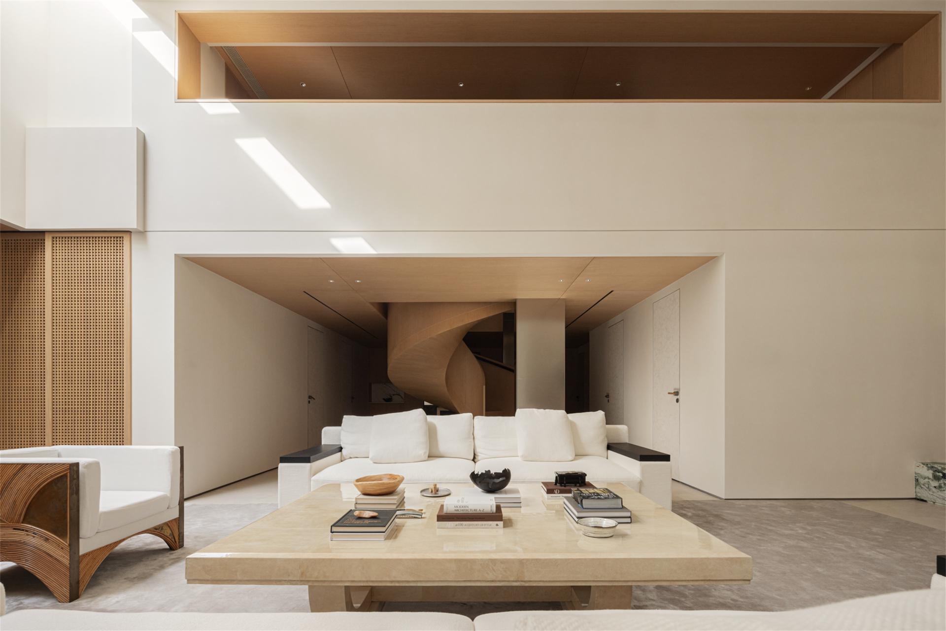 The project eschews the clutter of complex elements, instead employing a minimalist approach on each floor to embody the principle of "form follows function." The basement maximizes the use of available space, utilizing a spiral staircase to seamlessly transition between levels and enhance the three-dimensional feel of the area. On the second floor, a bold move involves the complete removal of primary walls, shunning traditional partitions in favor of cabinets and soft furnishings to clearly define and distinguish different functional zones. This reduction in walls not only allows for an abundance of natural light to flood the interior but also contributes to a more open, breathable space. Furthermore, it enriches the simplicity of the room's design with dynamic light and shadow effects, offering an enhanced visual experience. The fifth floor boasts a specialized garden area, meticulously designed to foster a serene and peaceful ambiance, catering to the homeowners' desire for relaxation and rejuvenation.