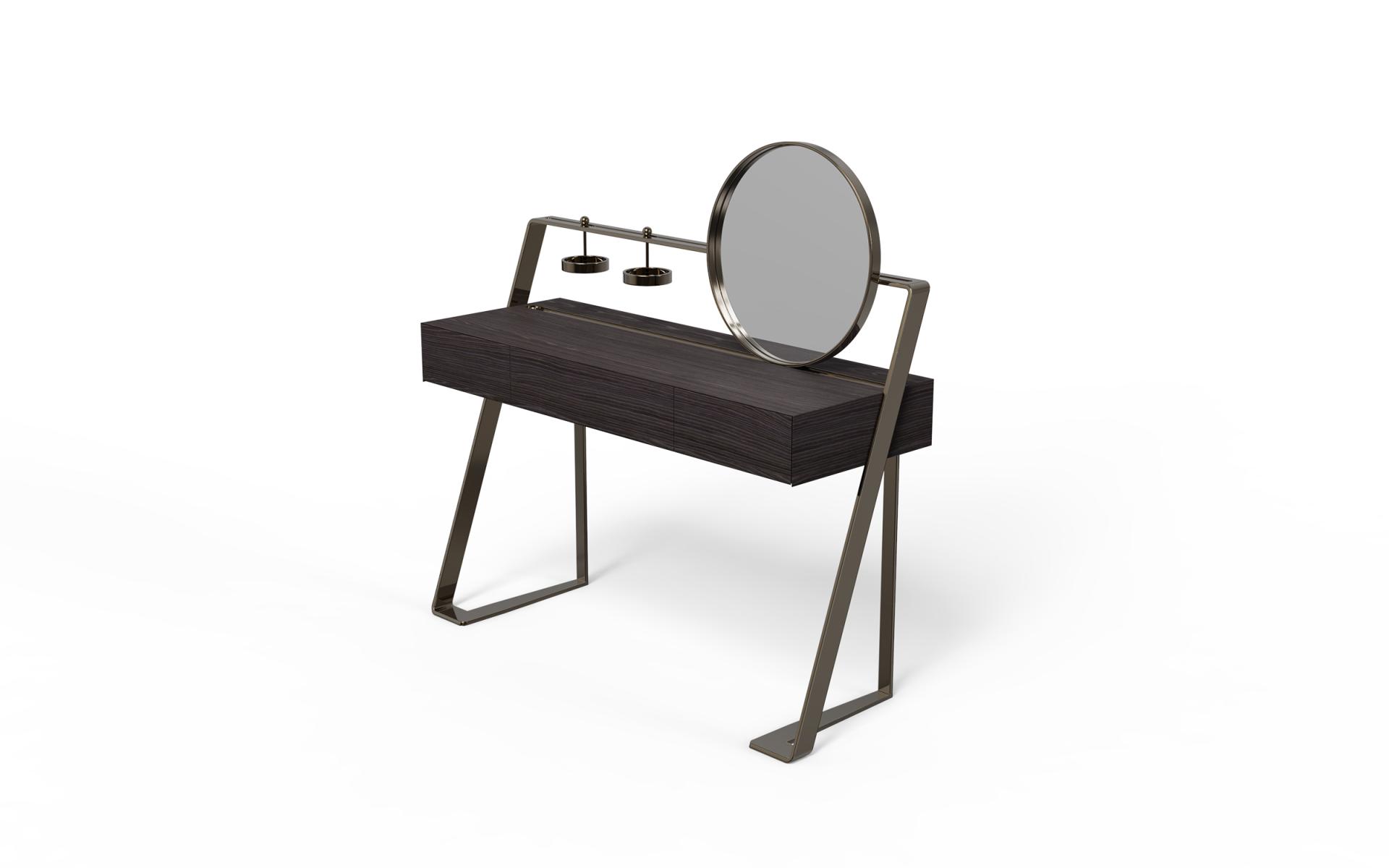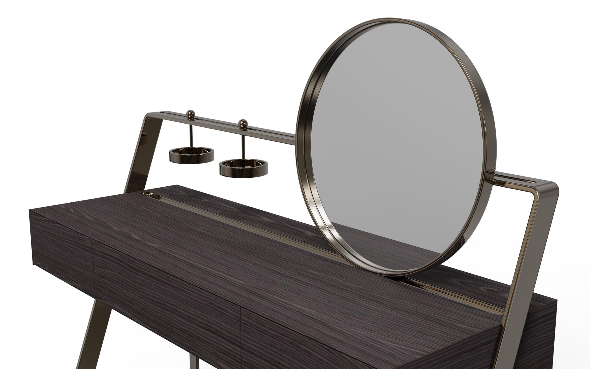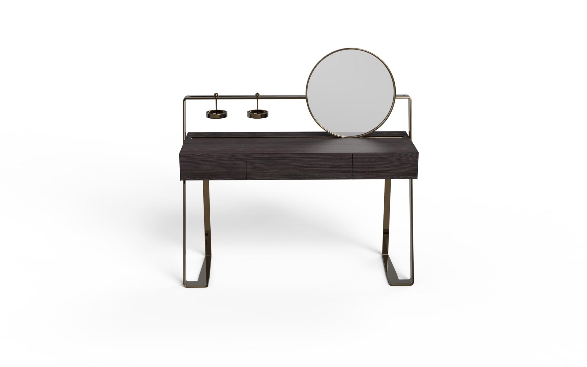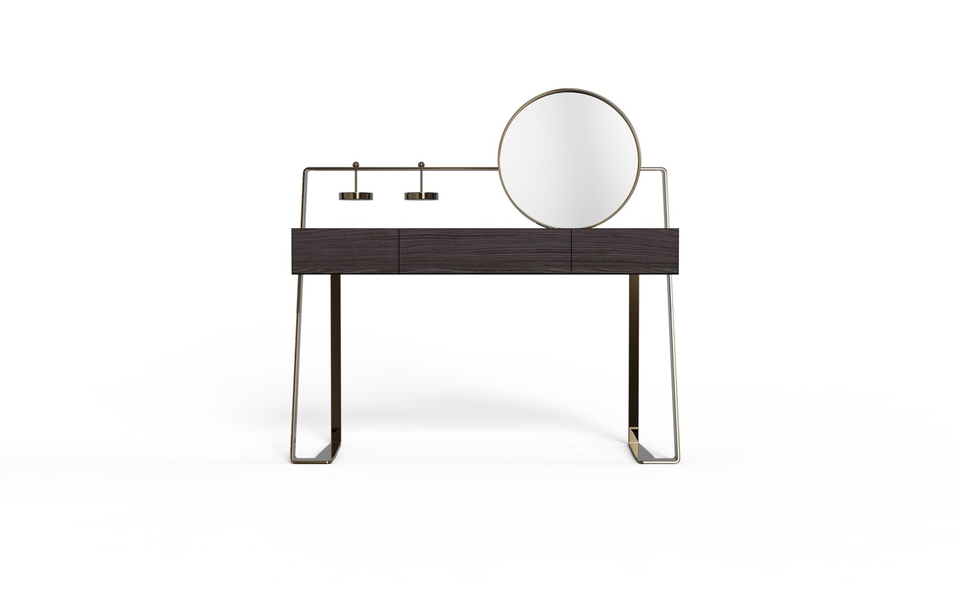 The dressing table subtly reveals a sense of steadiness in its understated elegance, meticulously crafted with attention to detail in its simplicity. It utilizes light lines, skillful construction techniques, and the seamless fusion of planes and arcs, exuding profound depth and meaning. The overall design adheres to a clean and efficient core, eschewing excessive ornamentation. The combination of metal and wood creates a harmonious balance of strength and softness, with clear layers, complemented by the interplay of color and texture, exuding an elegant and luxurious quality. The horizontally sliding small tray on the side can store precious small jewelry, not only controlling the visual rhythm and proportional relationships but also connecting the user's actions and psychology.