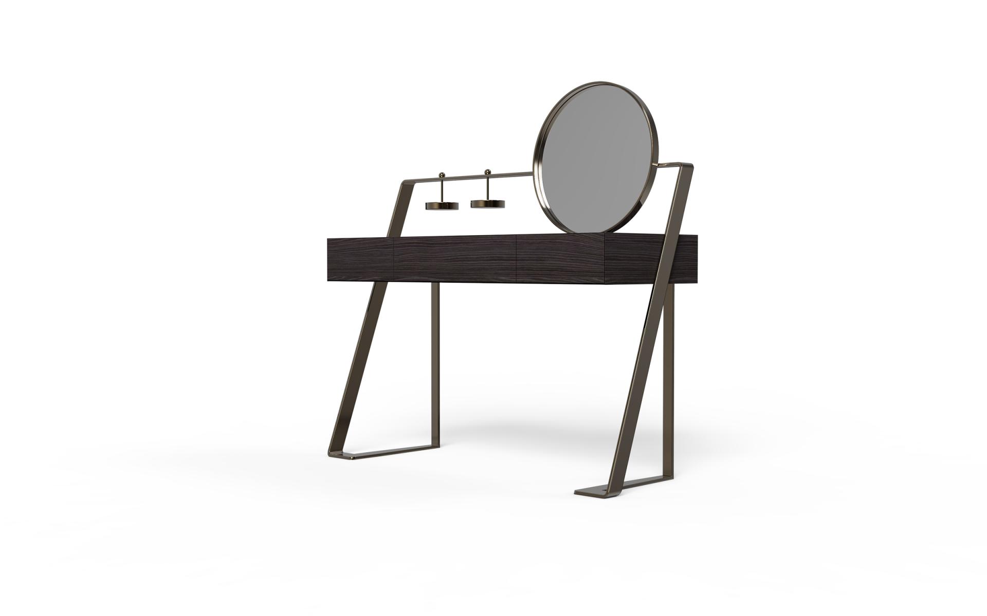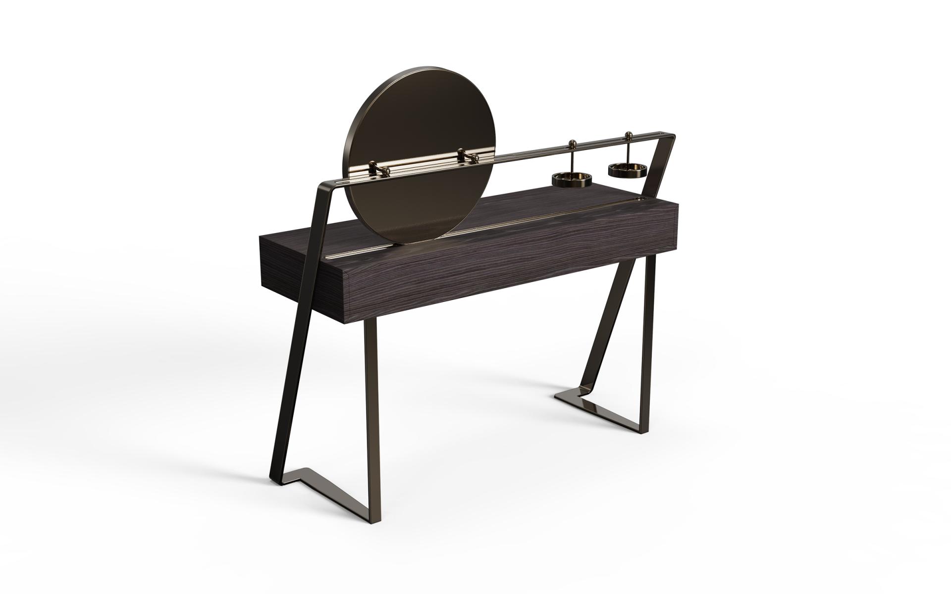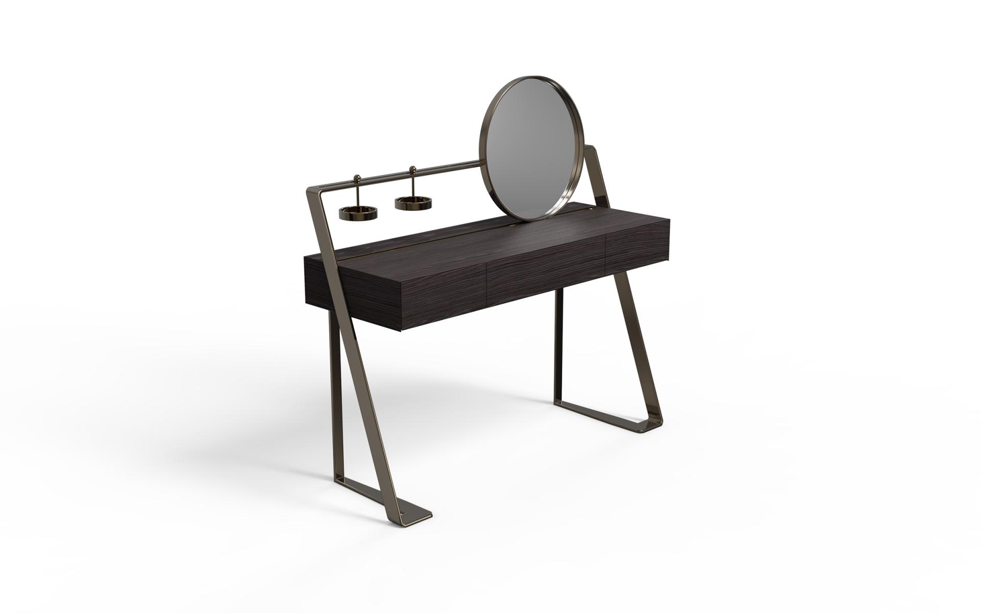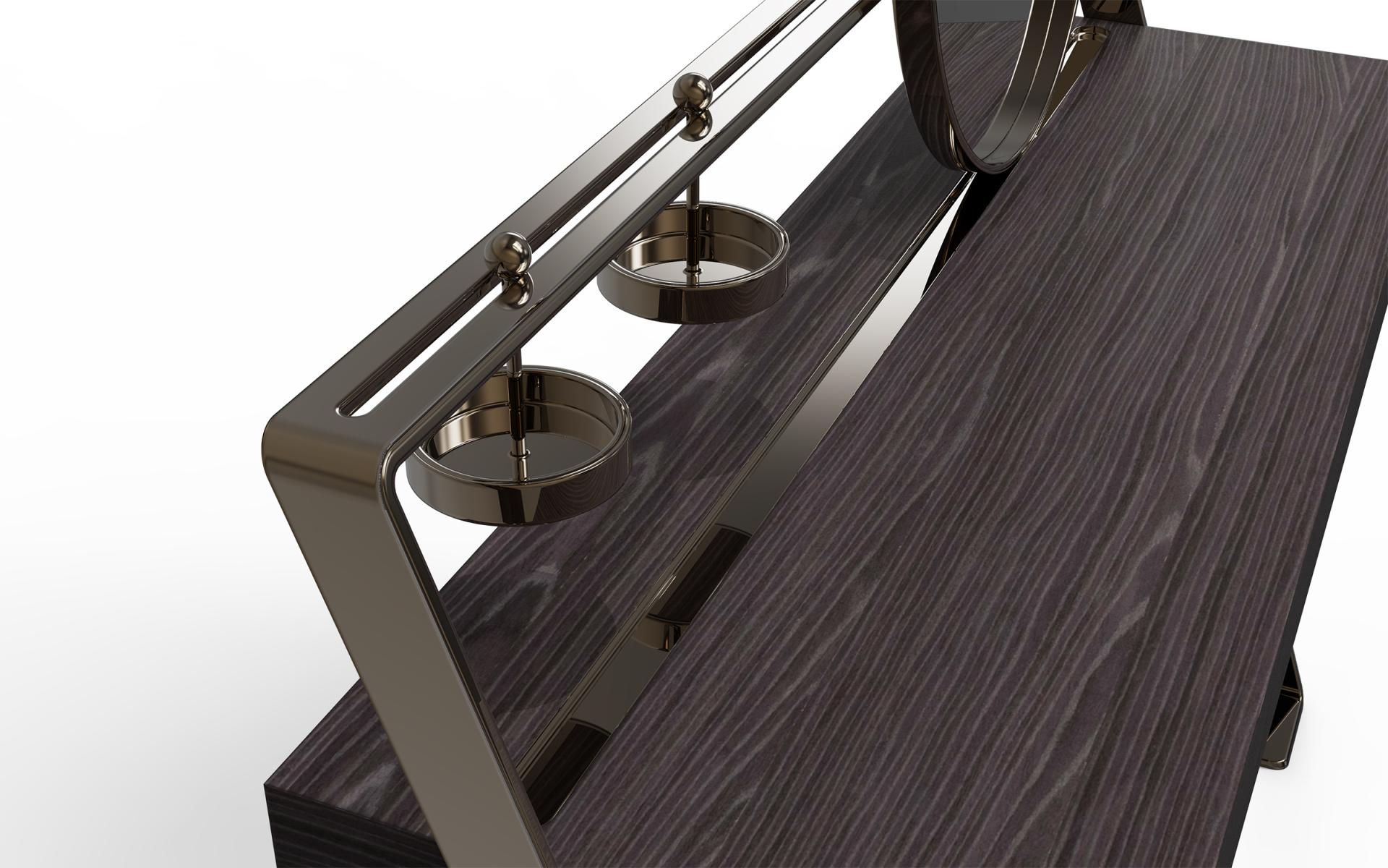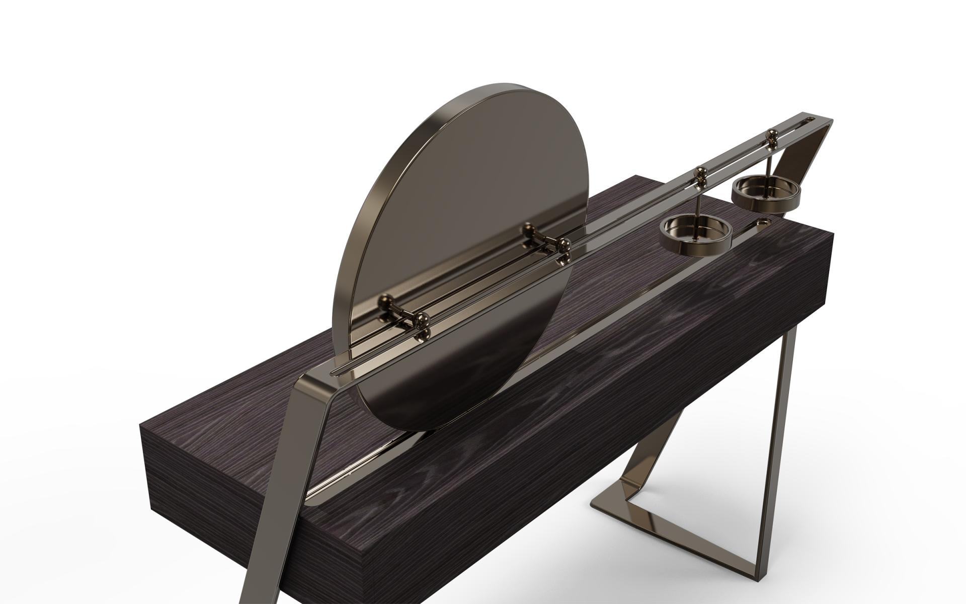 The dressing table subtly reveals a sense of steadiness in its understated elegance, meticulously crafted with attention to detail in its simplicity. It utilizes light lines, skillful construction techniques, and the seamless fusion of planes and arcs, exuding profound depth and meaning. The overall design adheres to a clean and efficient core, eschewing excessive ornamentation. The combination of metal and wood creates a harmonious balance of strength and softness, with clear layers, complemented by the interplay of color and texture, exuding an elegant and luxurious quality. The horizontally sliding small tray on the side can store precious small jewelry, not only controlling the visual rhythm and proportional relationships but also connecting the user's actions and psychology.