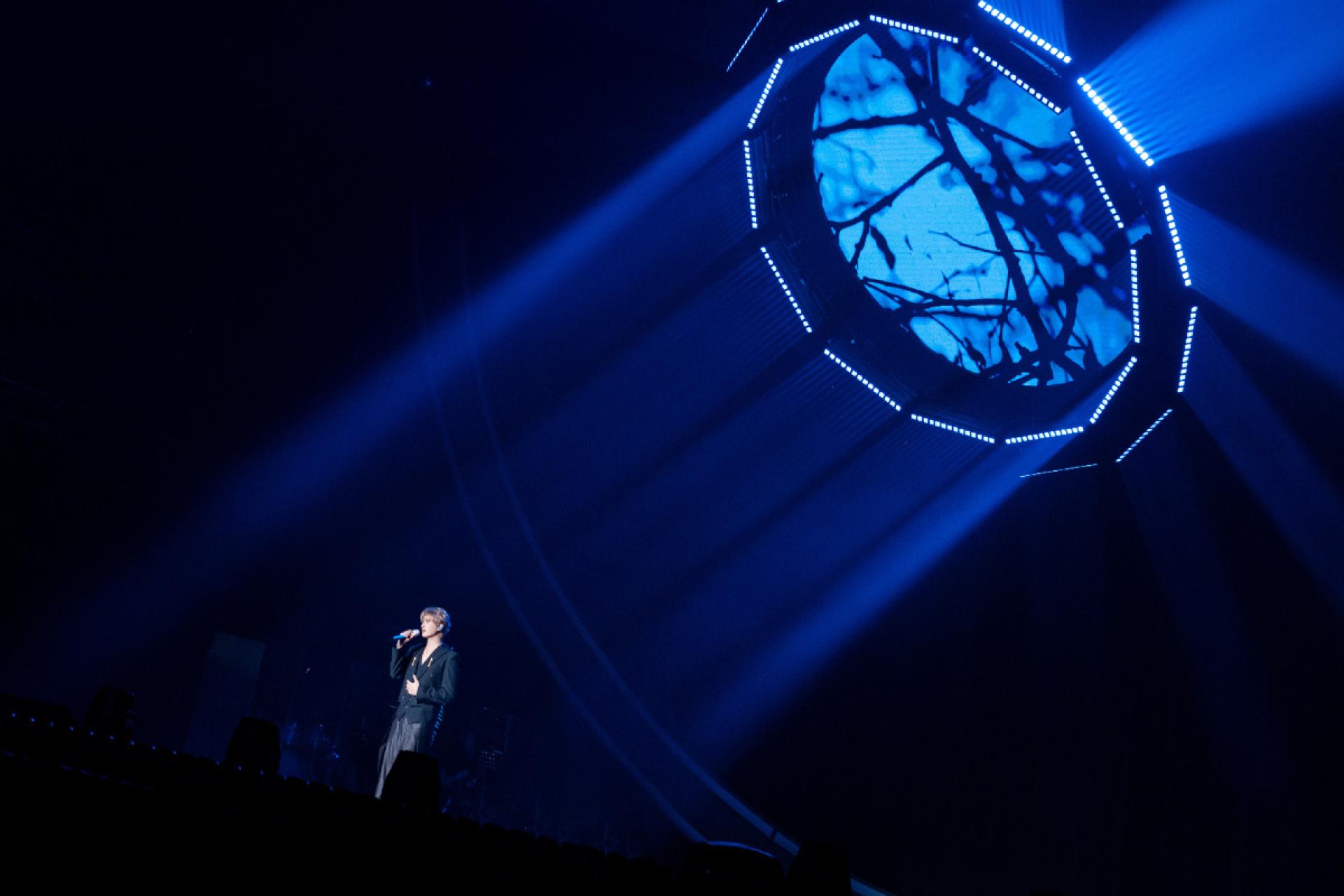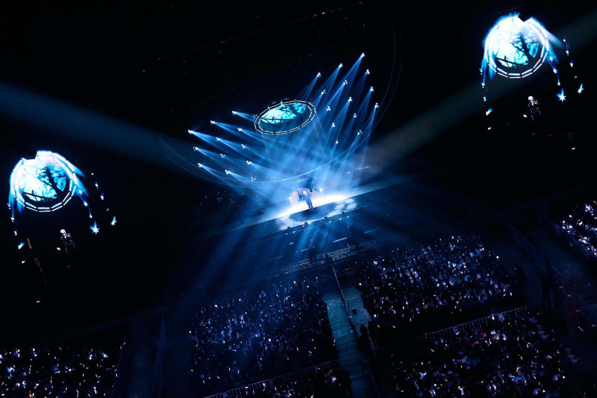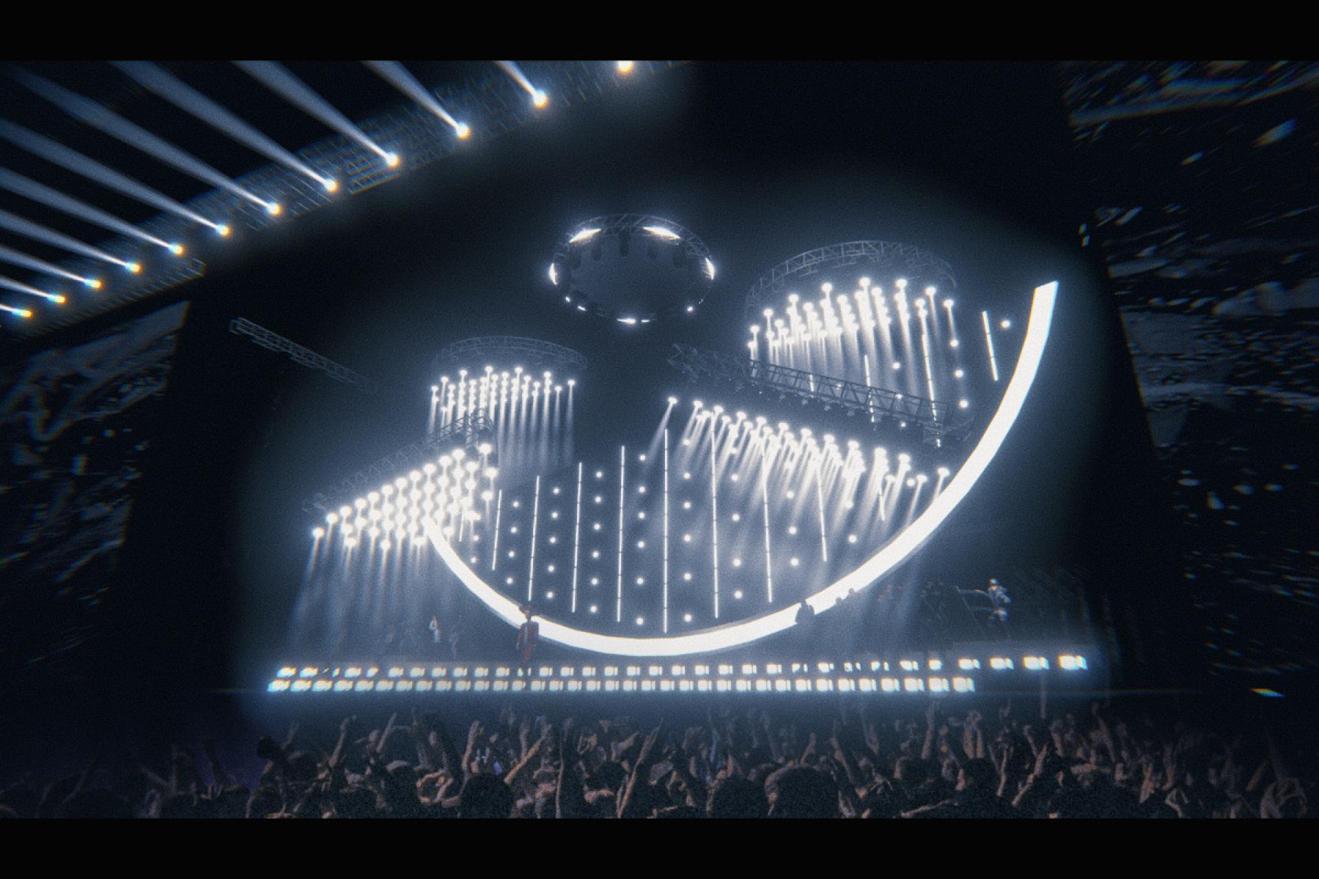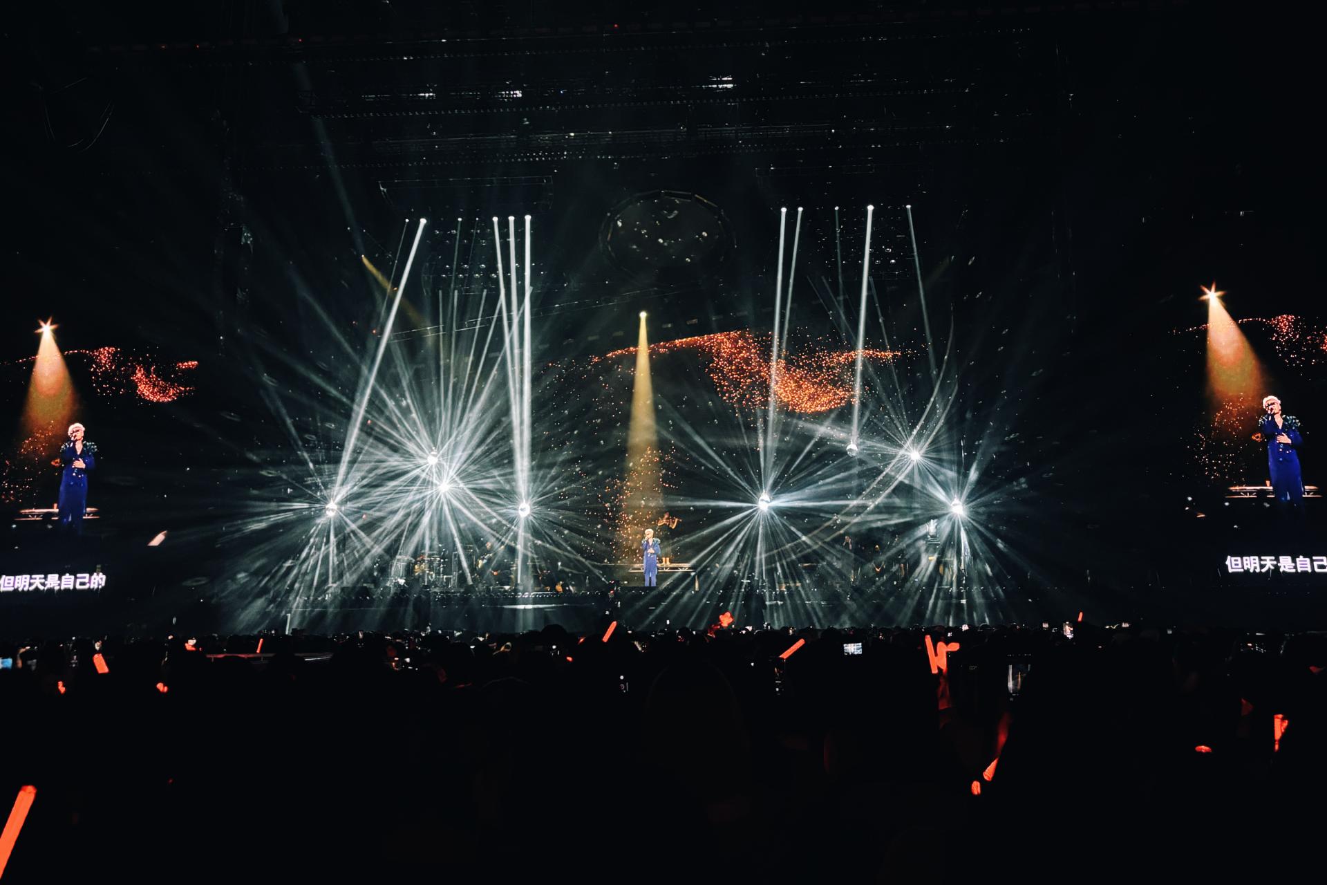 A giant LED installation is designed to be placed at the center of the stage. This concept not only highlights the visual icon of the tour, but also breaks the audience’s conventional impression that stage LEDs are rectangular. The designer believes that the performance space and content should be a whole, which means that the stage and songs should be in a mutually supportive relationship. Consequently, the semi-circular wings are reflected on multiple occasions during the concert. For instance, the rhythm of stage lights, arc-shaped band platform, and semicircular performance area. All of these elements, together with laser, lights, and projection, contribute to the tailor made “white flying bird” stage for the artist.