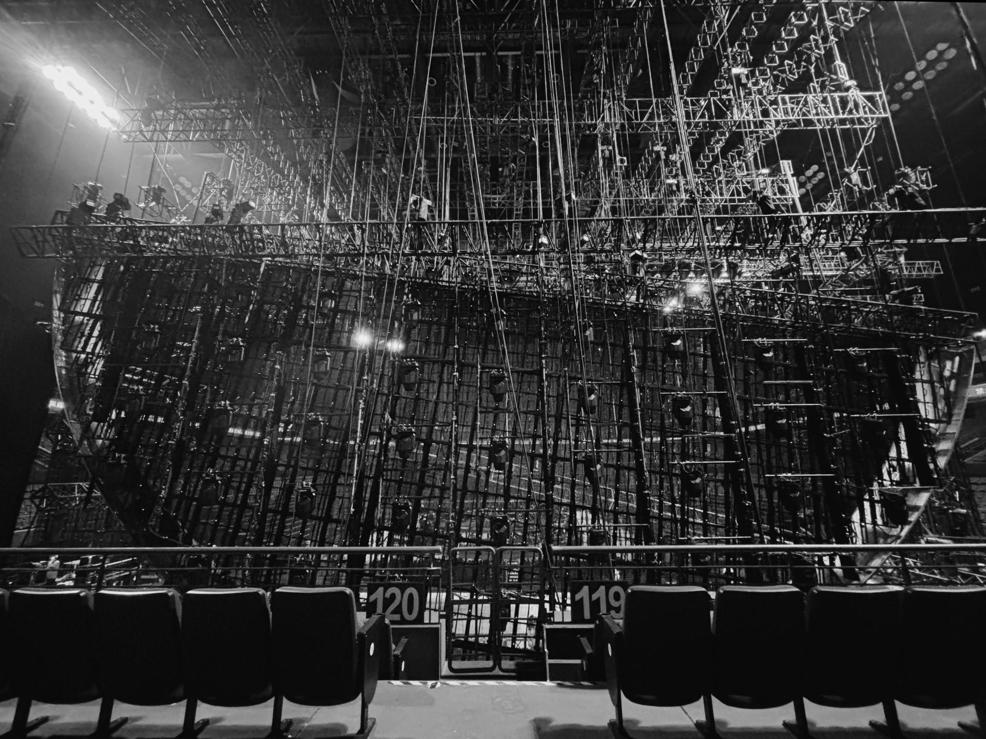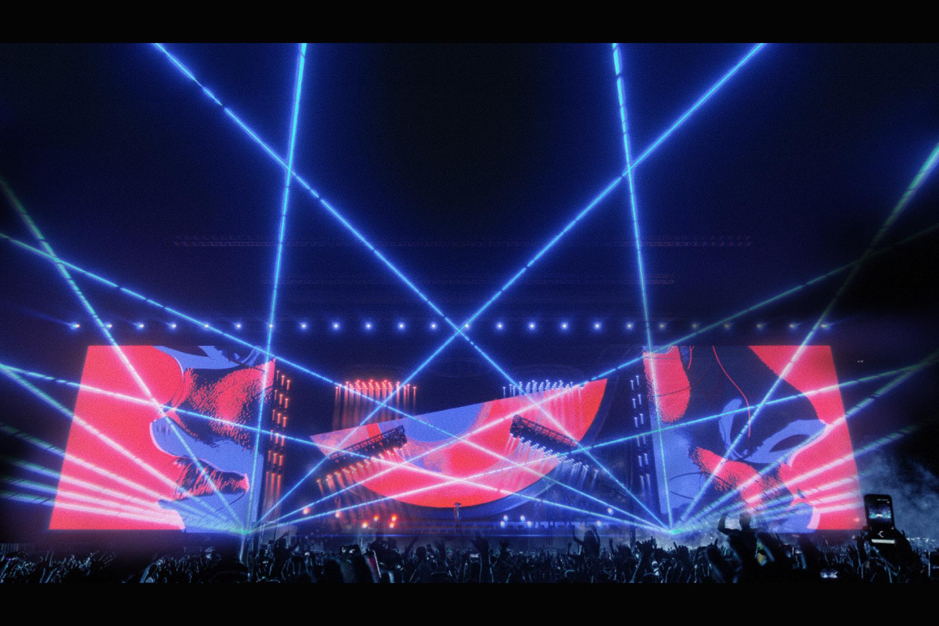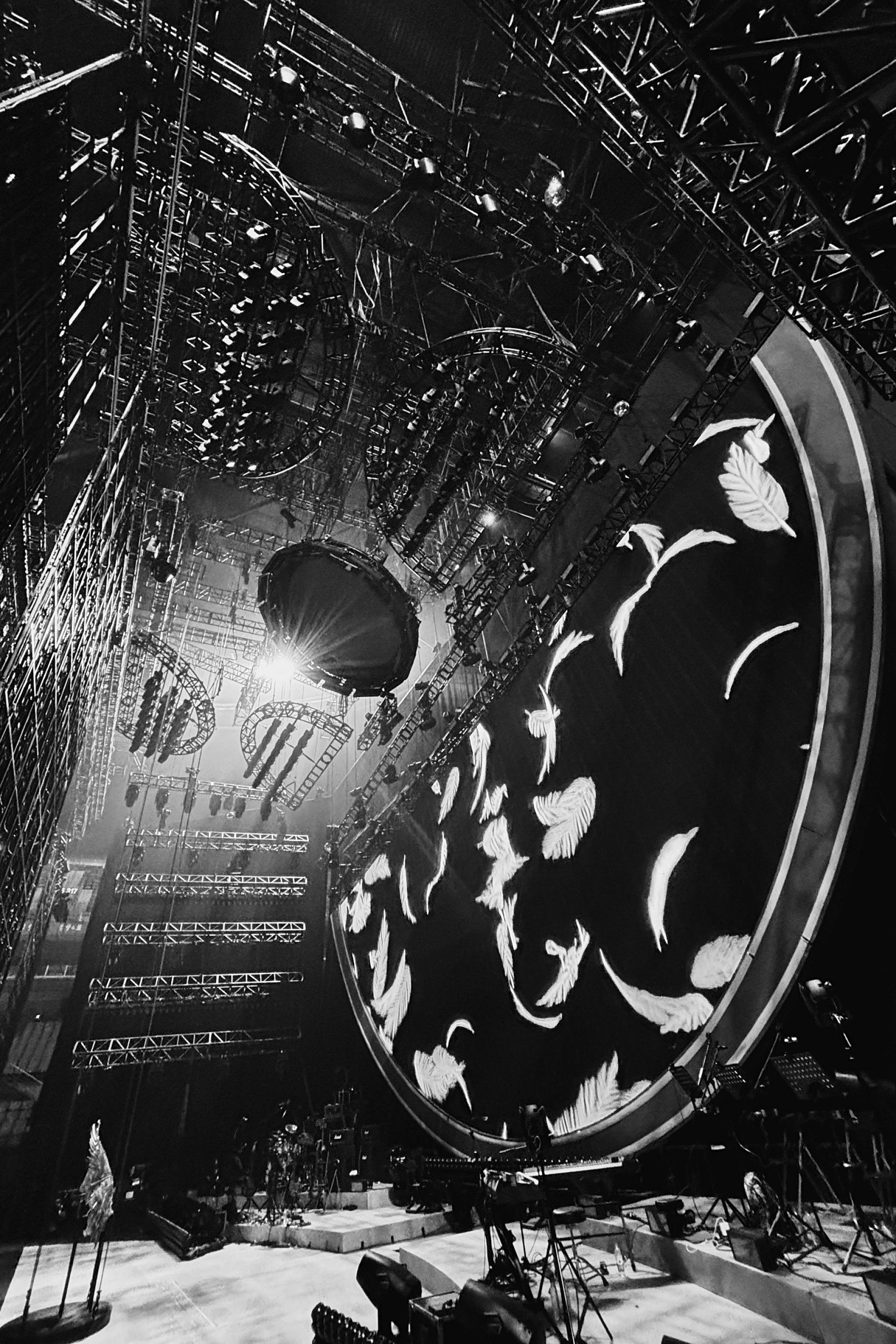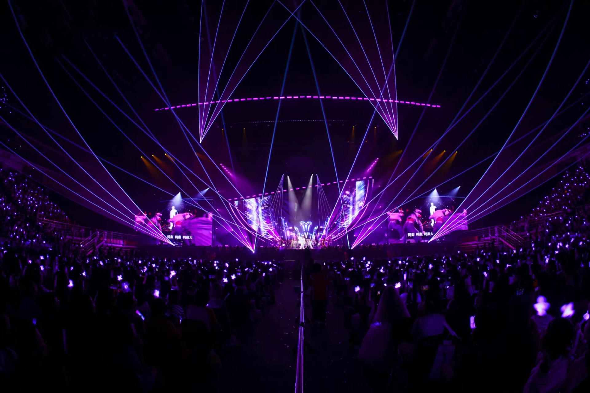 A giant LED installation is designed to be placed at the center of the stage. This concept not only highlights the visual icon of the tour, but also breaks the audience’s conventional impression that stage LEDs are rectangular. The designer believes that the performance space and content should be a whole, which means that the stage and songs should be in a mutually supportive relationship. Consequently, the semi-circular wings are reflected on multiple occasions during the concert. For instance, the rhythm of stage lights, arc-shaped band platform, and semicircular performance area. All of these elements, together with laser, lights, and projection, contribute to the tailor made “white flying bird” stage for the artist.