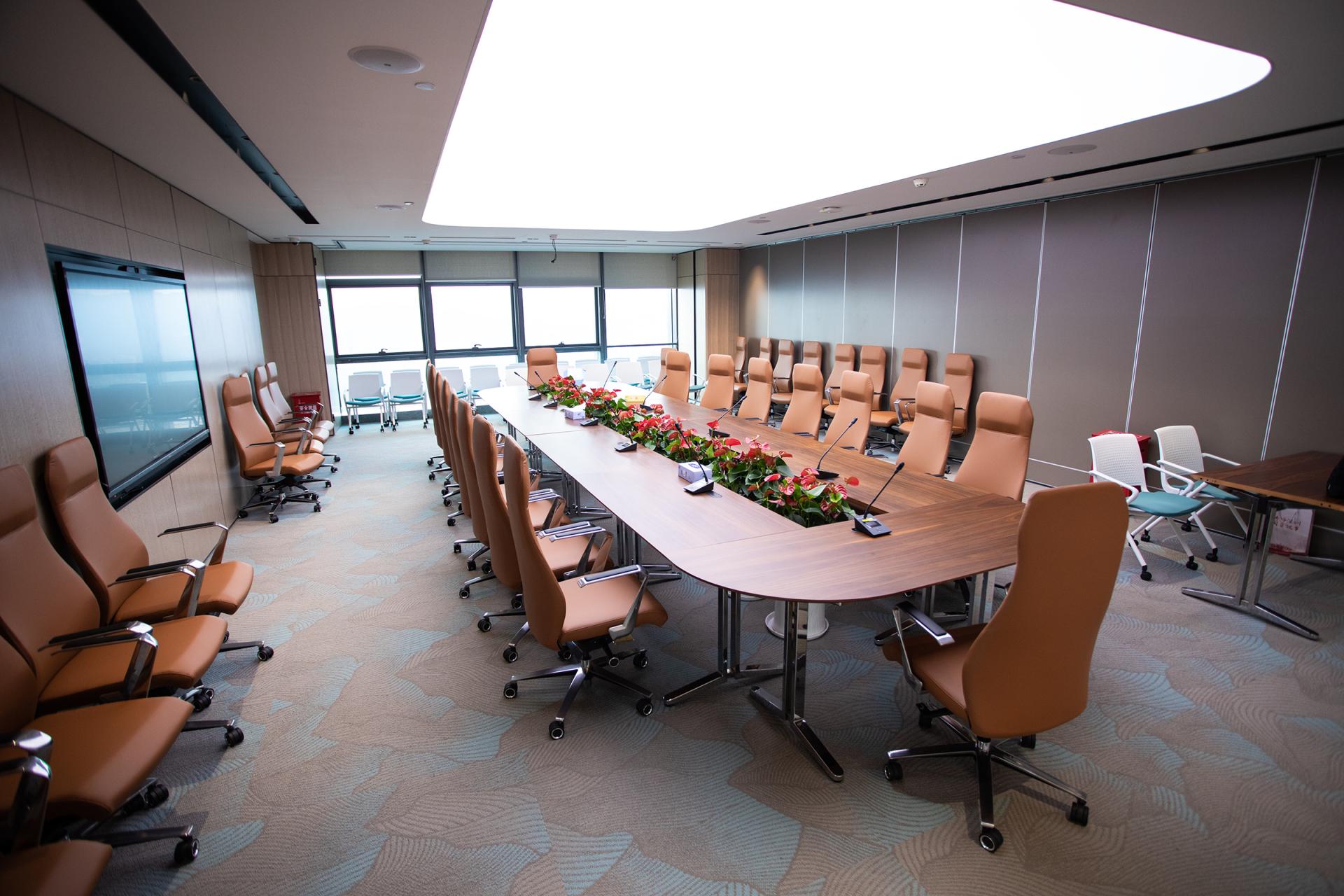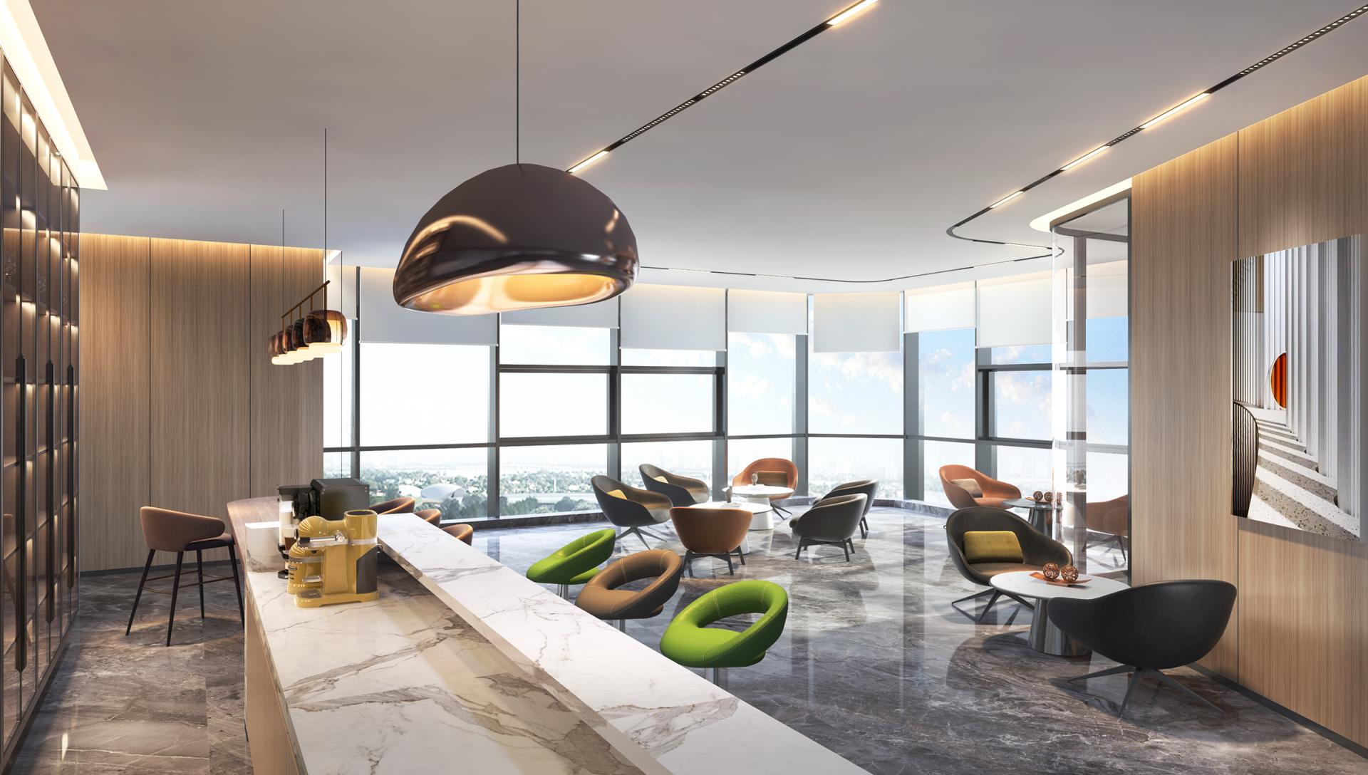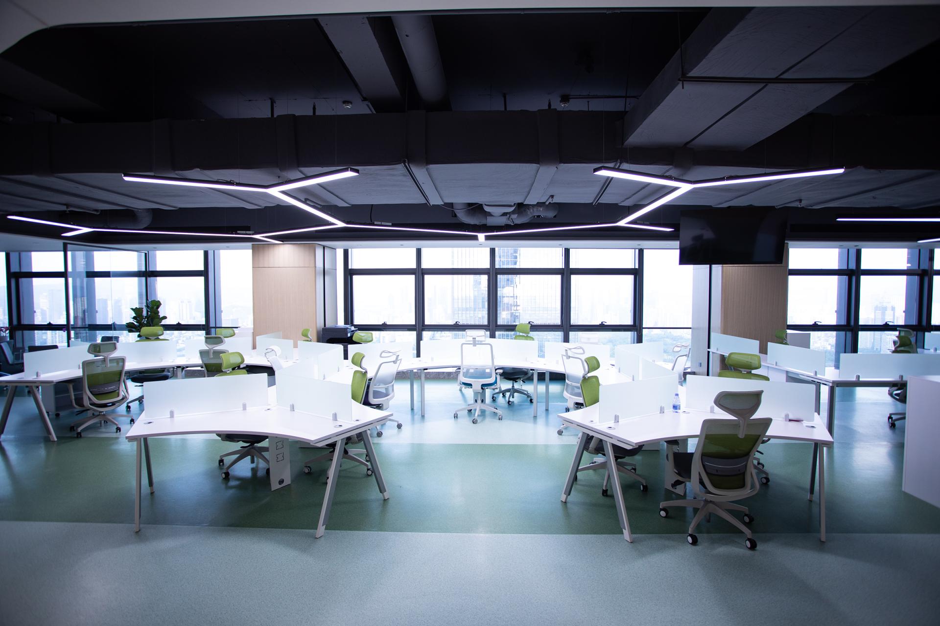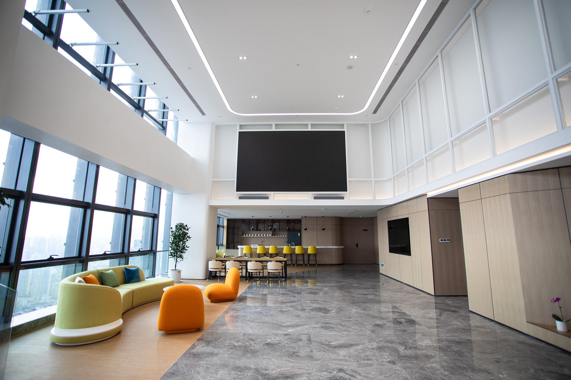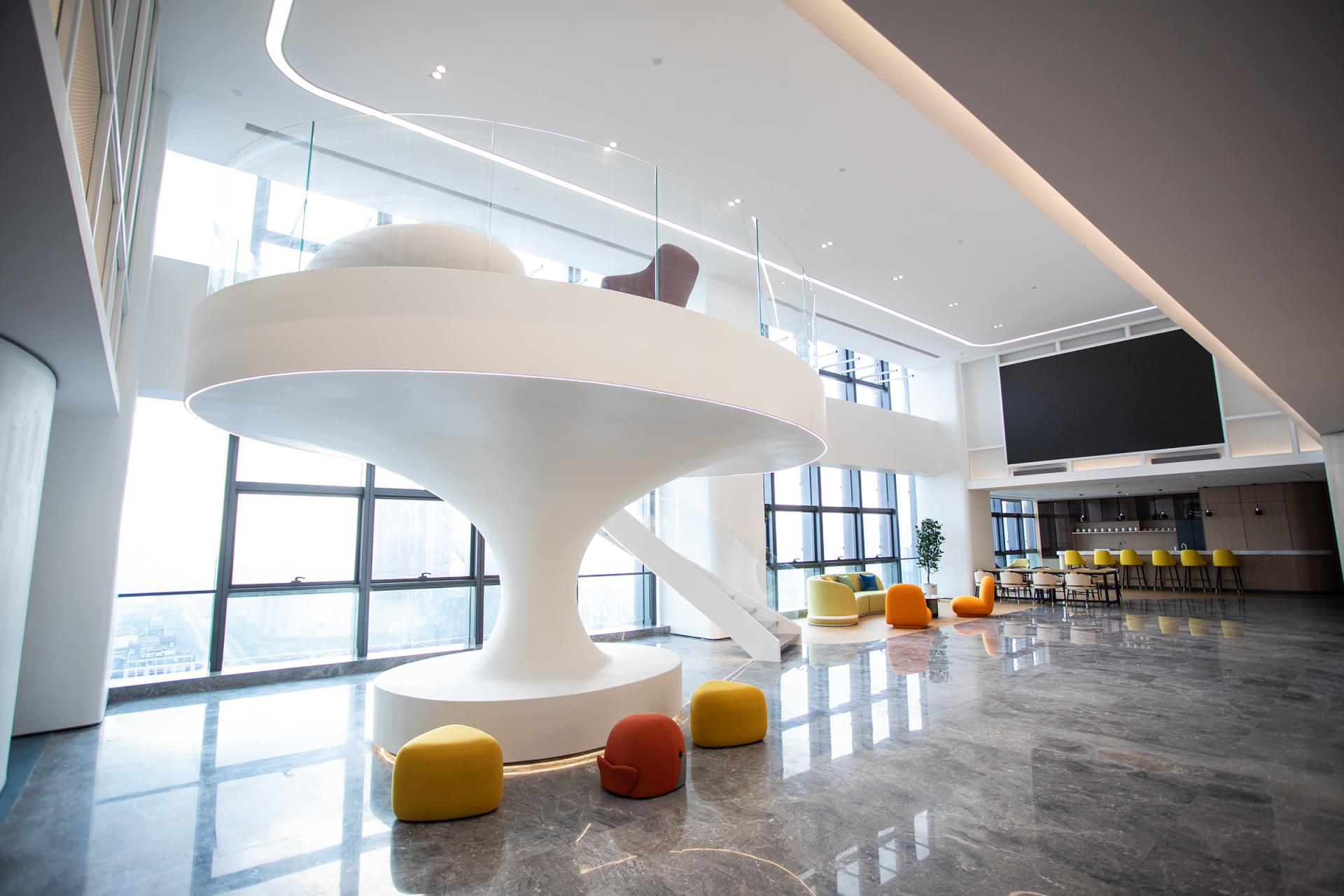 Entering the lobby, what catches the eye is a unique and stylish viewing platform for living alone. As the gold attraction of the project, the white color scheme is the main tone, paired with yellow circular seats, creating a vivid color contrast and becoming the visual focus. It is both simple and lively. The glass staircase on the right cleverly guides the line of sight through a practical and beautiful layout, not only adding transparency to the space but also making it appear more spacious. The LED display screen above the lobby, combined with a white metal expansion net, not only serves as a decorative element but also enhances the interactivity of the space. The walls and ceilings, which still maintain a white tone, complement the marble texture of the ground, creating an elegant and comfortable atmosphere. Entering the right-hand side of the lobby and arriving at the conference space, in order to ensure the smooth progress of the meeting and provide sufficient communication space for in-depth discussions, it adopts a modern and simple design style, making the space appear open and bright, creating a comfortable, soft, and fresh conference environment for users. Through carefully arranged rectangular conference tables and chairs, combined with uniquely designed carpets, the entire space environment is filled with warmth and harmony. Through these design highlights, a practical and aesthetically pleasing conference environment has been jointly created, meeting the dual needs of functionality and aesthetics in modern conferences. Adjacent to the conference room is the public office space, a highly modern office scene. In order to embody a unique modern aesthetic, the entire office adopts a simple and efficient design, using soft and bright lighting to emanate from geometric lamps hanging from the ceiling, expressing a practical facility and a focused working atmosphere, creating a space that is both conducive to employee work and can stimulate creativity. This kind of office environment undoubtedly improves employees' work efficiency and satisfaction, and is an important manifestation of the enterprise's pursuit of efficient development.