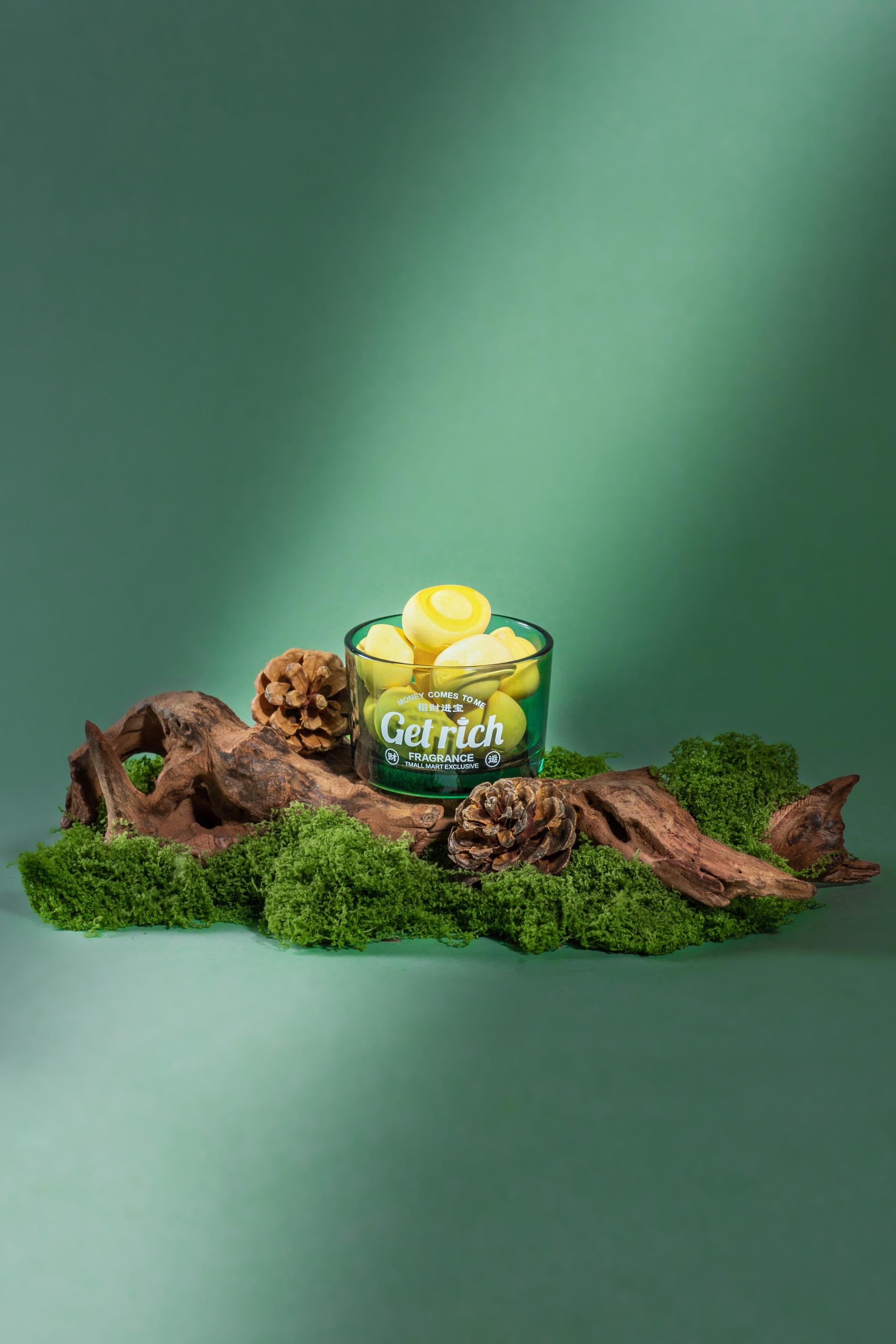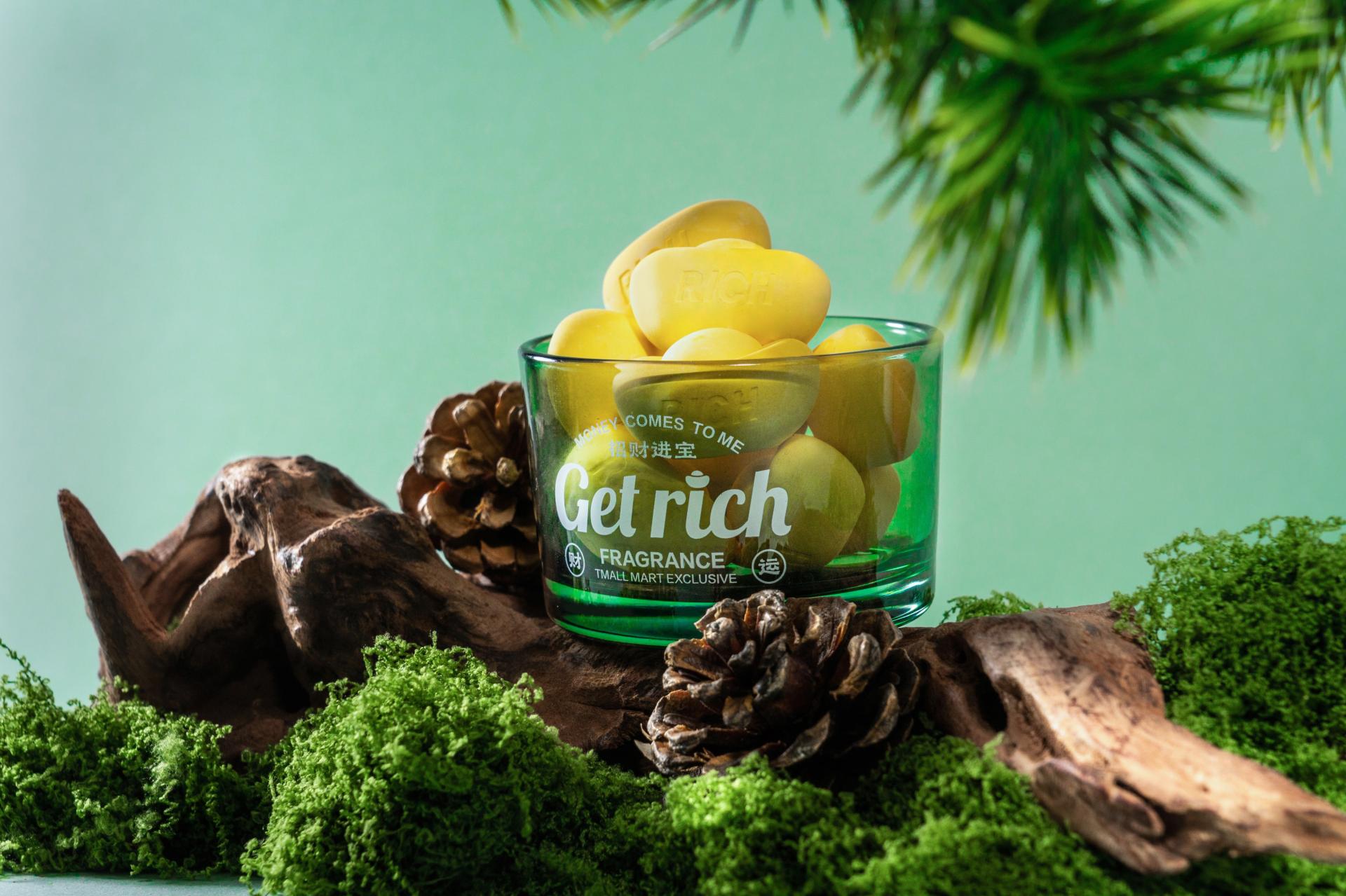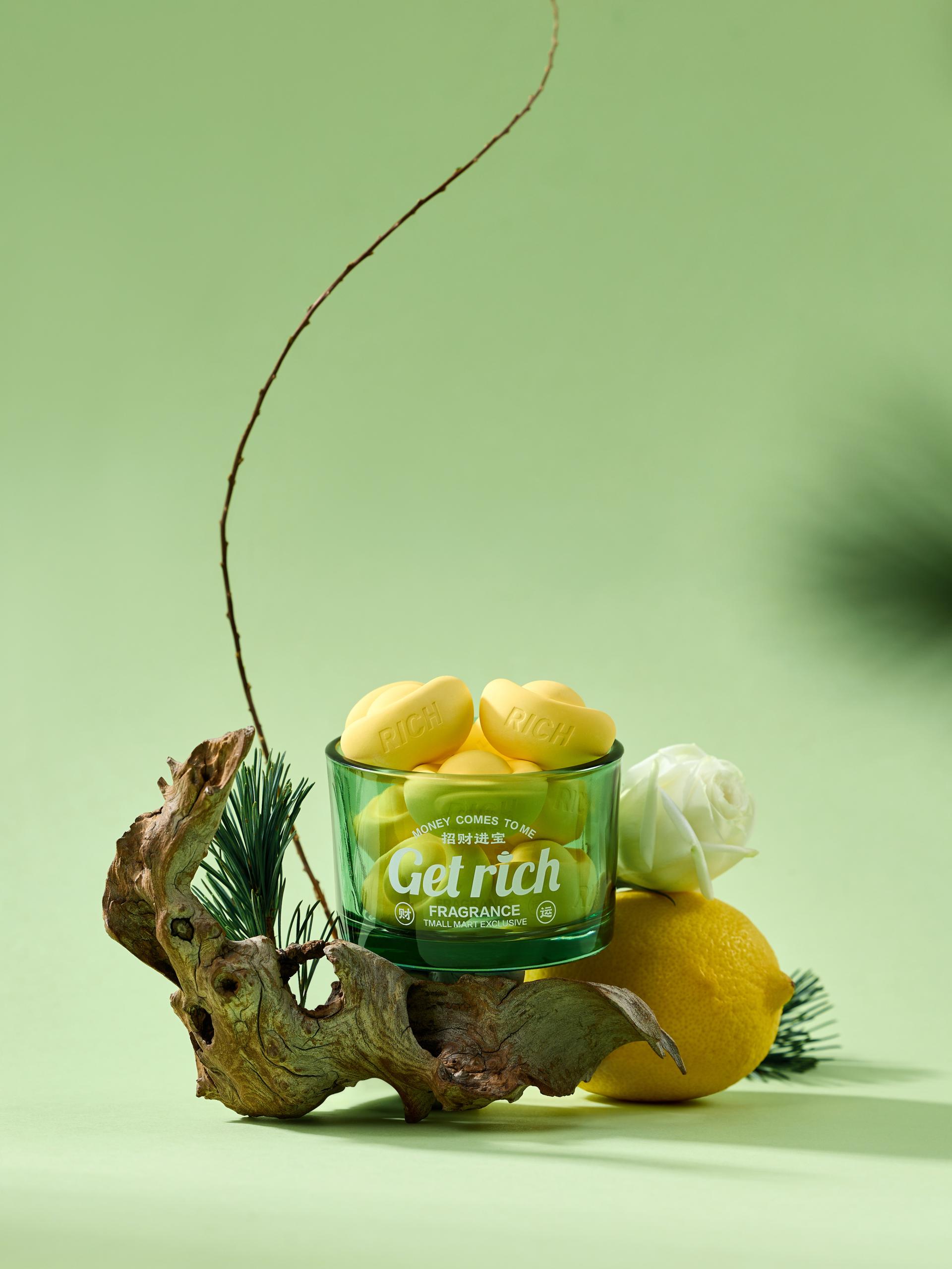 The gift box includes a glass aromatherapy cup, nine solid fragrance stones shaped like Yuanbao (a gold ingot), and a bottle of essential oil. The cup is crafted from transparent green glass, allowing for easy visibility of its contents and enhancing its visual appeal. The fragrance stones are meticulously handmade in the form of small Yuanbao, which have historically represented wealth in Chinese culture. The design of the nine fragrance stones, both in number and size, is expertly crafted to rest just above the container without falling off, symbolizing the secure retention of wealth even as it overflows. Furthermore, the number “nine” in Chinese culture signifies longevity, enriching the cultural significance and auspicious implications of the gift box.