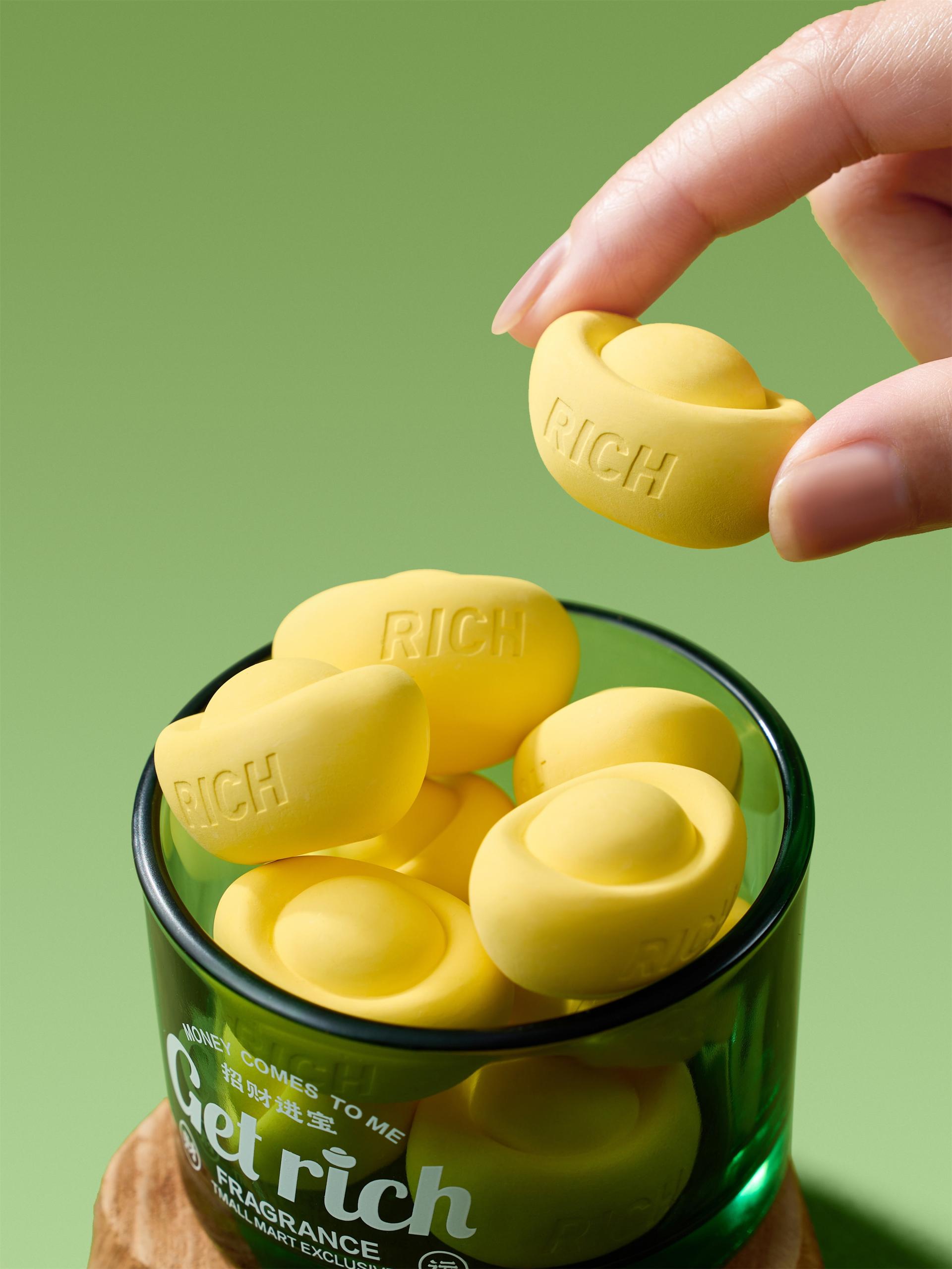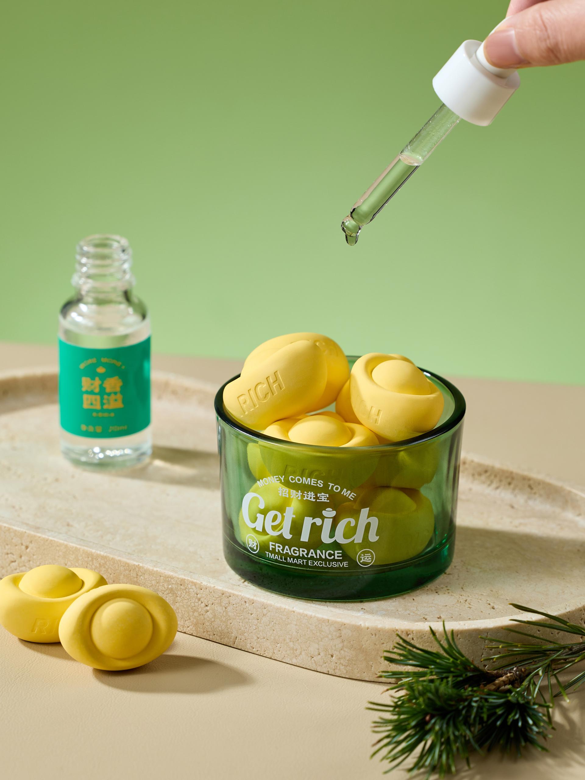 Upon the application of essential oil, the initially light gold Yuanbao fragrance stone transforms into a more radiant deep gold, as if the gold has been washed and restored to its primitive brilliance. The solid balm resembles a treasure trove of gold, loaded with beauty and auspicious symbolism.