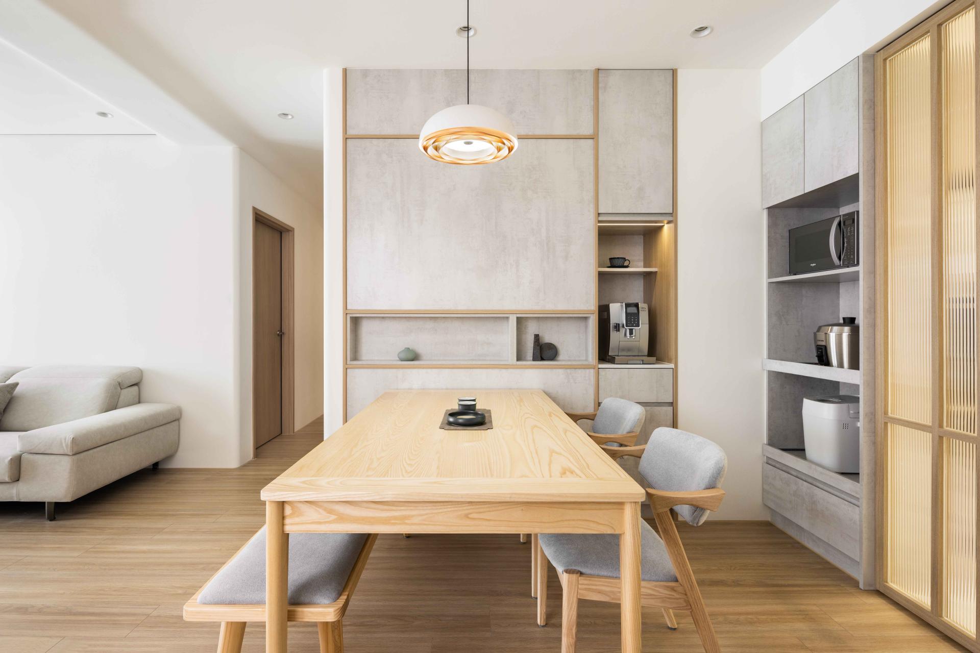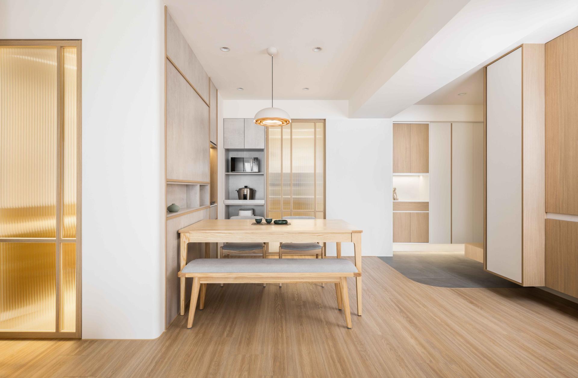 In the dining area, a warm wooden table is paired with upholstered chairs and benches, encouraging family interaction. Built-in display shelves with gray accents, wooden framing, and textured Moru glass add depth and functional elegance. The circular wooden-ring pendant light enhances the atmosphere with a soft, inviting glow.