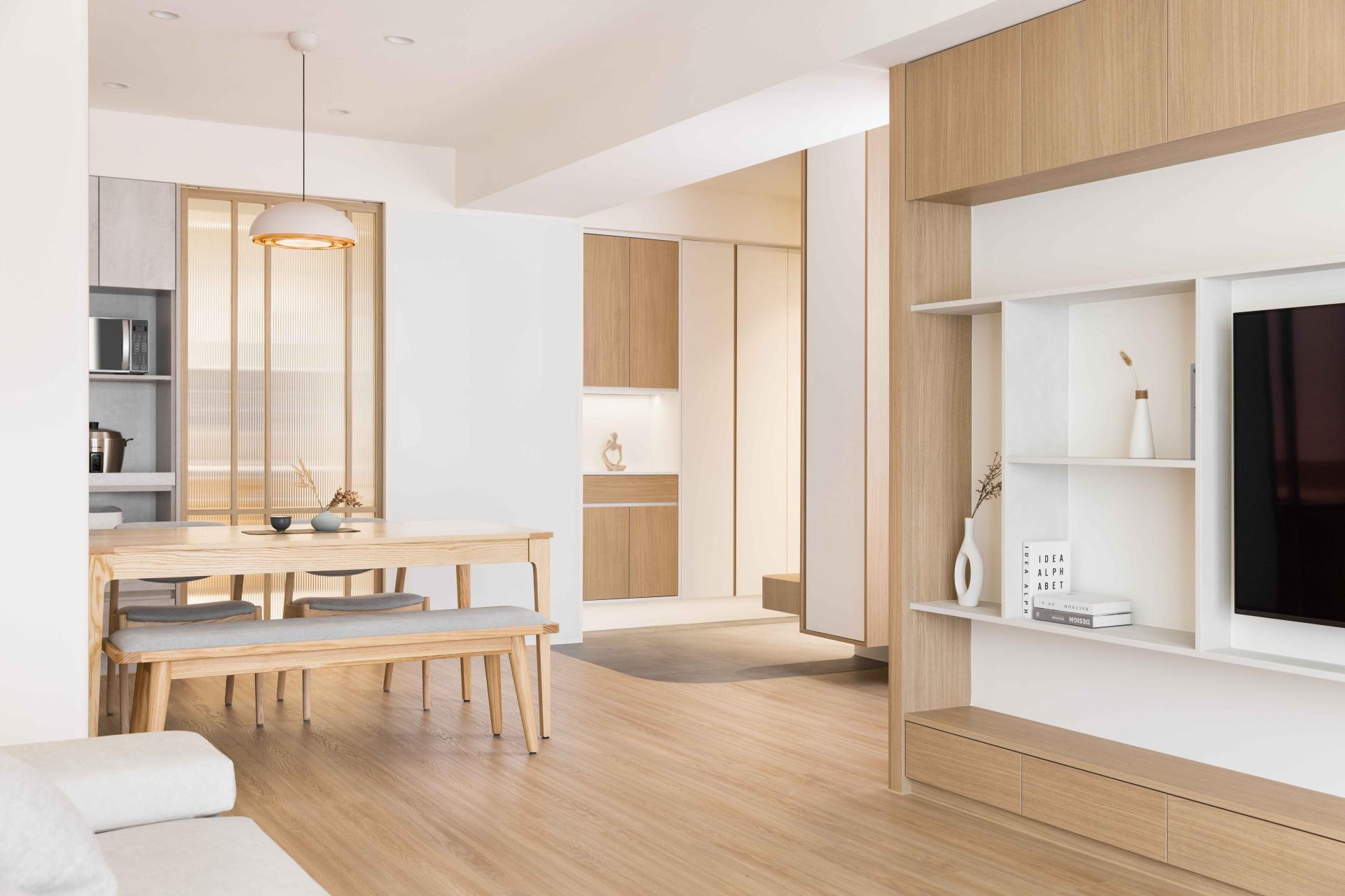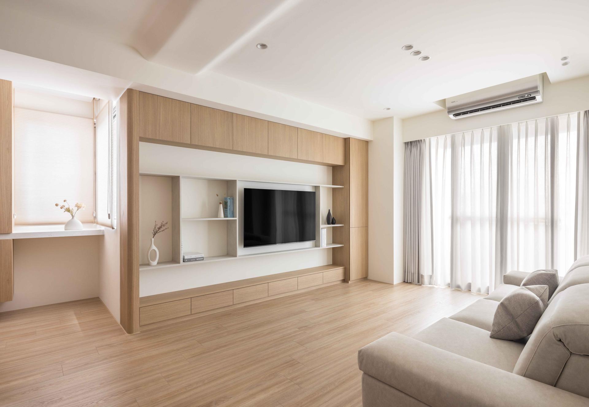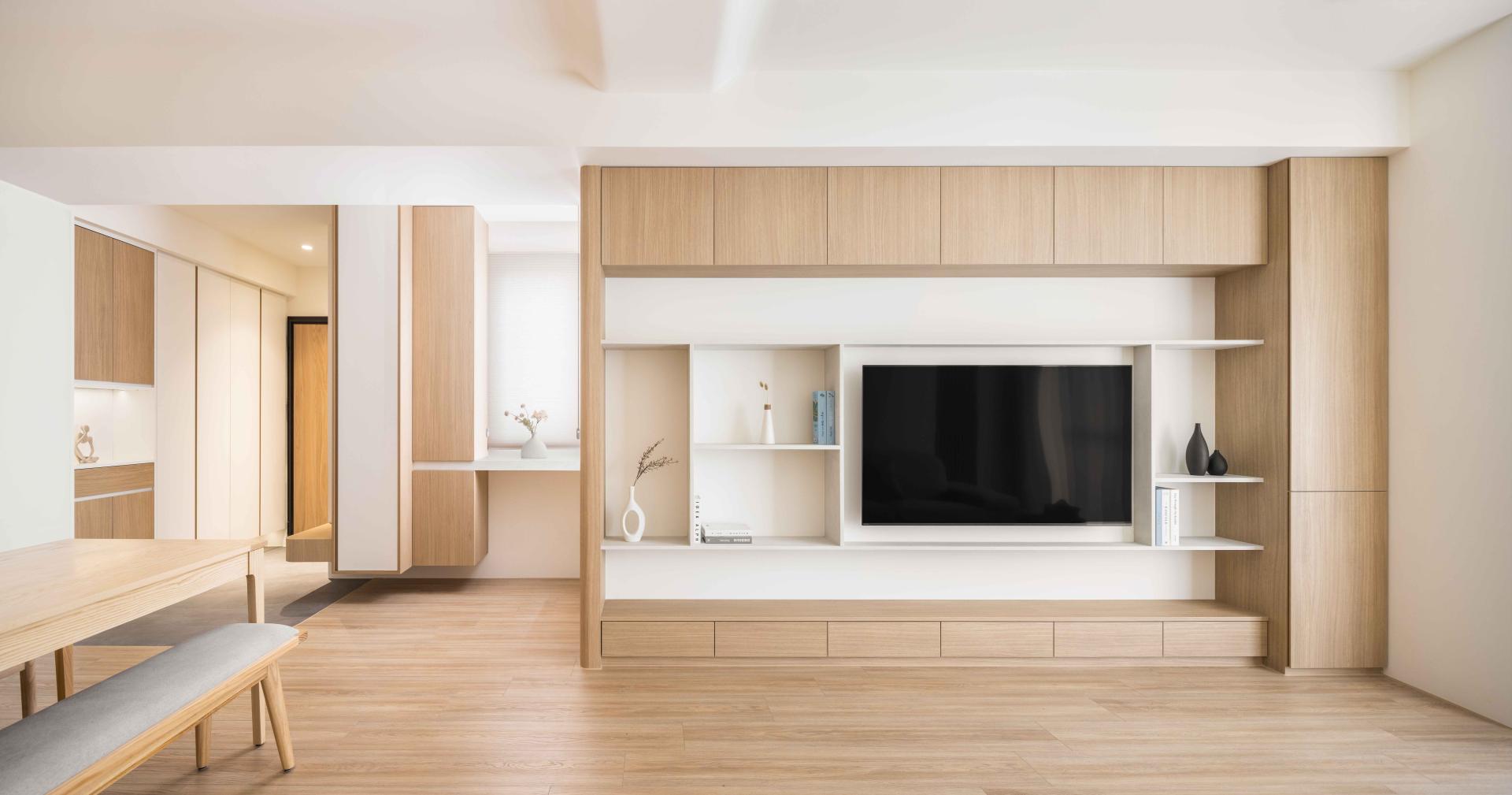 The open-plan layout connects the living room, dining area, and kitchen, fostering a sense of spaciousness and continuity. Central to the design is the living room's TV wall, which combines wooden and white shelving for both visual appeal and ample storage. Rounded edges on structural beams soften their impact, contributing to a cohesive and refined space. Light wood floors and cream-colored furniture complement the abundant natural light from floor-to-ceiling windows, creating a serene and inviting ambiance.