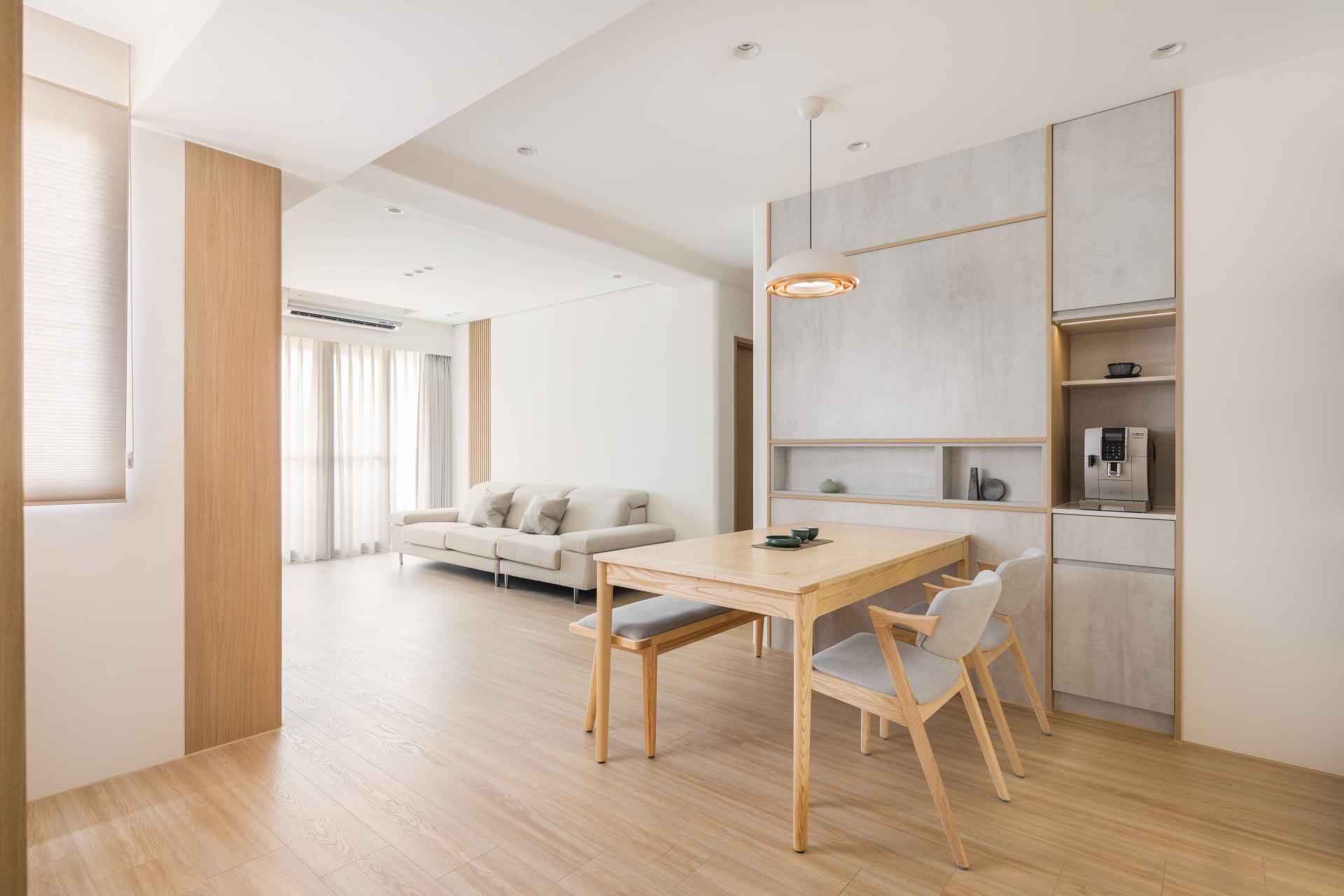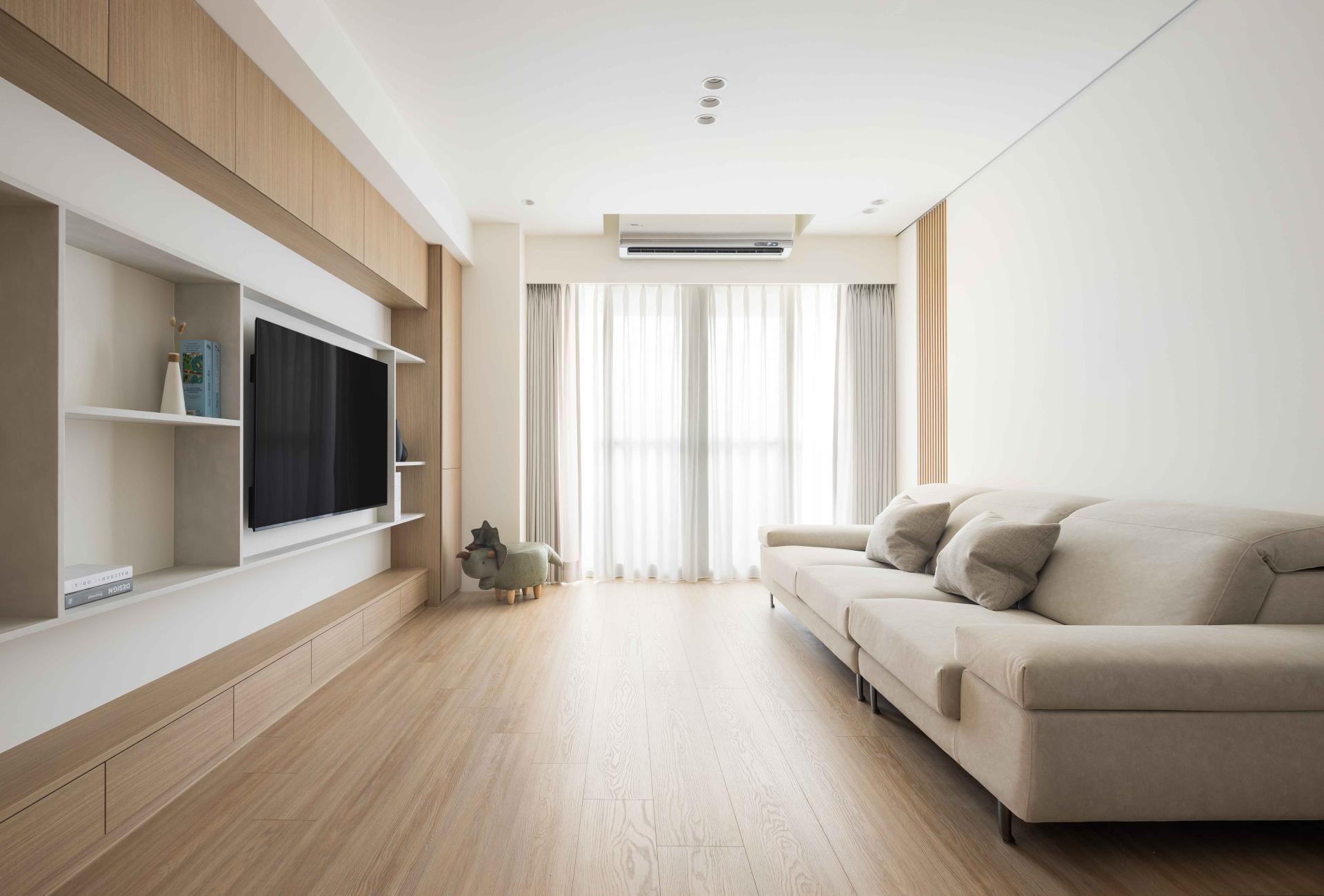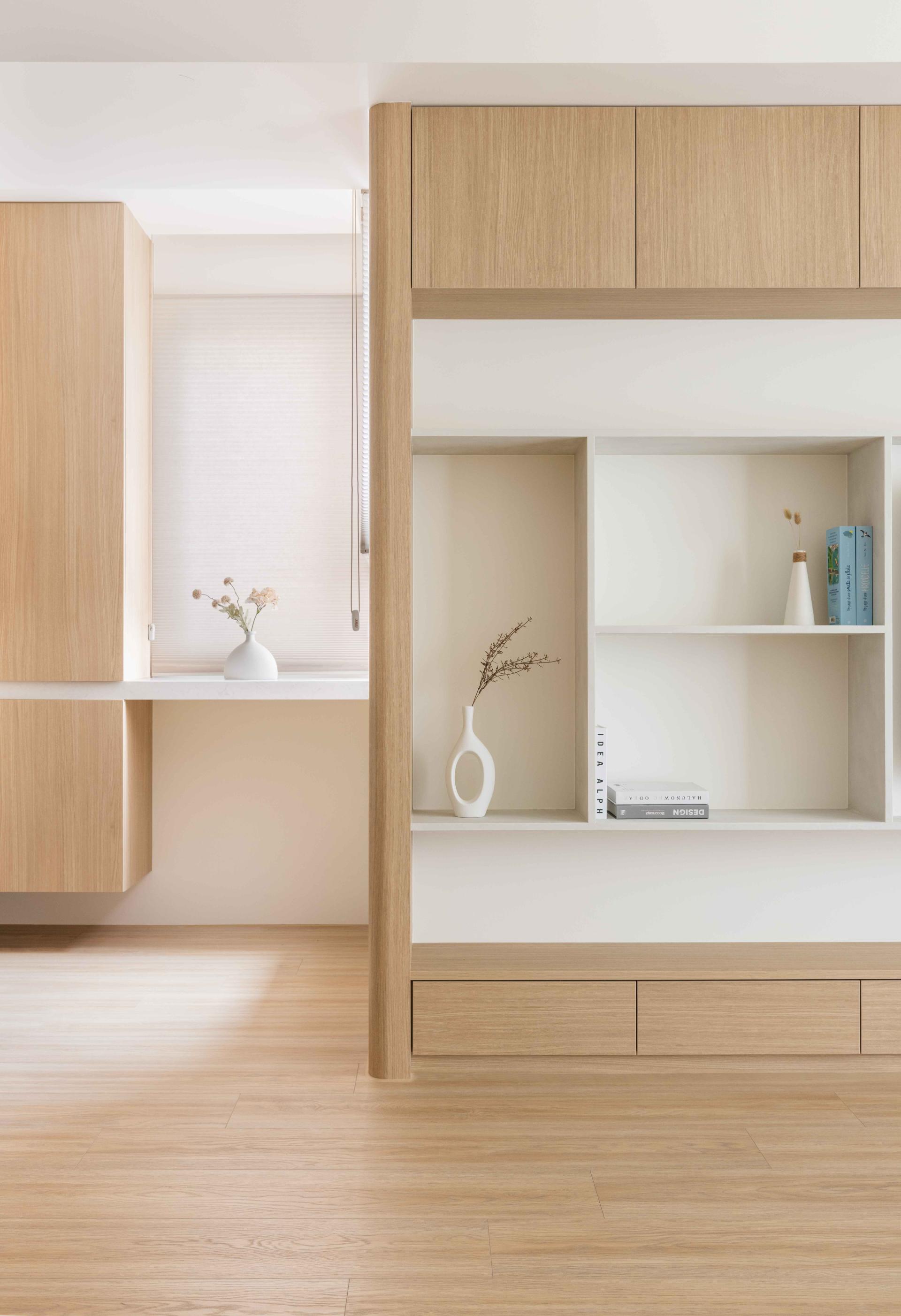 The open-plan layout connects the living room, dining area, and kitchen, fostering a sense of spaciousness and continuity. Central to the design is the living room's TV wall, which combines wooden and white shelving for both visual appeal and ample storage. Rounded edges on structural beams soften their impact, contributing to a cohesive and refined space. Light wood floors and cream-colored furniture complement the abundant natural light from floor-to-ceiling windows, creating a serene and inviting ambiance.