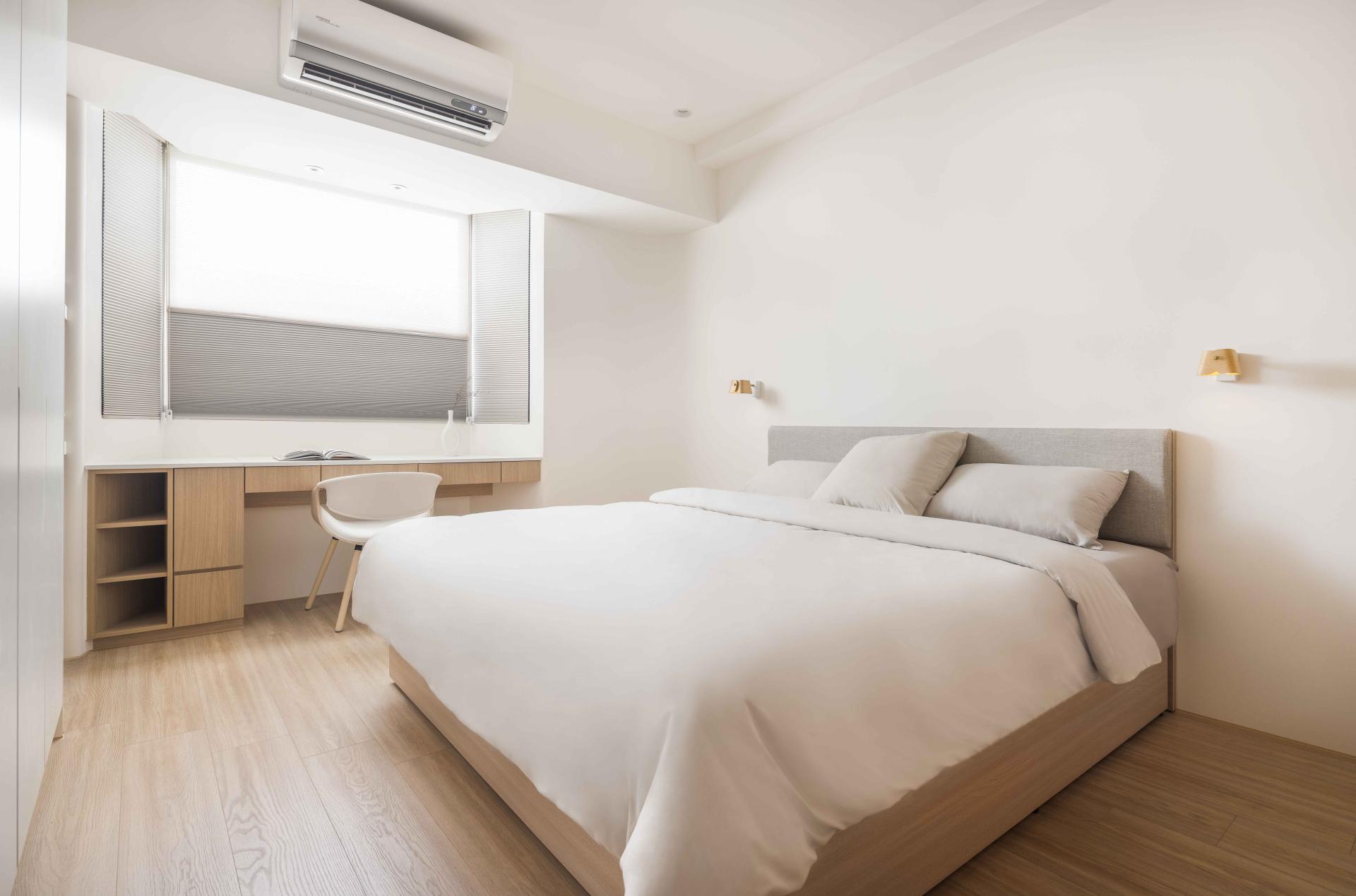 The bedrooms are private sanctuaries of tranquility, with a neutral color palette of light gray and cream paired with functional built-in furniture. Dual-layer blinds and blackout curtains provide flexible lighting control. The kitchen emphasizes clean organization, with gray-white cabinets, integrated appliances, and concealed storage to maintain visual harmony. The bathroom continues this approach, combining light gray marble-effect tiles, wooden cabinetry, and transparent partitions for a fresh, spacious feel.