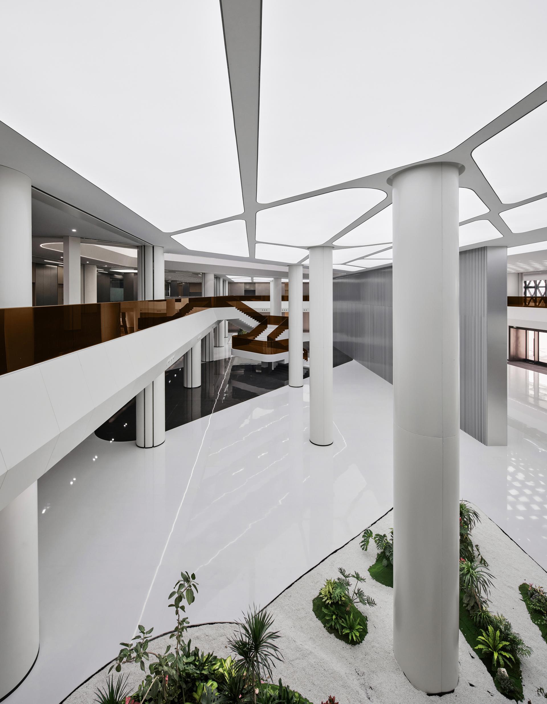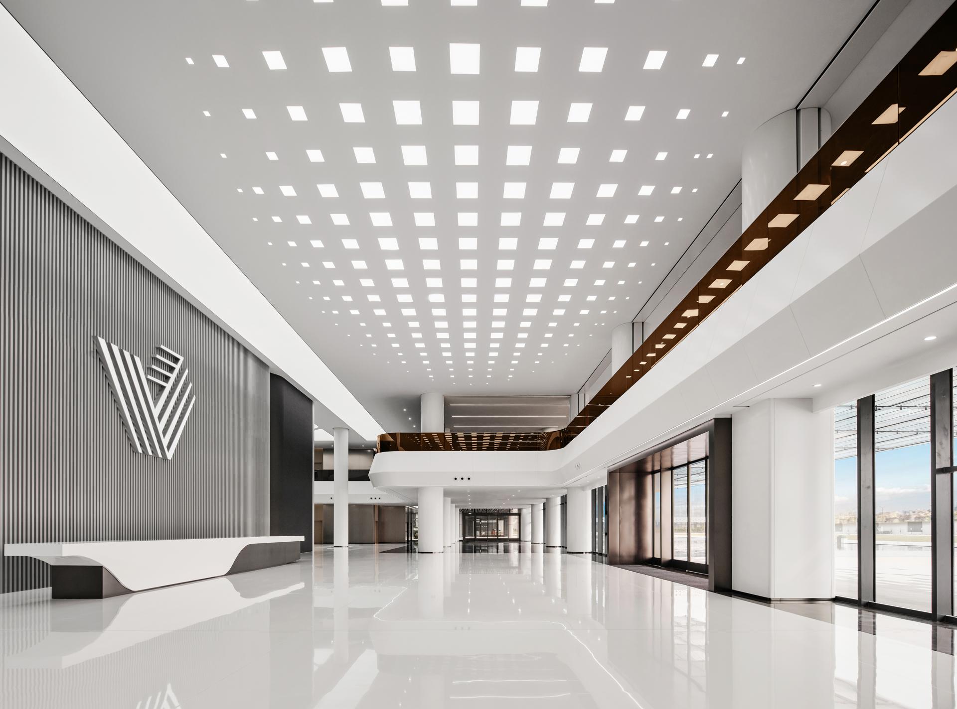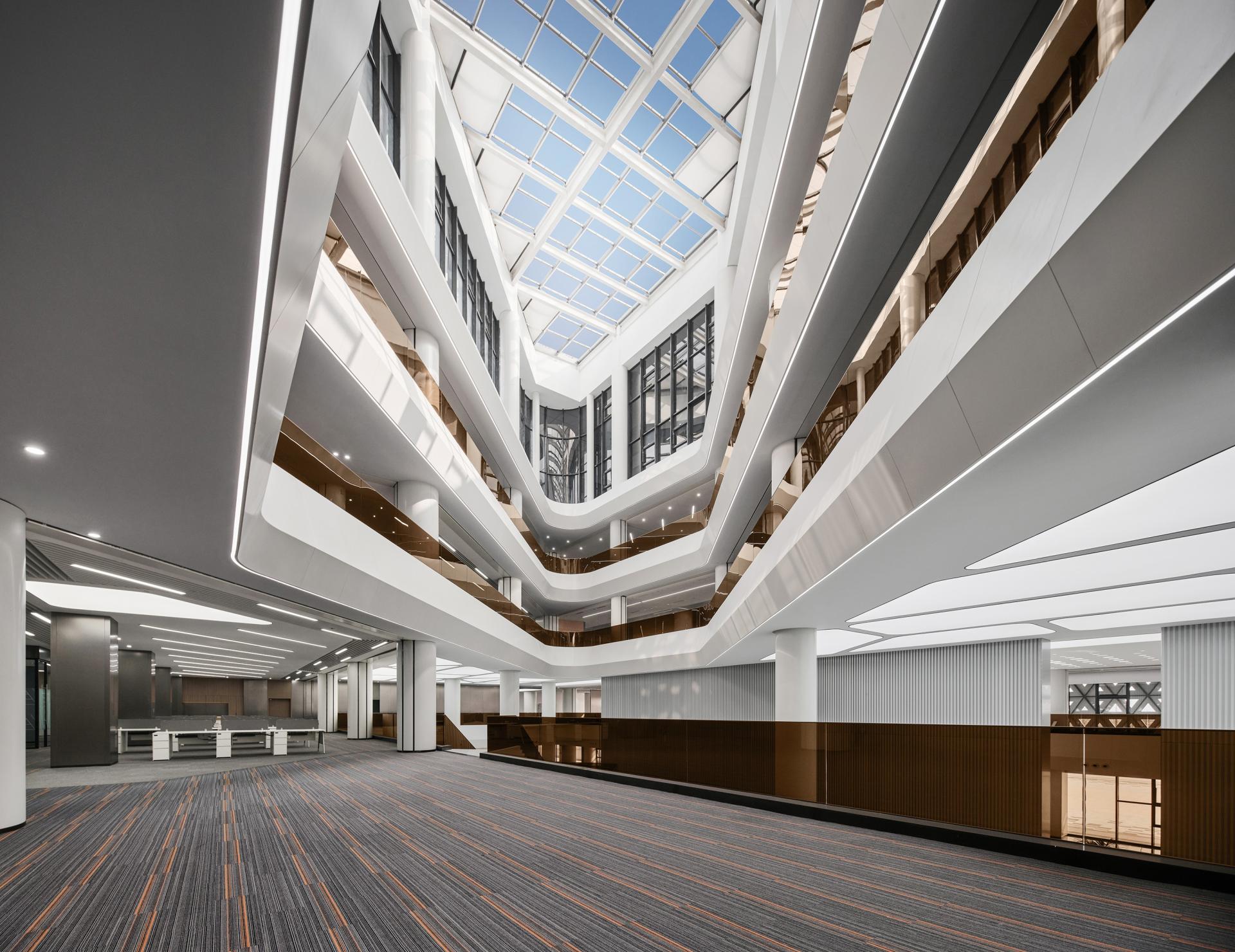 The interior design of this project was involved from the early stages of architectural planning to ensure the simultaneous advancement of architecture, landscape, and interior design. The architectural design of the administrative service center blends modern design techniques and innovative materials, realizing the traditional Chinese concept of “Four Waters Returning to the Hall.” The interior design incorporates layered greenery to introduce natural landscapes, maximizing the interior and exterior views. For the few private offices, electrochromic glass partitions were used, maintaining the openness of large spaces while ensuring privacy for individual rooms, without compromising the natural light and landscape views in the public office areas. The overall color scheme employs a minimalist use of black, white, and gray, with accents of the company’s brand colors, which emphasize a sense of technology and modernity, highlighting the unique identity and personality of the company.