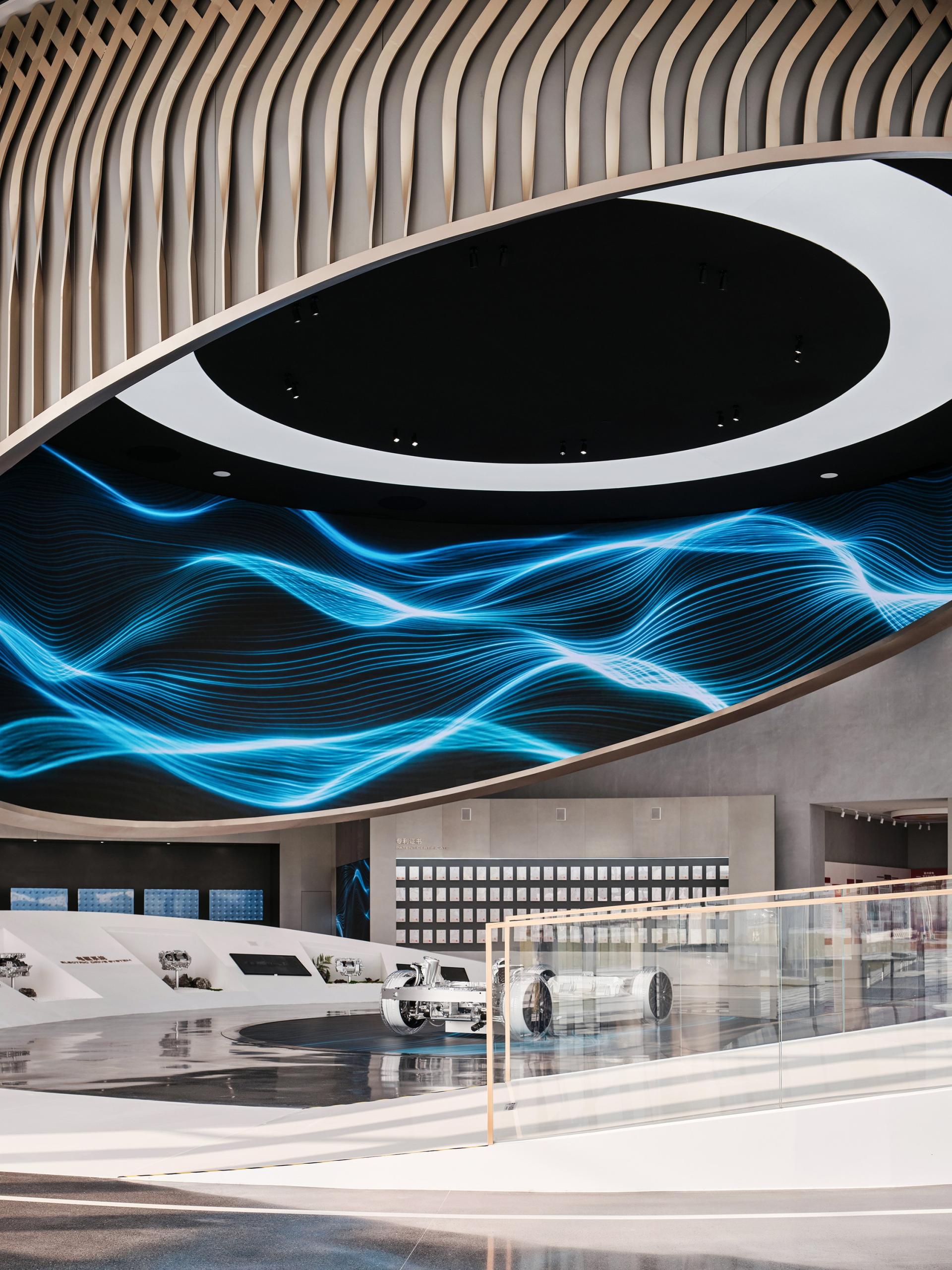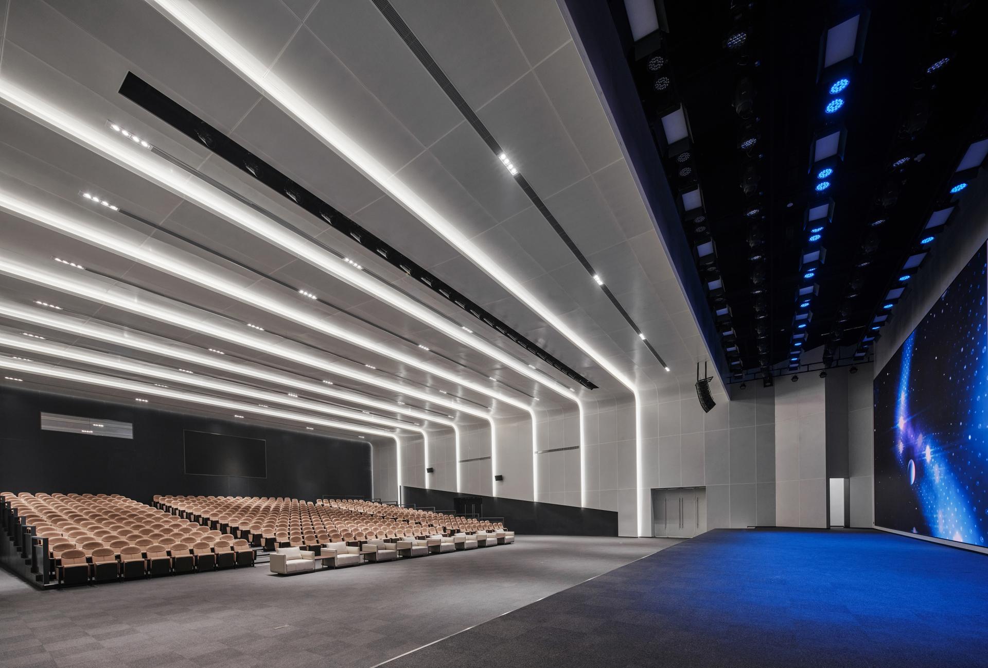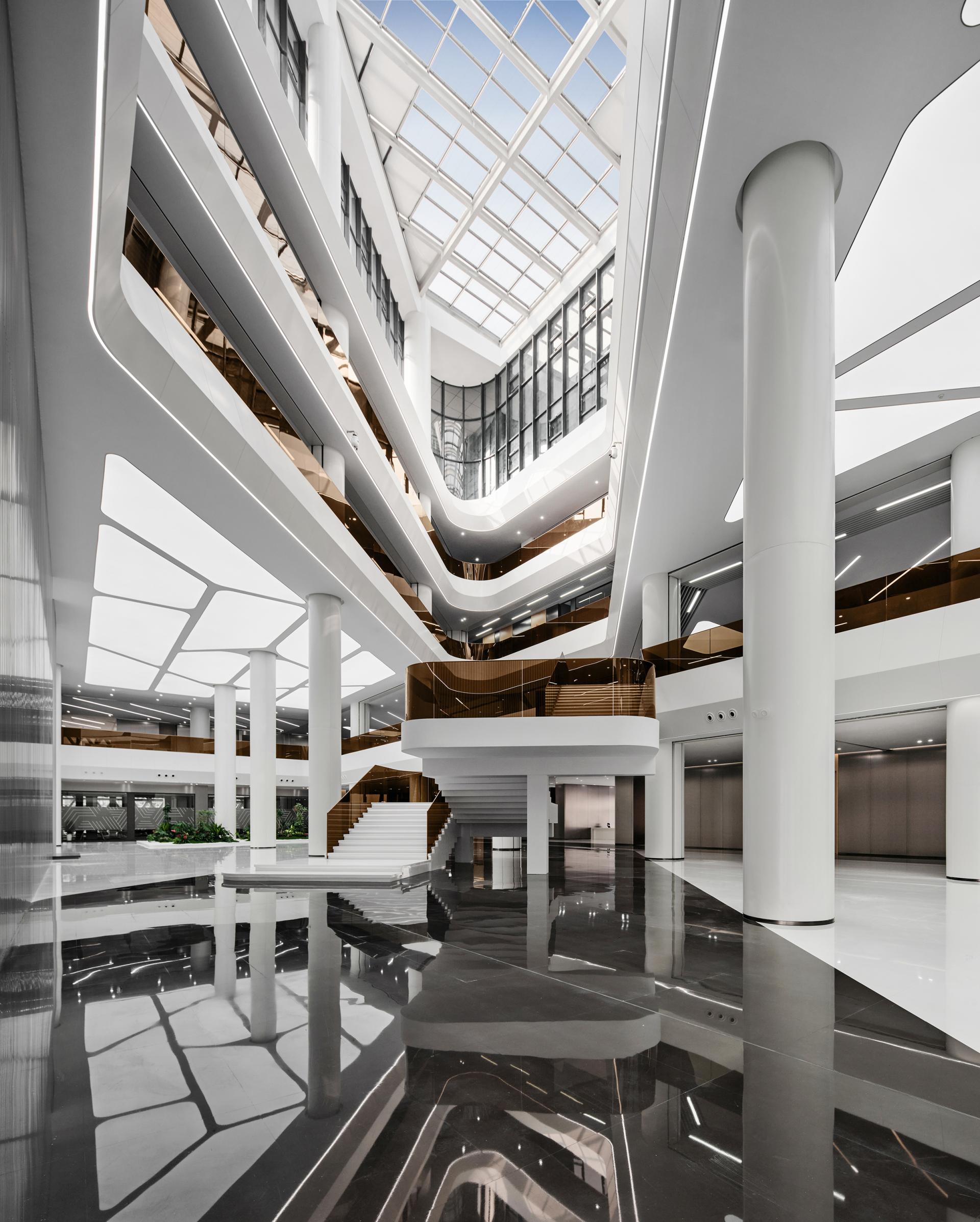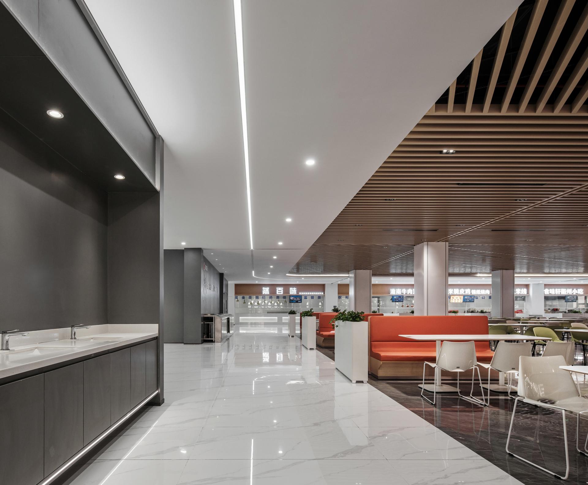 The interior design of this project was involved from the early stages of architectural planning to ensure the simultaneous advancement of architecture, landscape, and interior design. The architectural design of the administrative service center blends modern design techniques and innovative materials, realizing the traditional Chinese concept of “Four Waters Returning to the Hall.” The interior design incorporates layered greenery to introduce natural landscapes, maximizing the interior and exterior views. For the few private offices, electrochromic glass partitions were used, maintaining the openness of large spaces while ensuring privacy for individual rooms, without compromising the natural light and landscape views in the public office areas. The overall color scheme employs a minimalist use of black, white, and gray, with accents of the company’s brand colors, which emphasize a sense of technology and modernity, highlighting the unique identity and personality of the company.