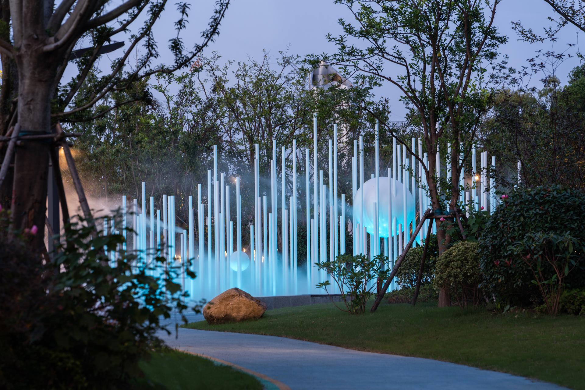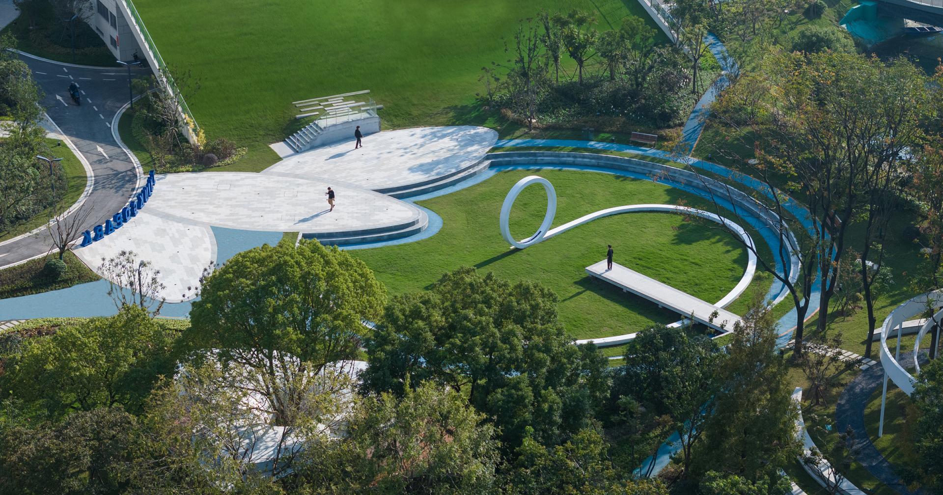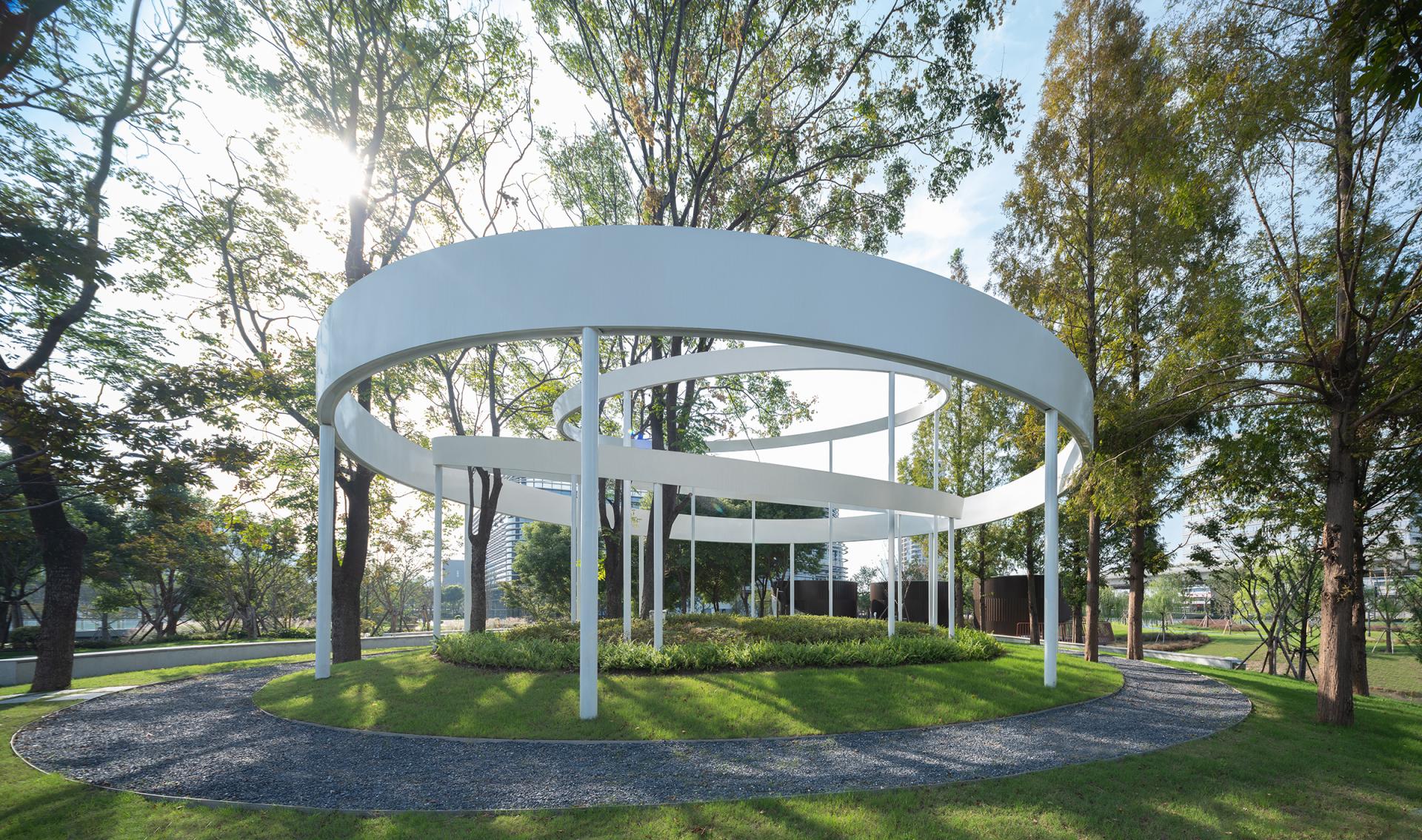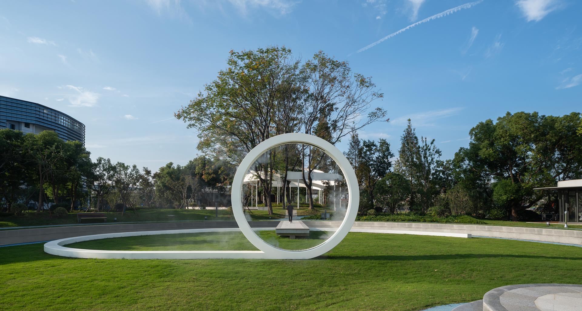 The Haier (Wuxi) iot Ecological Network Demonstration Base is situated in the core area of the Southern Jiangsu Independent Innovation Demonstration Zone. We envision Haiguanzhigu Technology Park as a place to document the passage of time, capturing the city’s development and transformation. It is a space where everyone can not only experience innovative design but also feel the unique charm of Wuxi.The design draws inspiration from Wuxi’s historical and cultural heritage as well as its modern development, encapsulating the concept of “Recalling the Past, Reflecting the Present, Envisioning the Future.” With a narrative thread of "Memory–Continuity–Transition–Fusion," the design invites participants to embark on a journey through the city’s evolving story.The design retains the original site’s ecological features, incorporating natural growth patterns into the landscape. Existing water systems and pine forests are preserved, allowing nature to seamlessly coexist with the city. Paying homage to Wuxi’s historic textile industry, the design employs sculptural weaving and sequential patterns to create dynamic, flowing elements that integrate the spirit of traditional crafts into the modern era. Illuminated mist and dynamic light effects enhance the interactive experience of the installations at night. The design features three circular platforms symbolizing the interconnectedness of all things and the infinite evolution of wisdom, technology, and aspirations for a better life. A suspended bridge connects two circular platforms, leading to the main building—both narrating history and guiding visitors toward the future. A grass-stepped amphitheater below creates a cohesive green core for the park. At its center, the "Technology Ring" acts as a symbolic focal point, transforming memory into a tangible landmark and a new icon.At night, holographic projections on the circular platforms tell the story of Wuxi’s rich culture. A small pine forest and a set of "spiral rings" form the core elements of this design. By preserving the existing pine trees and allowing visitors to freely explore beneath them, the design bridges the visual gap between the pines and the park’s small hills. The spiral rings weave through the trees, creating a sense of convergence, drawing energy and visitors, and leaving a memorable visual and spatial experience.