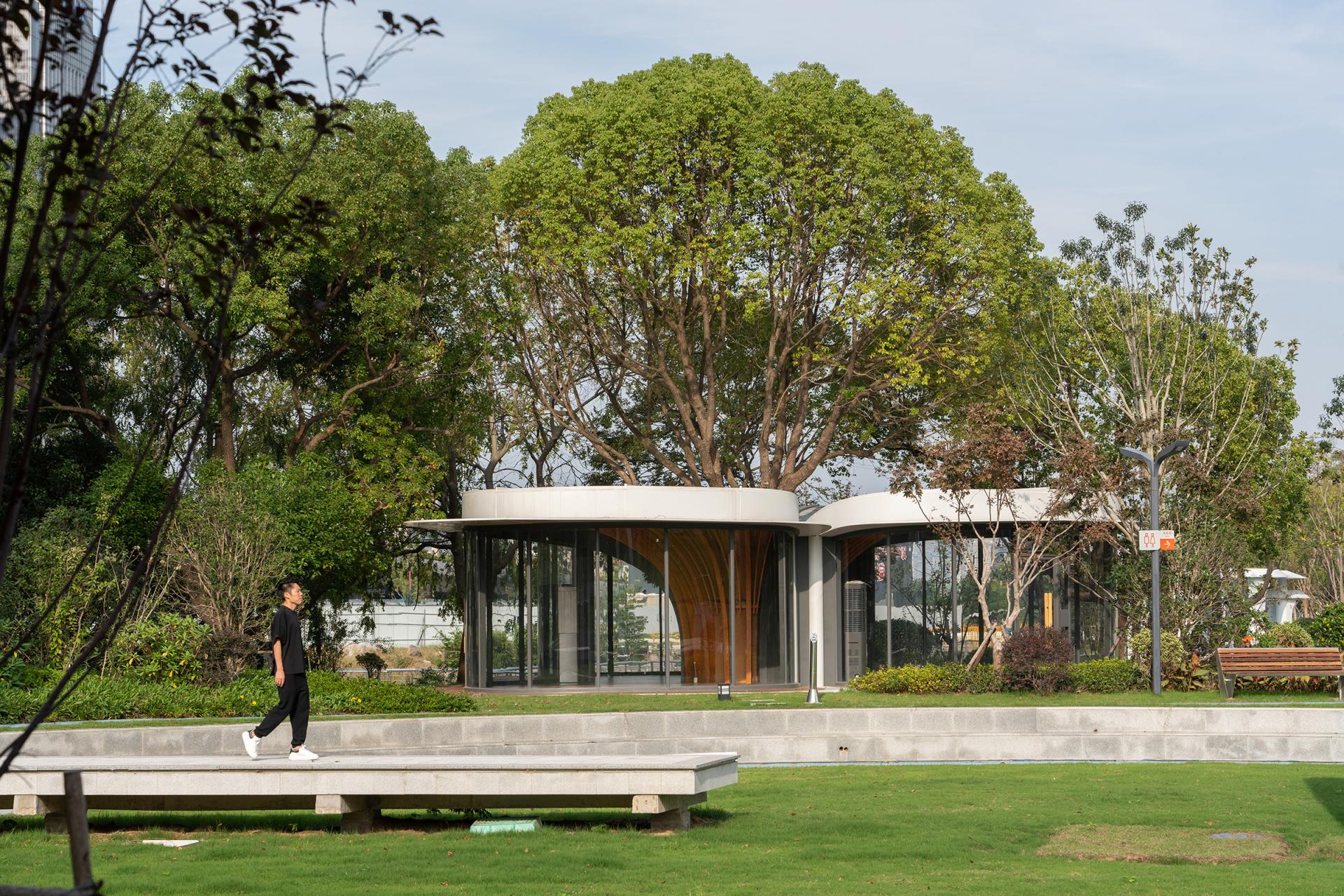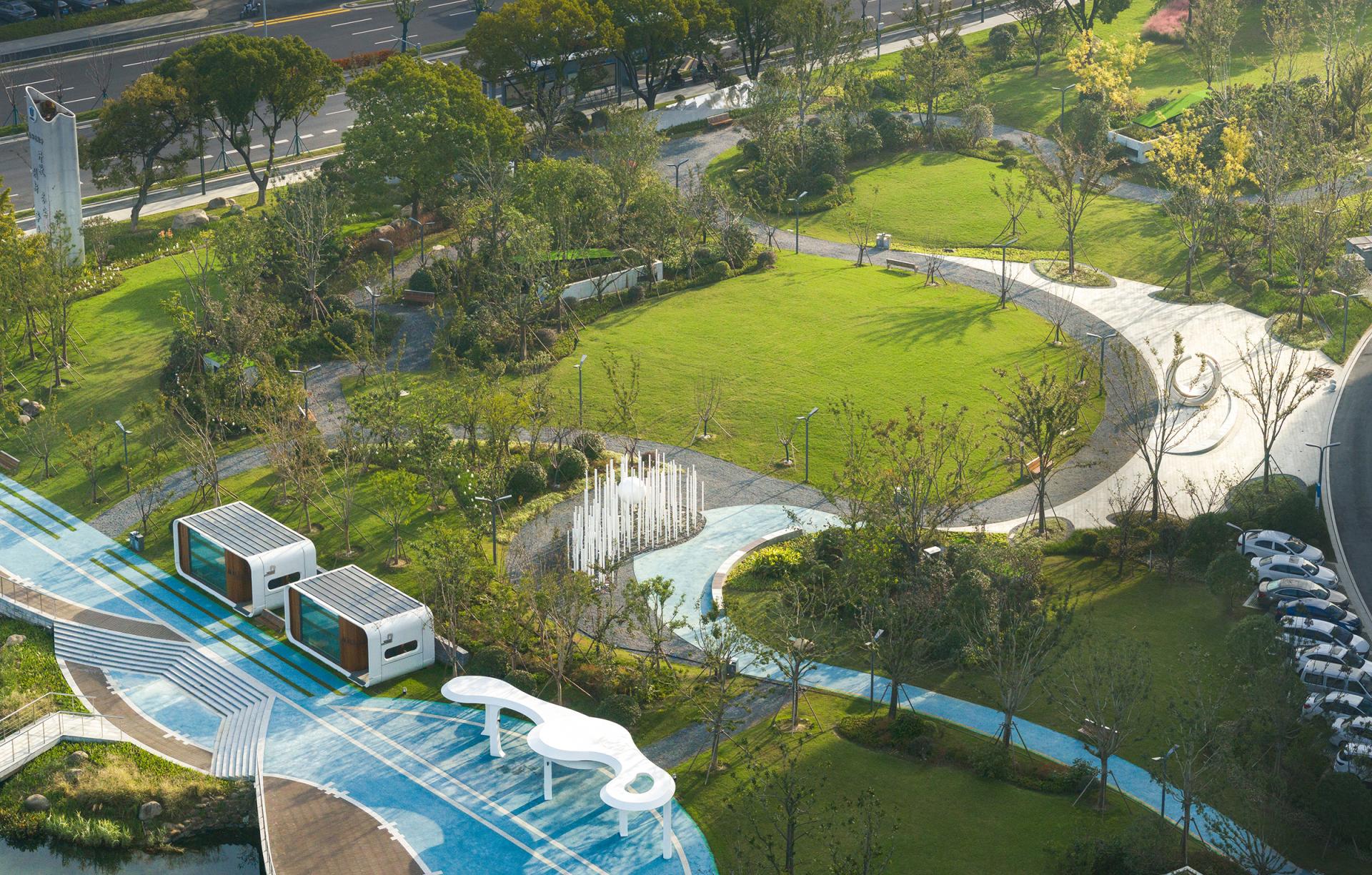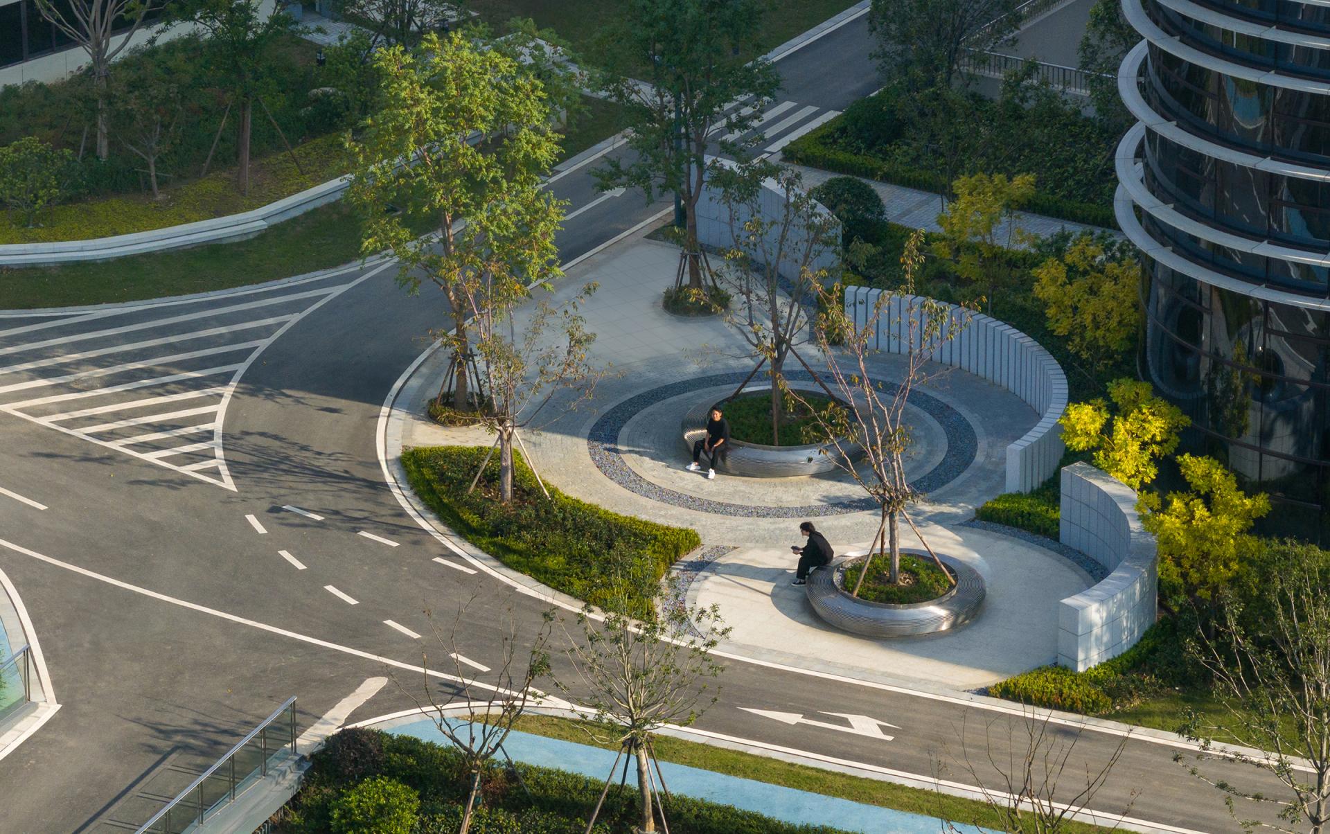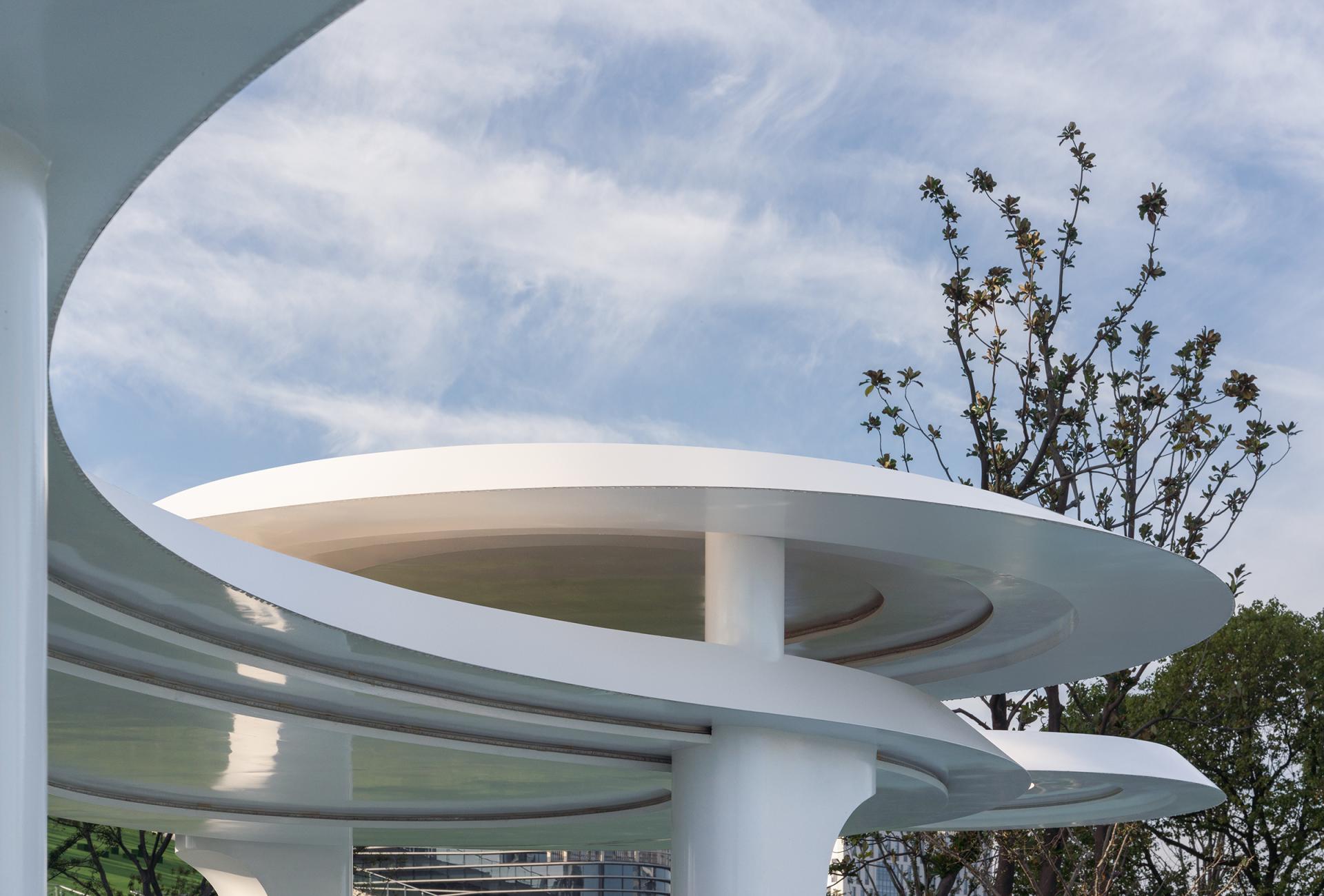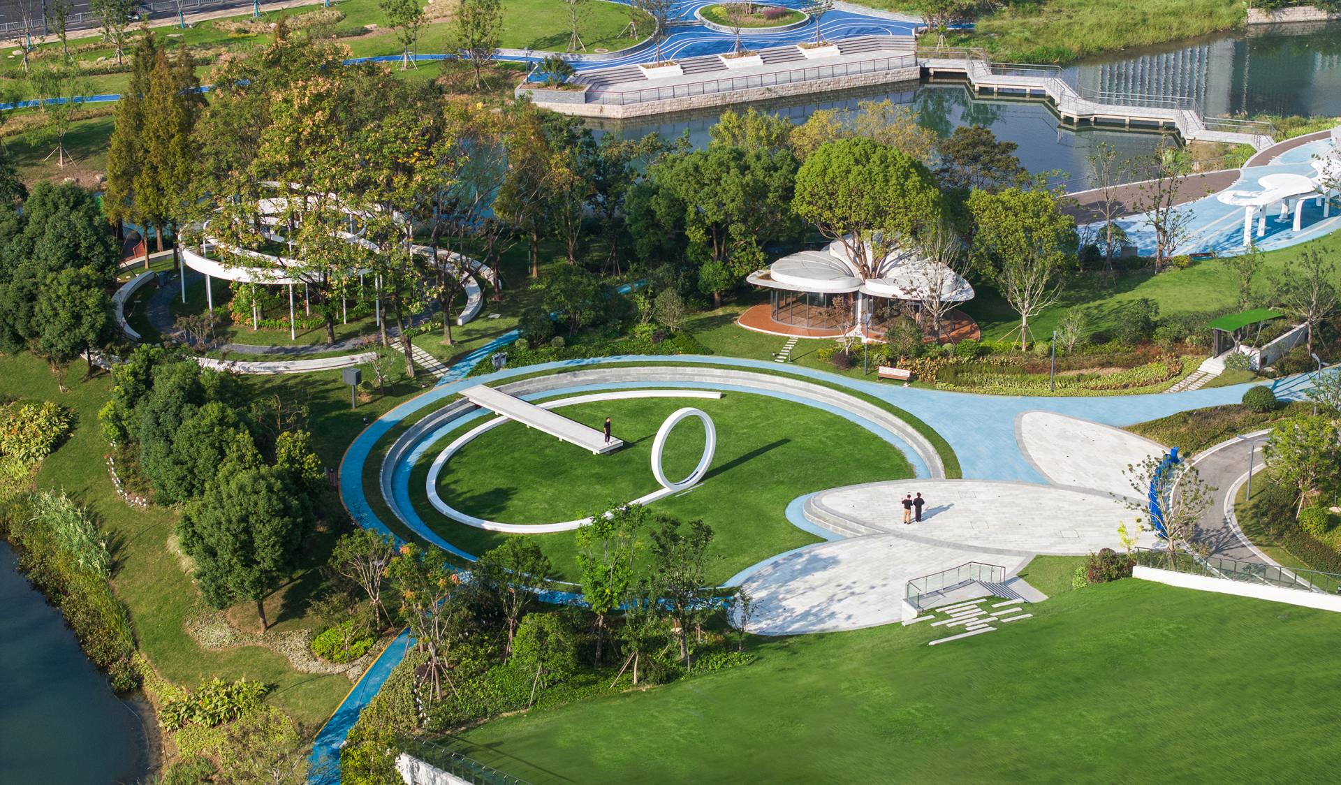 The Haier (Wuxi) iot Ecological Network Demonstration Base is situated in the core area of the Southern Jiangsu Independent Innovation Demonstration Zone. We envision Haiguanzhigu Technology Park as a place to document the passage of time, capturing the city’s development and transformation. It is a space where everyone can not only experience innovative design but also feel the unique charm of Wuxi.The design draws inspiration from Wuxi’s historical and cultural heritage as well as its modern development, encapsulating the concept of “Recalling the Past, Reflecting the Present, Envisioning the Future.” With a narrative thread of "Memory–Continuity–Transition–Fusion," the design invites participants to embark on a journey through the city’s evolving story.The design retains the original site’s ecological features, incorporating natural growth patterns into the landscape. Existing water systems and pine forests are preserved, allowing nature to seamlessly coexist with the city. Paying homage to Wuxi’s historic textile industry, the design employs sculptural weaving and sequential patterns to create dynamic, flowing elements that integrate the spirit of traditional crafts into the modern era. Illuminated mist and dynamic light effects enhance the interactive experience of the installations at night. The design features three circular platforms symbolizing the interconnectedness of all things and the infinite evolution of wisdom, technology, and aspirations for a better life. A suspended bridge connects two circular platforms, leading to the main building—both narrating history and guiding visitors toward the future. A grass-stepped amphitheater below creates a cohesive green core for the park. At its center, the "Technology Ring" acts as a symbolic focal point, transforming memory into a tangible landmark and a new icon.At night, holographic projections on the circular platforms tell the story of Wuxi’s rich culture. A small pine forest and a set of "spiral rings" form the core elements of this design. By preserving the existing pine trees and allowing visitors to freely explore beneath them, the design bridges the visual gap between the pines and the park’s small hills. The spiral rings weave through the trees, creating a sense of convergence, drawing energy and visitors, and leaving a memorable visual and spatial experience.