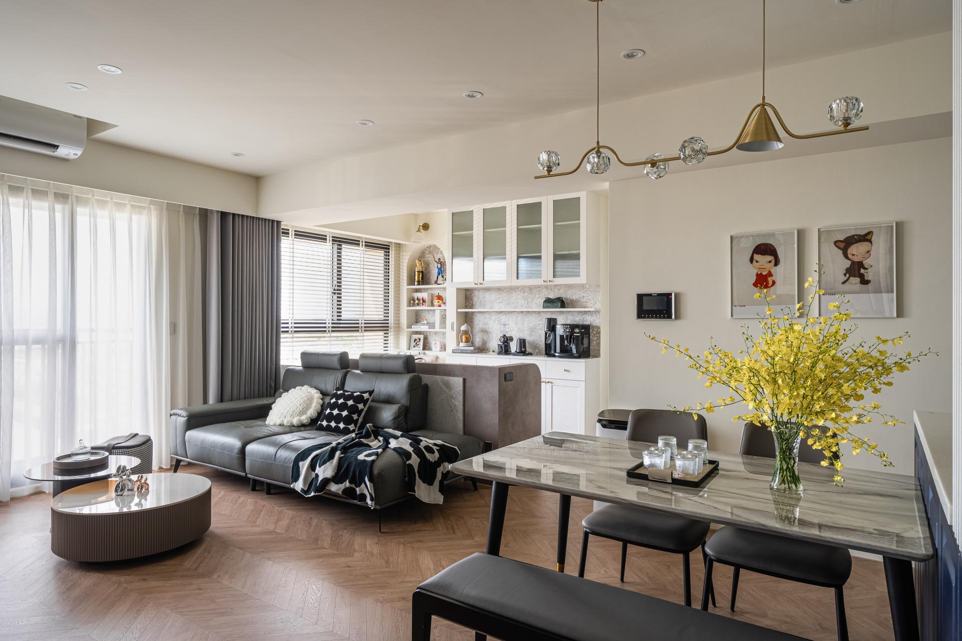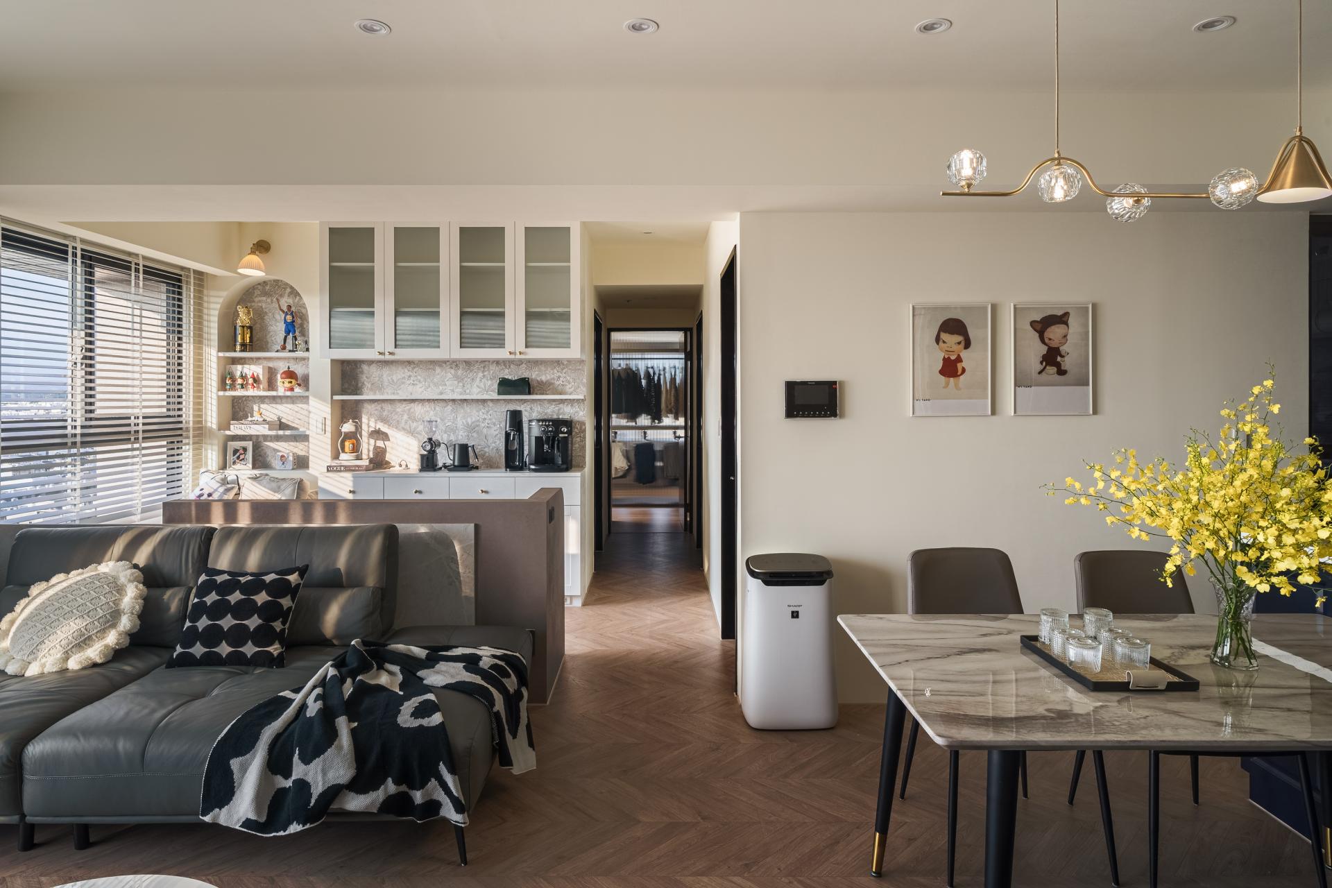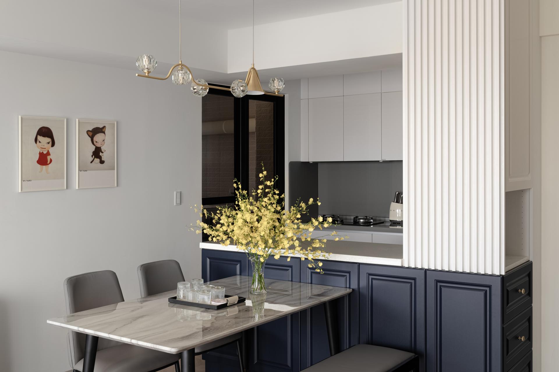 As a design highlight, the island-style kitchen is not only an important corner of cooking and meal preparation, but also the core field of family interaction. The design also uses cream white and indigo color to create the elegance of the interior, and adds exquisite details through the ultra-wear-resistant fishbone flooring and wire door panels. From the public area to the bedroom, there are large windows in each space, which can keep the whole room bright and open.