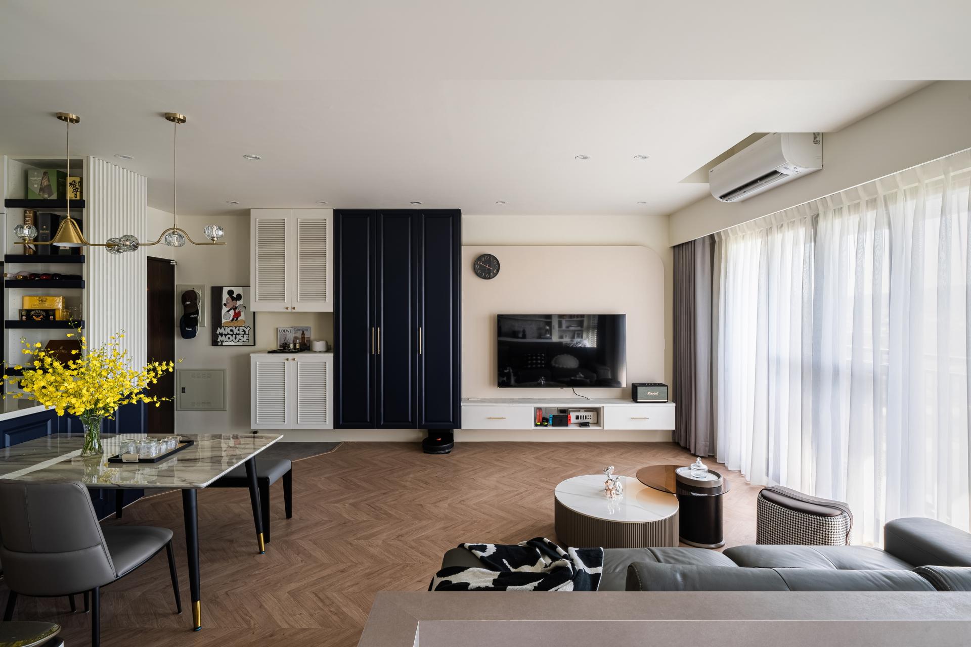 This exotic residence has an open layout and integrated multi-functional design. After the sofa back wall in the living room is removed, it is transformed into a study room and multi-functional space separated by a half wall, making the layout of the public area more transparent and flexible. While the main wall of the living room is extended by white and indigo storage cabinets in the entrance hall, and then connected in series by the arc TV wall decorated with indirect linear light sources. The continuous hanging cabinet can not only be used as the home of a sweeping robot, but also convenient for daily cleaning, with rich beauty and powerful functions.