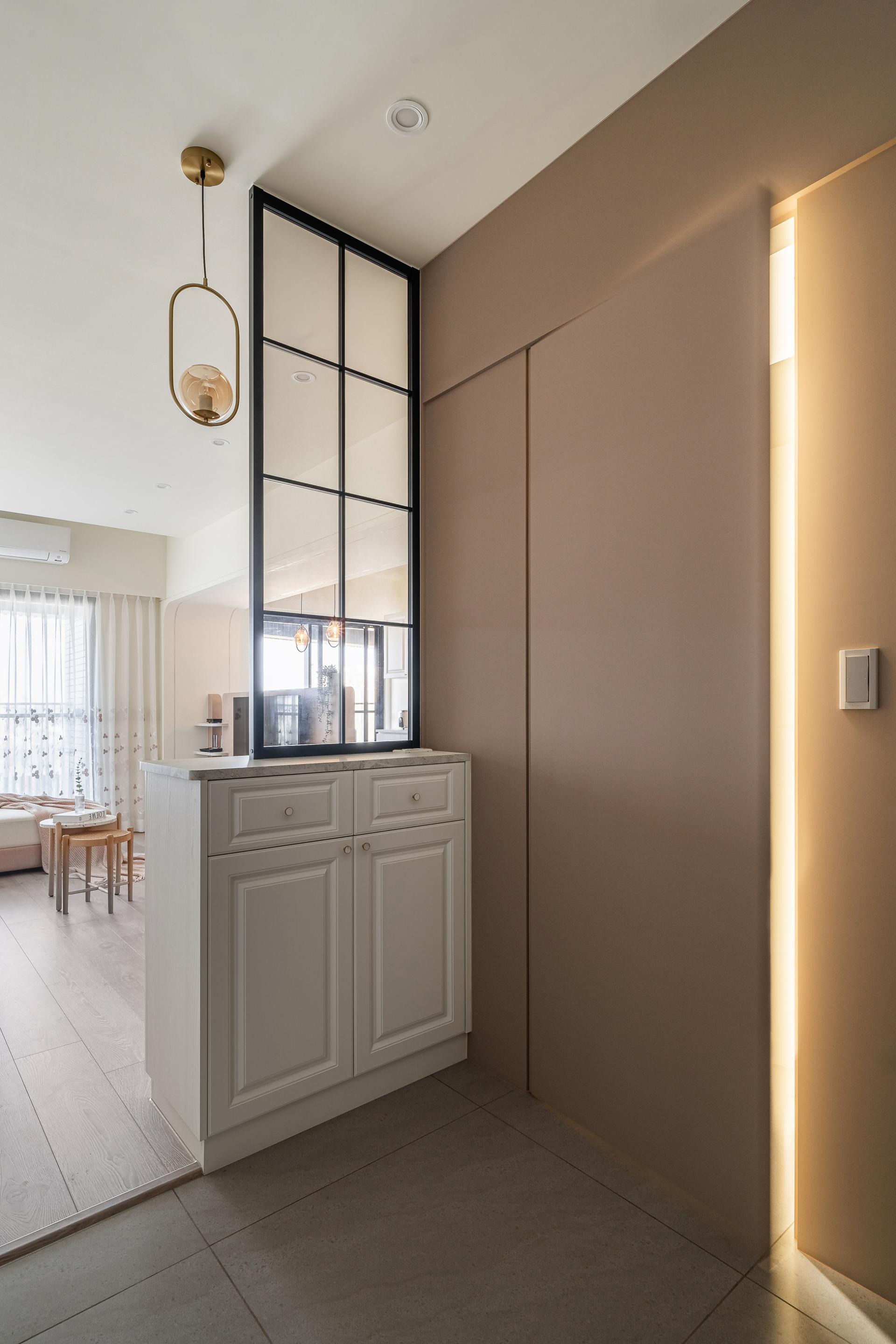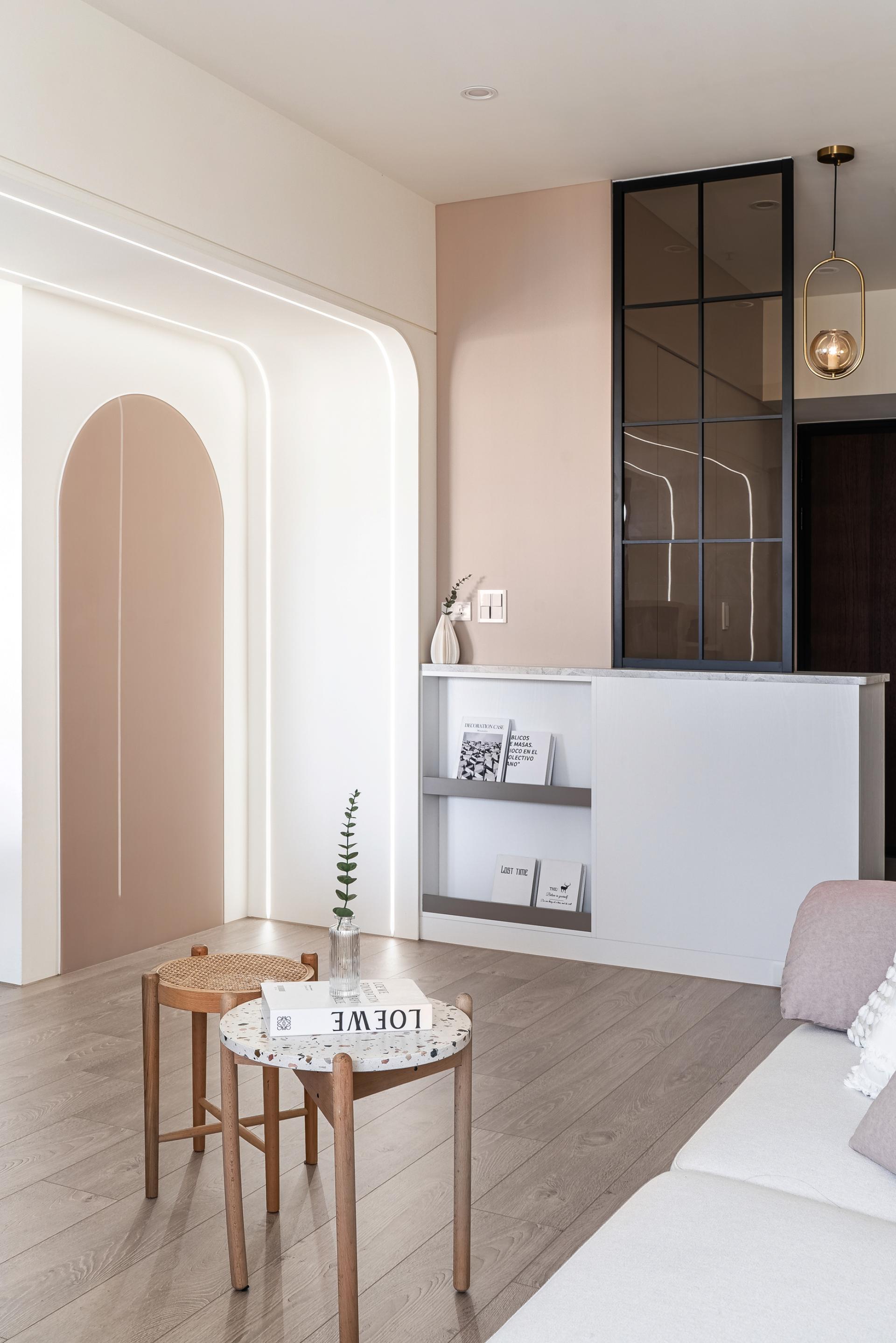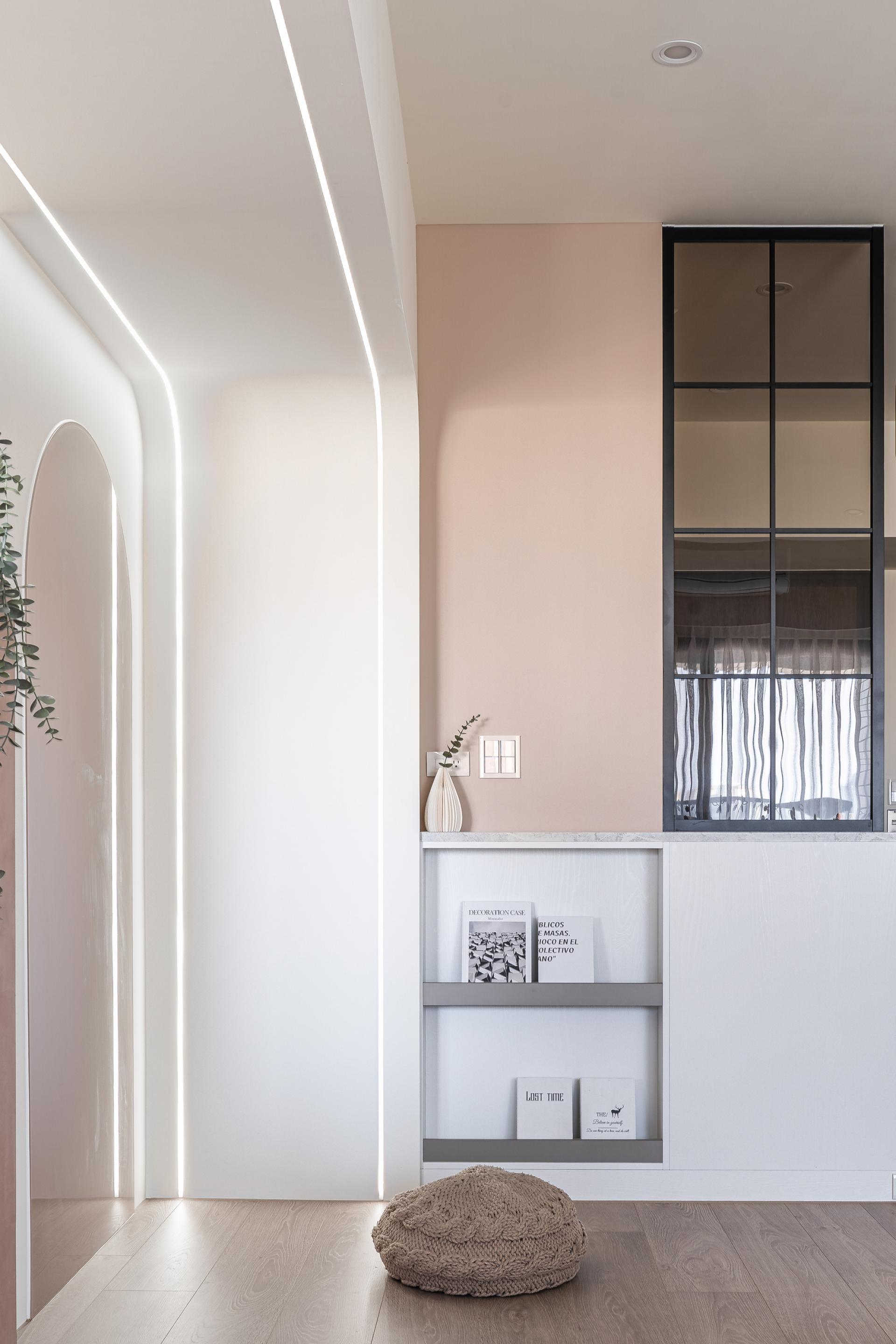 The overall space is interwoven with pink and milk tea colors, and embellished with wood grain and iron details, giving the residence a natural warm texture. The entryway is considerate of the use of elders, set up a shoe chair, and combined with iron glass screens, cleverly resolving the bad feng shui of opening door and seeing the window, while allowing the light to penetrate, to create a bright and comfortable home scene. The right side of the entrance hides the storage room through the neat door plate, which not only increases the storage function and maintains the simplicity of the space, but also does not affect the fluidity of the moving line.