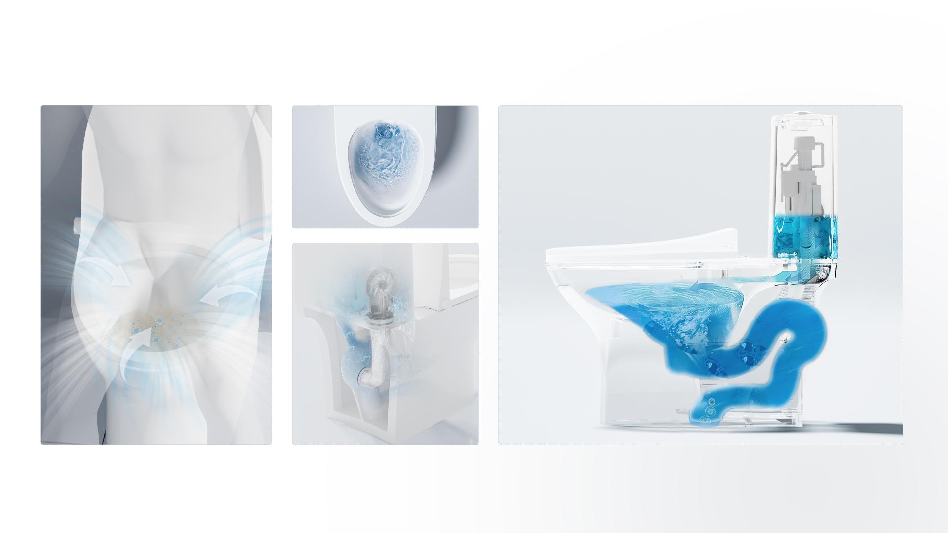 According to test results, the device achieves over 99% odor elimination within 5.8 seconds, rapidly clearing odors generated during use. The core submersible extraction and drainage system, using water-powered driving technology, opens and closes the shared gas-water channel valve within 0.9 seconds, ensuring efficient separation of air extraction and drainage to prevent odor backflow and maintain a clean waste discharge. Utilizing an O3 module, it generates sterilizing gas on-site, which combines with water through a unique gas-water mixing structure to form a disinfecting solution. This technology enables comprehensive sterilization, achieving a bacteria elimination rate of over 99% within 10 seconds to secure users' sanitary safety.