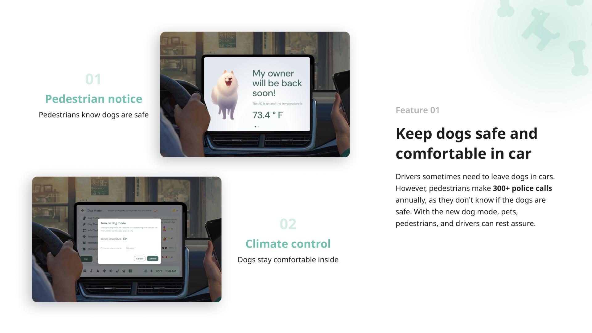 Leaving dogs in cars can pose risks, such as heatstroke or well-meaning passersby calling the police. Dog Mode addresses these issues by combining safety, comfort, and emotional connection between pets and their owners.