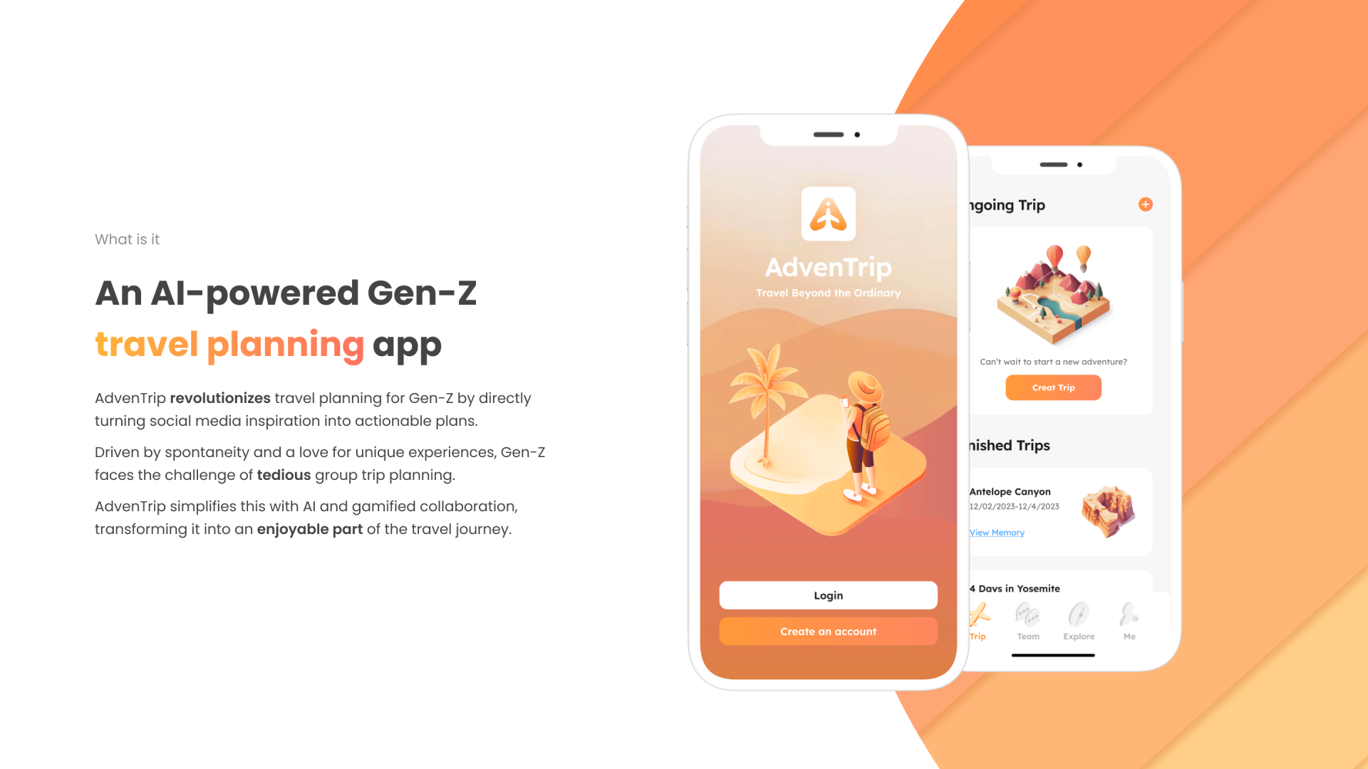 The core idea behind AdvenTrip is to revolutionize the travel planning experience for Gen-Z by combining the influence of social media with AI-powered customization. Gen-Z travelers are driven by spontaneity, social inspiration, and a desire for unique, off-the-beaten-path experiences. AdvenTrip bridges the gap between discovering travel inspiration online and transforming it into actionable, collaborative plans with ease.