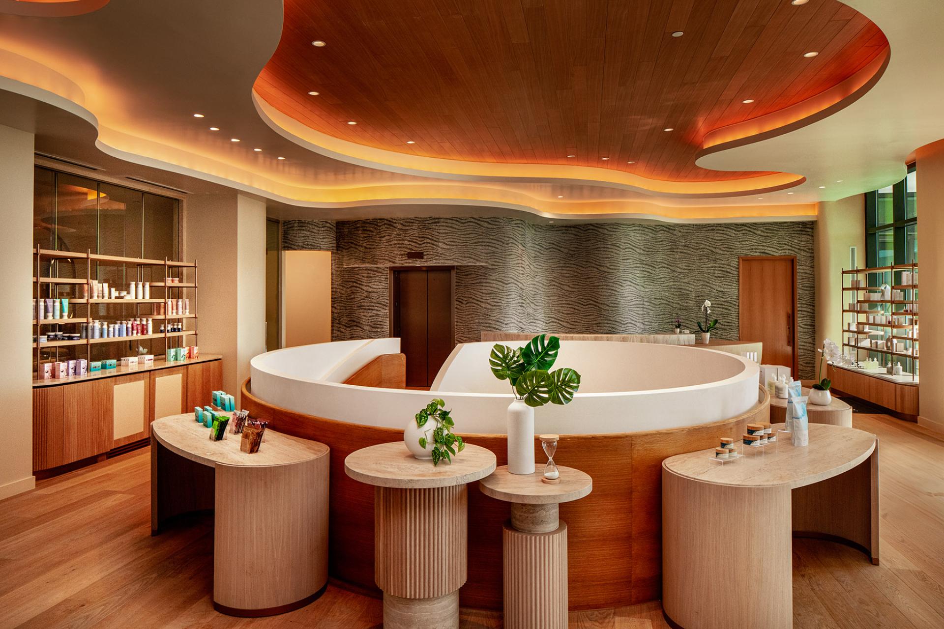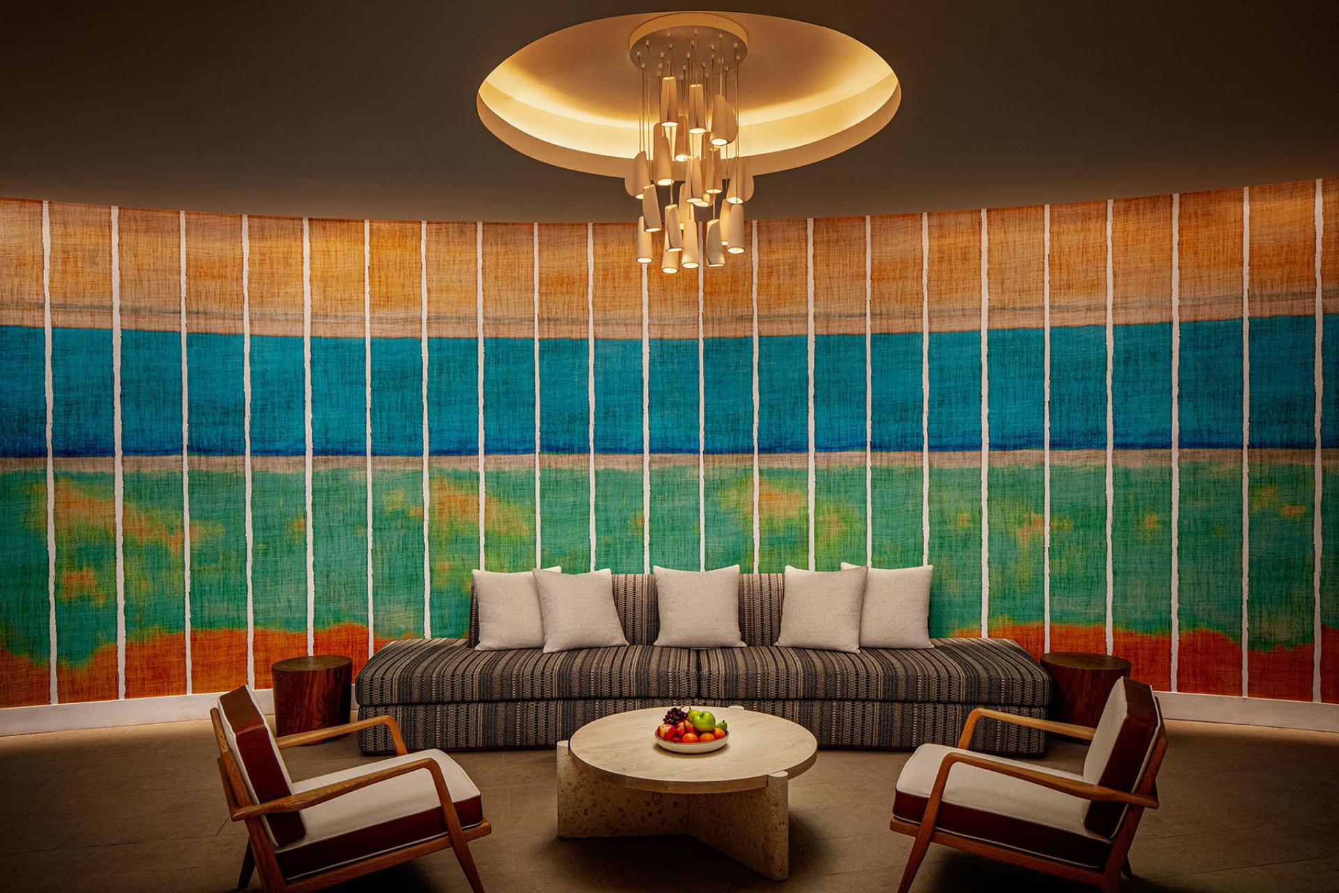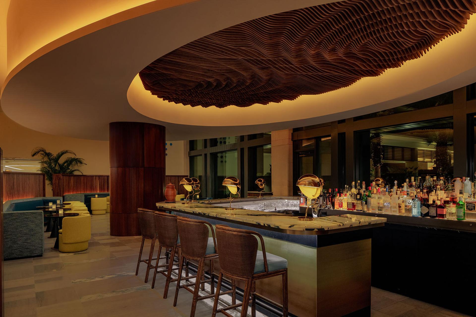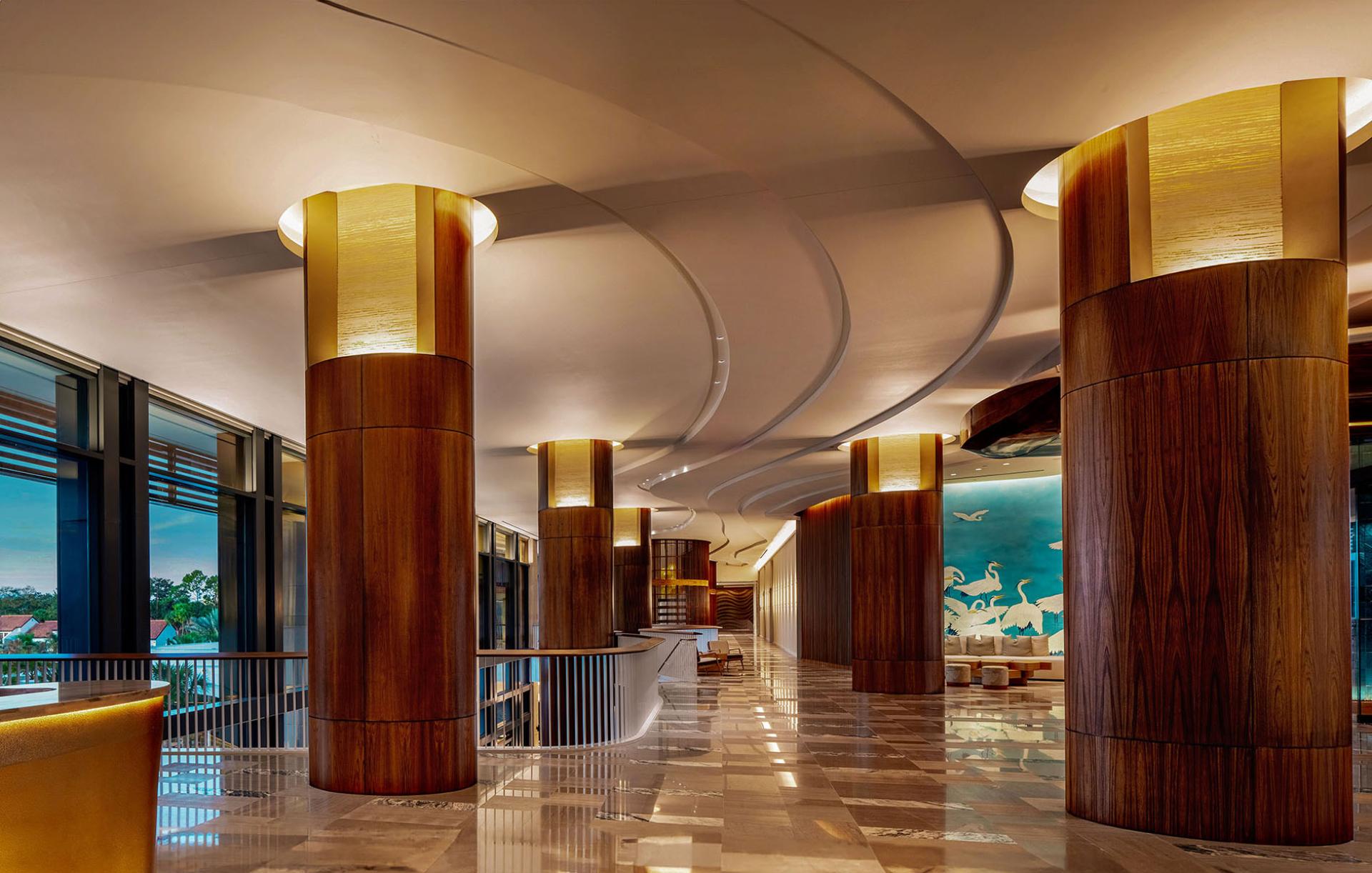 The hotel, perched on a 12 acre lagoon, has water as its central theme. The undulating multilevel ceilings, wood features and blue accents throughout imagine the organic nature of water and maritime craft. The lagoon’s curves, visible out of almost every public window, are translated in ceilings, balustrades, stairs, bars, atriums, furniture, artwork and finish patterns. The architectural lighting that follows and celebrates these elements highlights the flowing softness of the interiors. As night falls, the evening mood begins dimming and warming to a soft, golden incandescent ambience that transforms the spaces into luxurious, comfortable and romantic venues and circulation. Architectural uplighting and indirect sources are concealed in coves, columns, walls, mullions and wainscot in a creative and subtle approach to avoid downlighting and create a unique experience for the guest immersed in voluminous, organic spaces that inspire awe. The ability to have cleaner ceilings and the challenge of lighting with minimal downward sources still allowed us to meet wattage allowances, even using all warm-dimming sources for an unparalleled hospitality experience.