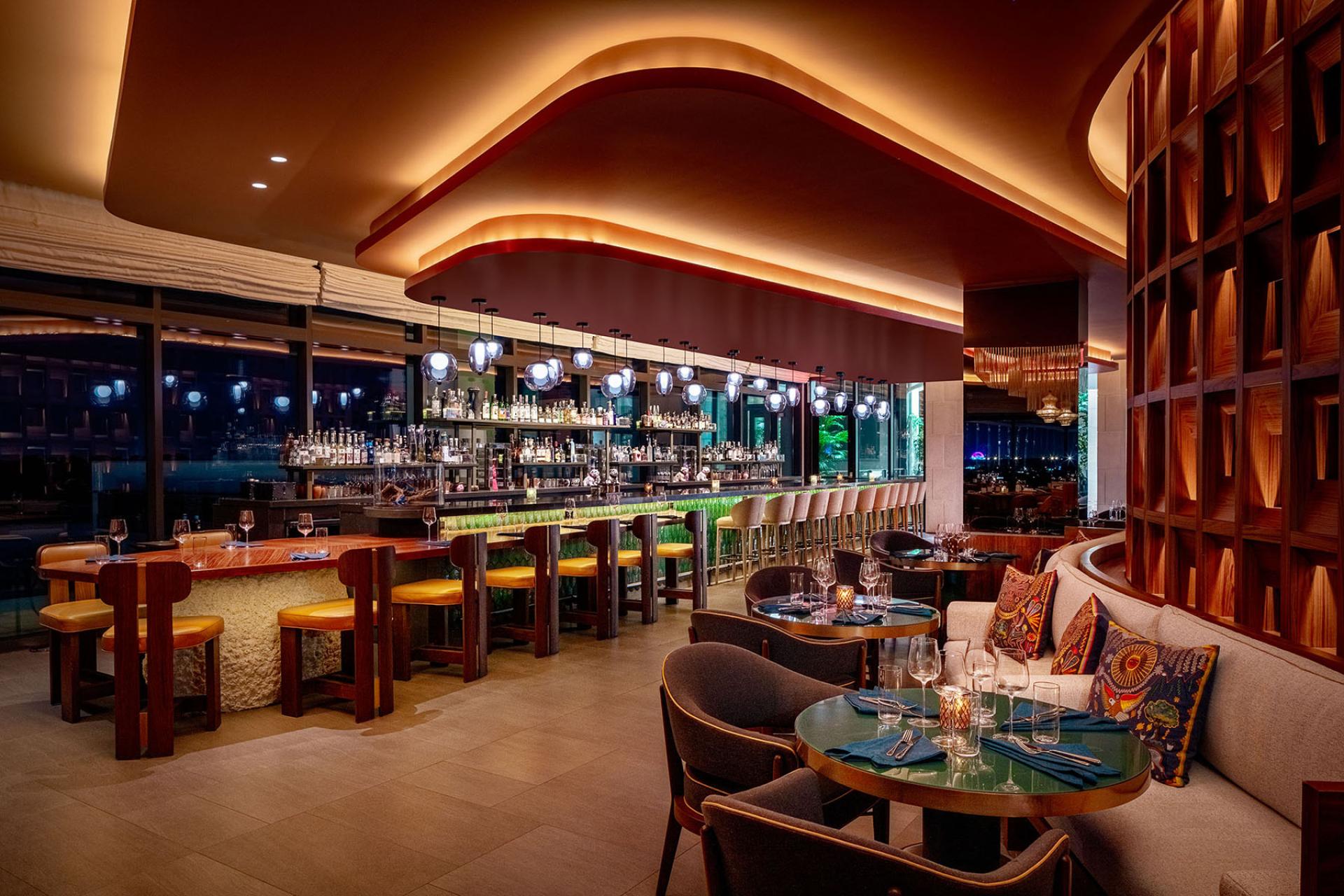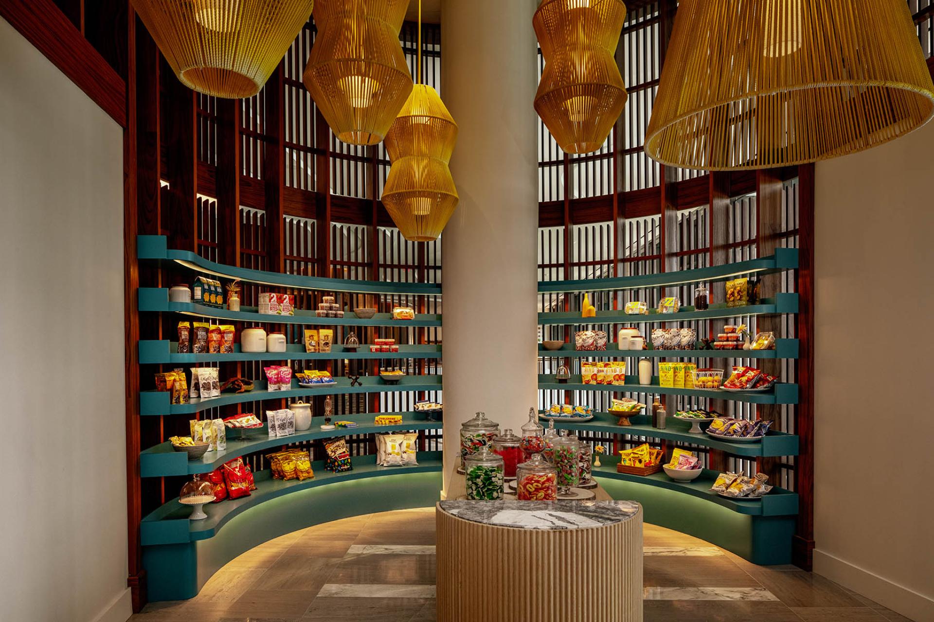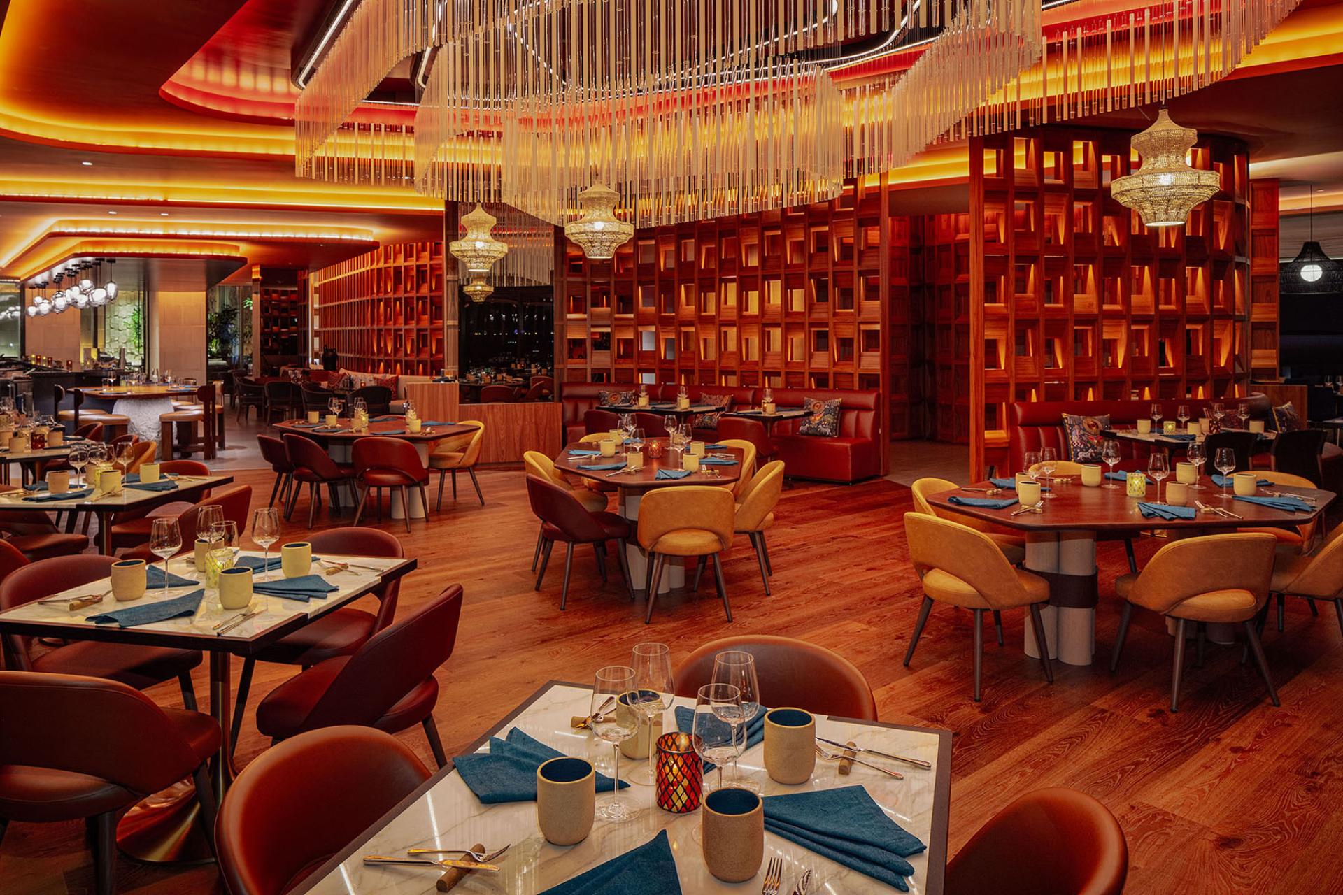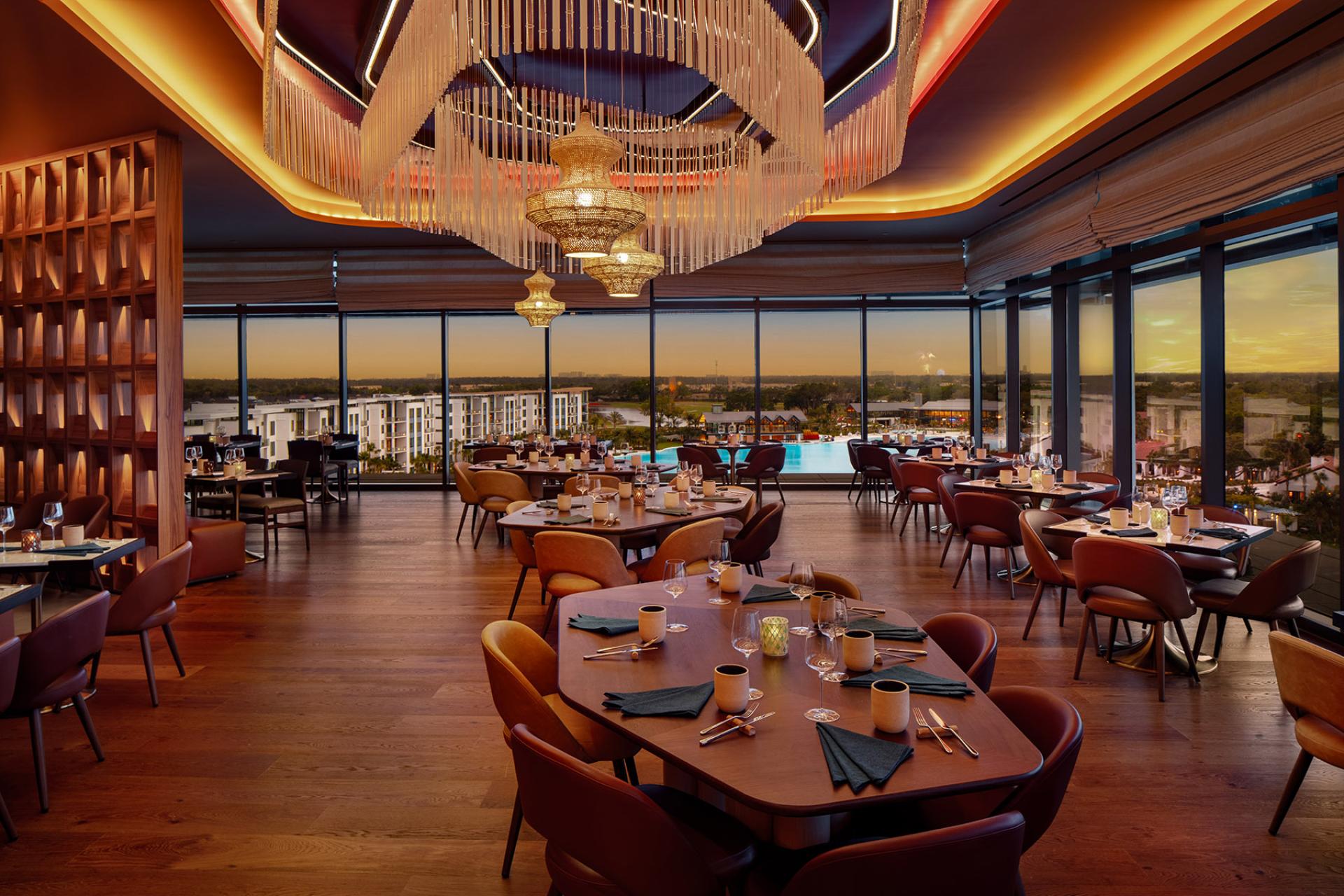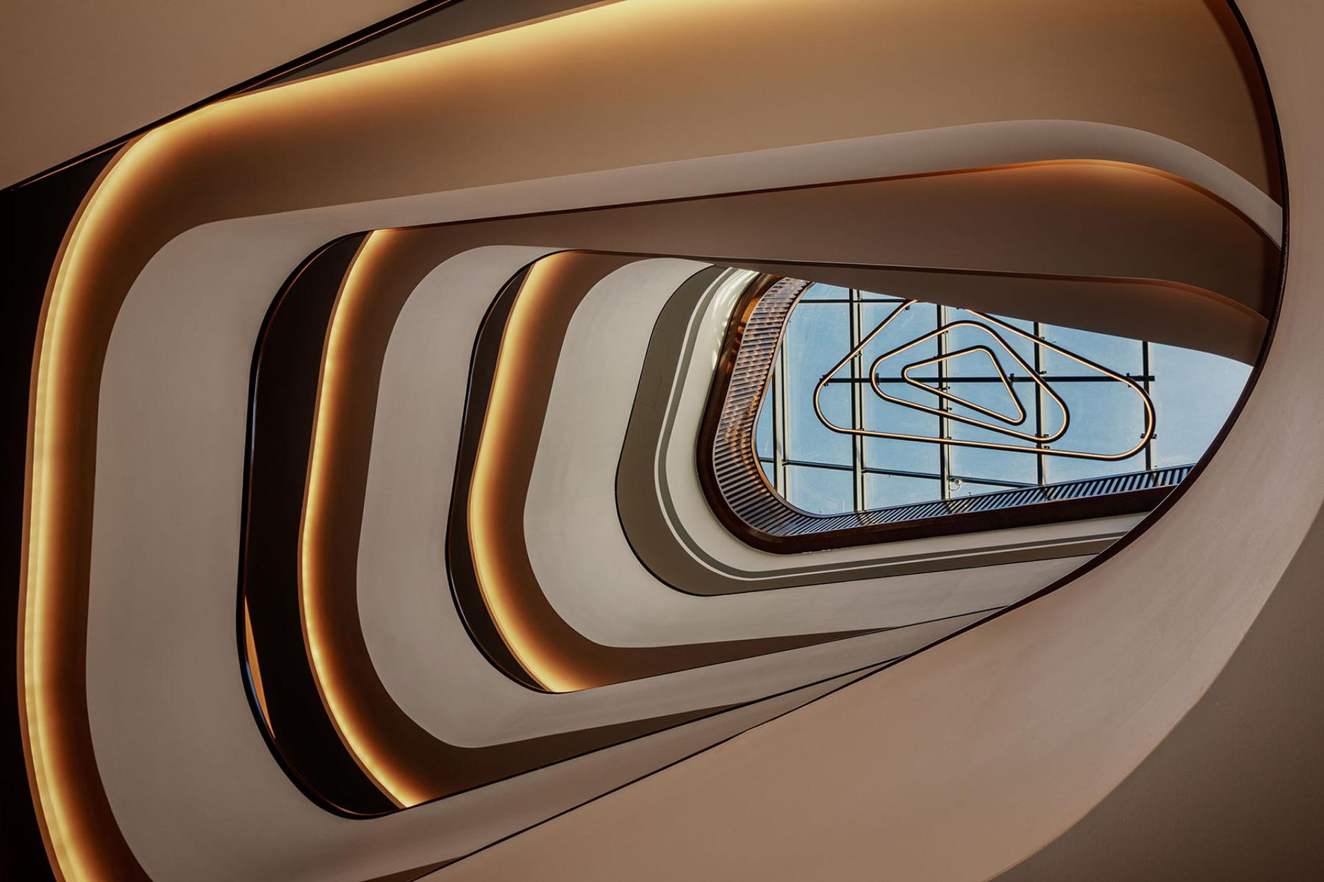 The hotel, perched on a 12 acre lagoon, has water as its central theme. The undulating multilevel ceilings, wood features and blue accents throughout imagine the organic nature of water and maritime craft. The lagoon’s curves, visible out of almost every public window, are translated in ceilings, balustrades, stairs, bars, atriums, furniture, artwork and finish patterns. The architectural lighting that follows and celebrates these elements highlights the flowing softness of the interiors. As night falls, the evening mood begins dimming and warming to a soft, golden incandescent ambience that transforms the spaces into luxurious, comfortable and romantic venues and circulation. Architectural uplighting and indirect sources are concealed in coves, columns, walls, mullions and wainscot in a creative and subtle approach to avoid downlighting and create a unique experience for the guest immersed in voluminous, organic spaces that inspire awe. The ability to have cleaner ceilings and the challenge of lighting with minimal downward sources still allowed us to meet wattage allowances, even using all warm-dimming sources for an unparalleled hospitality experience.